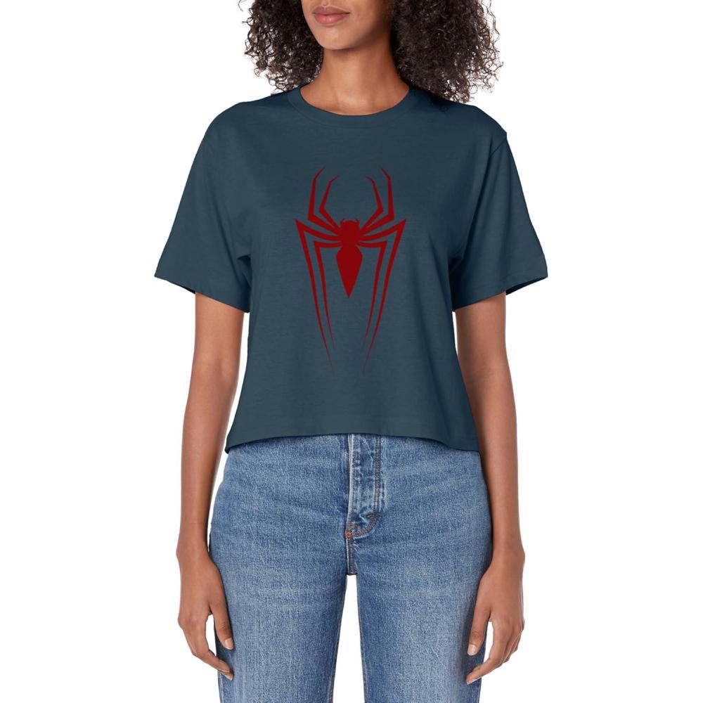 Marvel Comics Retro Classic Spider-Man Red Spider Logo Women’s Crop Top(Dark Blue)