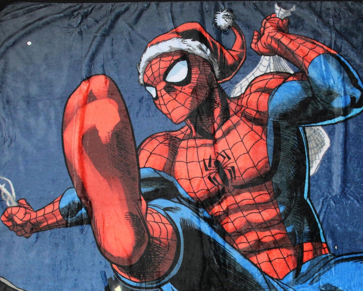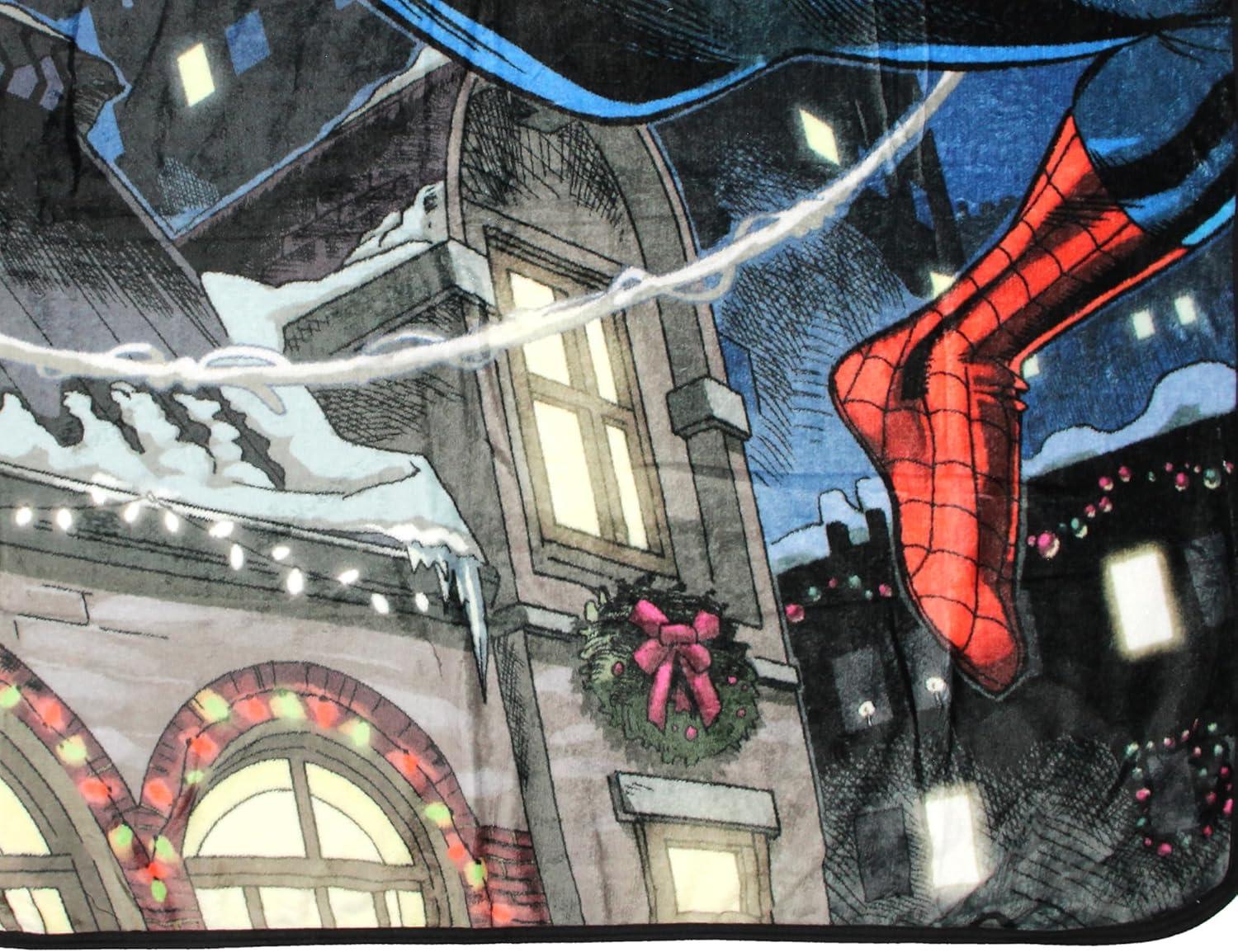Wrap yourself in cozy comfort with this ultra-soft Marvel Comics throw blanket featuring Spider-Man! This fleece throw blanket features a fun action-packed graphic of your friendly neighborhood Spider-Man in action, sporting a Santa hat and swinging through New York City with a web-made bag. The city homes are festively decorated with wreaths and lights, their rooftops dusted with snow. This throw blanket is made from 100% polyester and is great for snuggling during movie nights or adding a fun, festive touch to your home decor. This throw blanket is an excellent gift for Marvel Comics or Spider-Man fans; this fleece throw blanket makes a great gift for Christmas, birthdays, or anniversaries. MANUFACTURER RECOMMENDED AGE: NOT FOR CHILDREN 3 YEARS AND UP