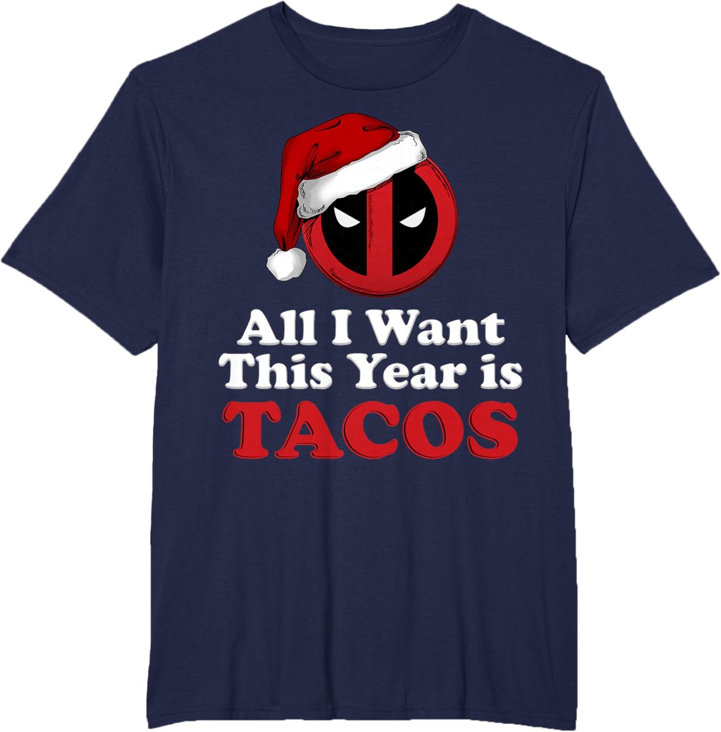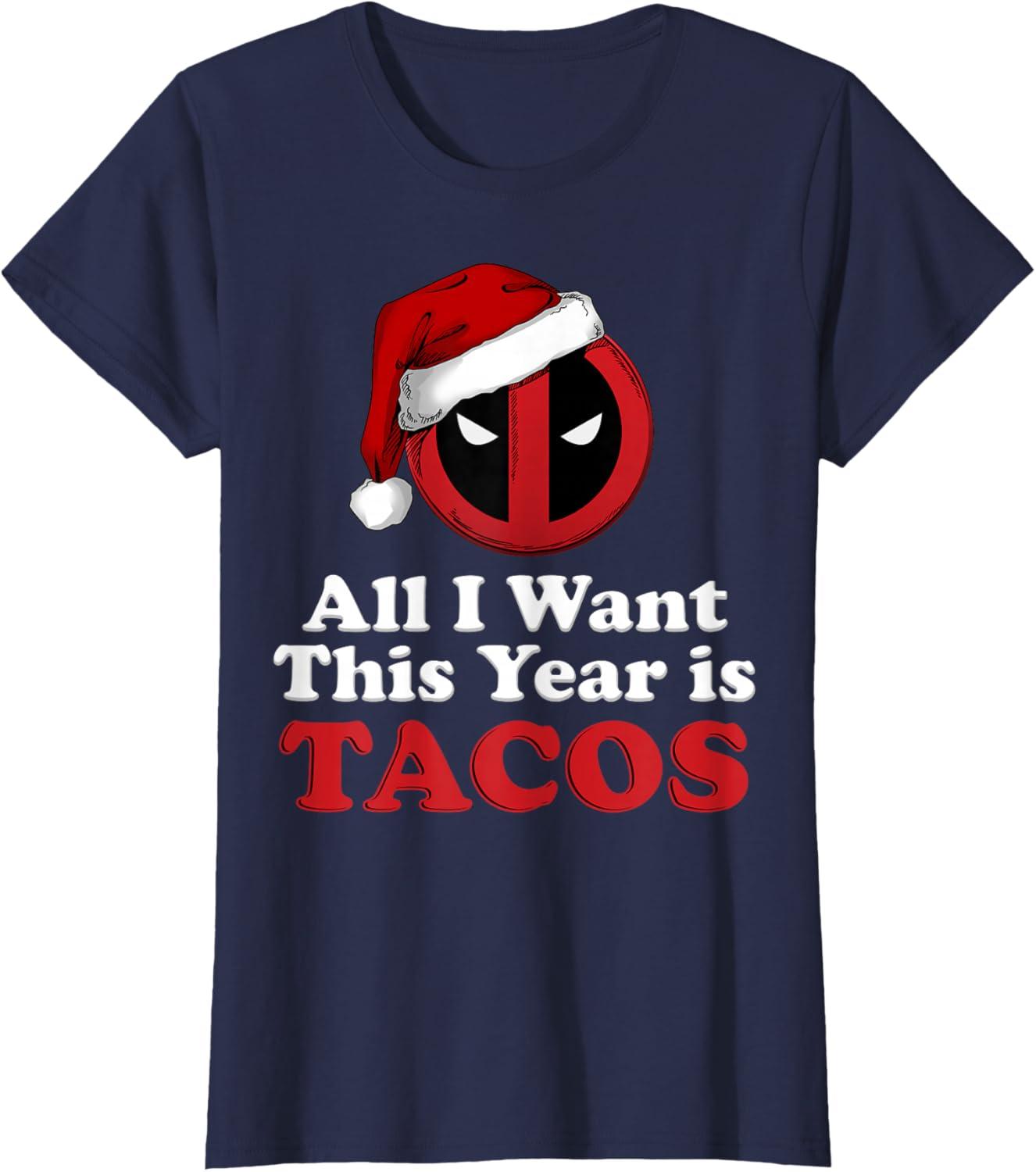 Marvel Deadpool I Want Tacos For Christmas Graphic T-Shirt(Navy Blue)