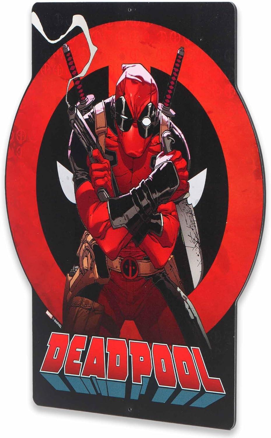 Fun Vintage Sign: In a striking red and black color scheme, this masterpiece is adorned with dynamic paint splatter details that echo Deadpool's chaotic style. At the center of it all stands Deadpool himself, arms tightly folded and a mischievous smirk on his face, ready to take on any crazy adventure. Above him, a quote bubble captures Deadpool's fearless attitude with the words, “Let's do this crazy bad thing” for a well-rounded, hilarious-yet-captivating look.