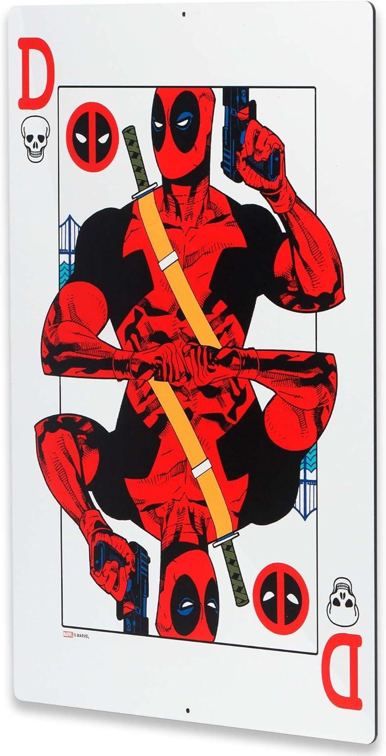 Fun Vintage Sign: In a striking red and black color scheme, this masterpiece is adorned with dynamic paint splatter details that echo Deadpool's chaotic style. At the center of it all stands Deadpool himself, arms tightly folded and a mischievous smirk on his face, ready to take on any crazy adventure. Above him, a quote bubble captures Deadpool's fearless attitude with the words, “Let's do this crazy bad thing” for a well-rounded, hilarious-yet-captivating look.