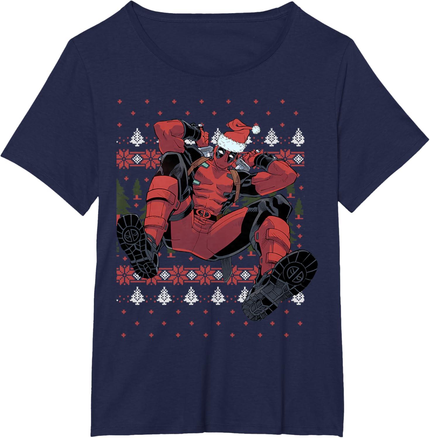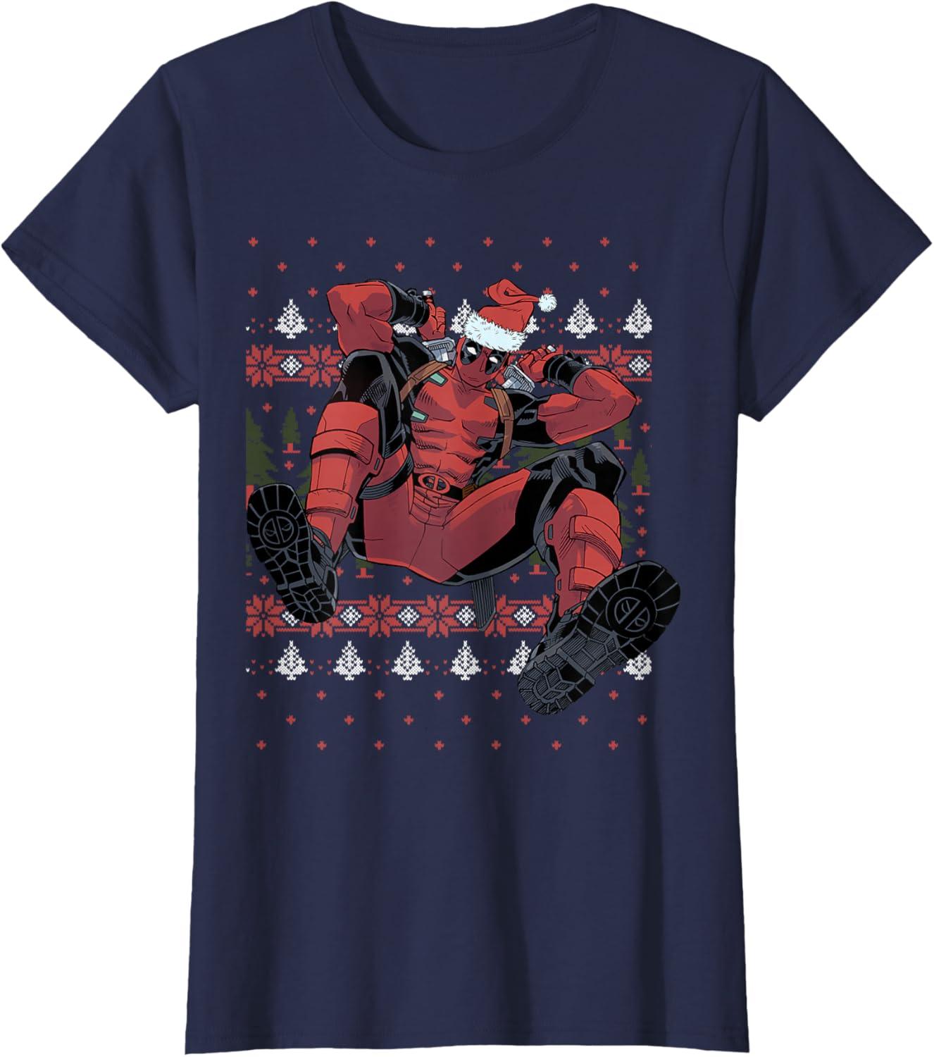 Marvel Deadpool Santa Hat Ugly Sweater Christmas T-Shirt(Navy Blue)