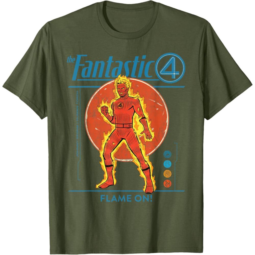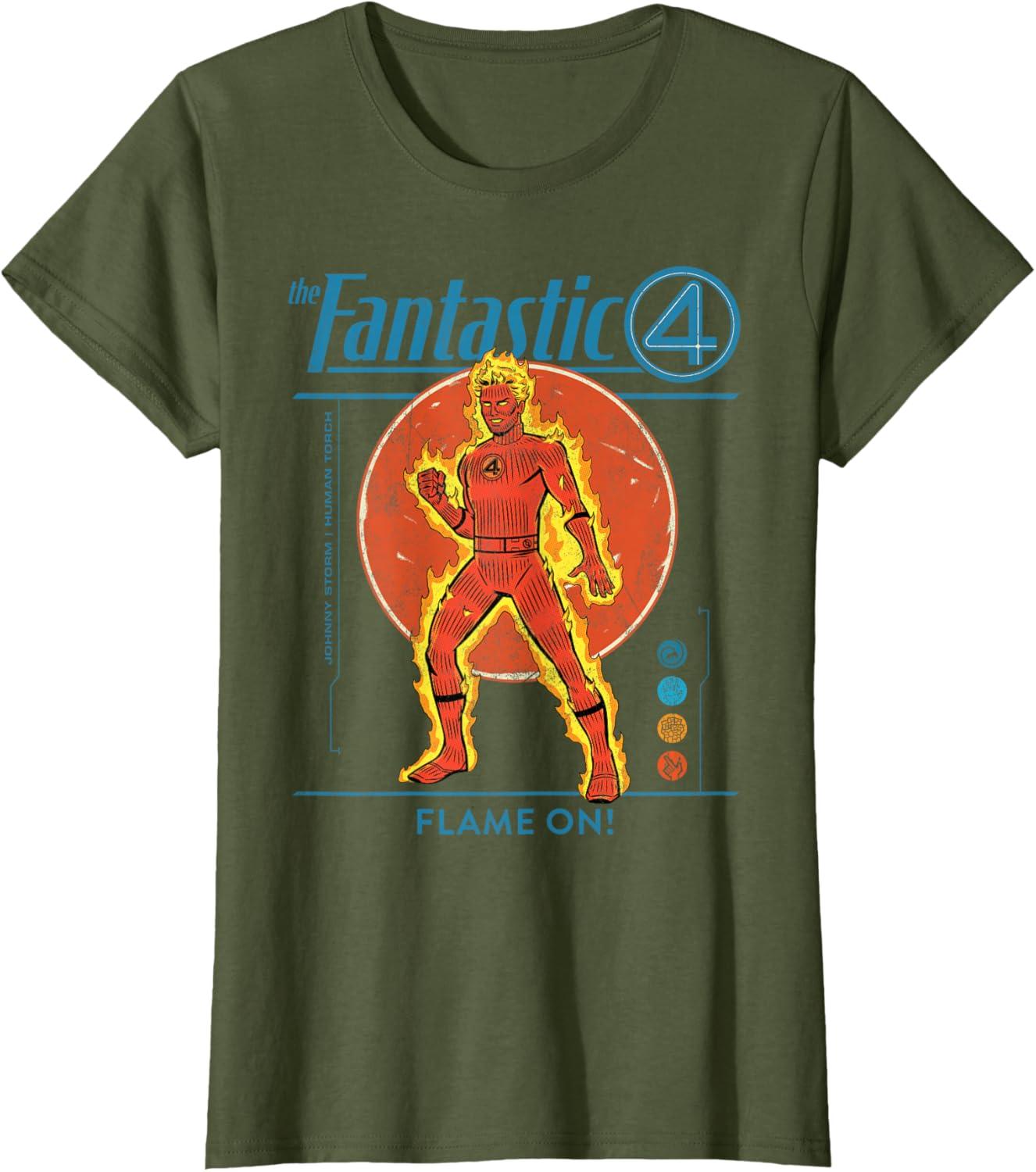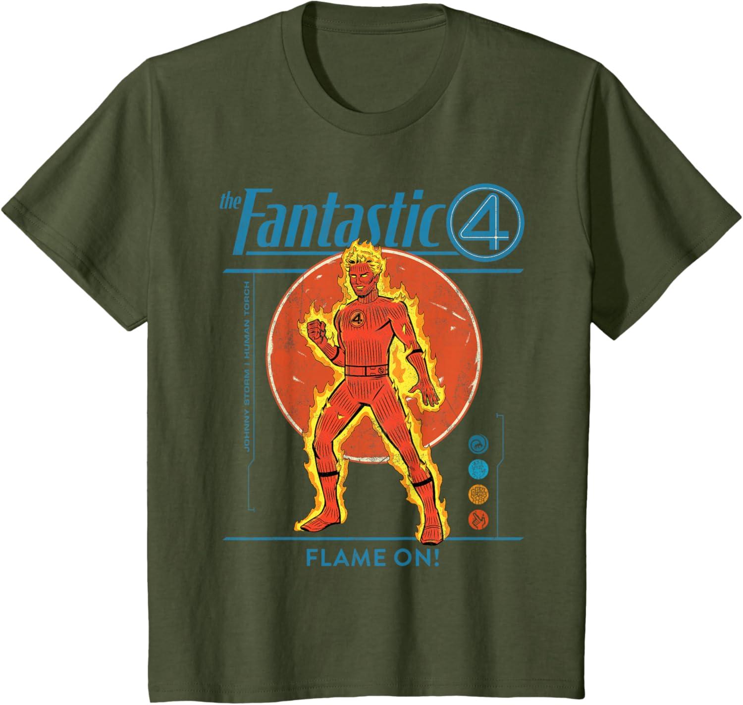 Marvel Superhero Comics design. “Flame On!” with the Human Torch on this official Marvel tee or hoodie from Marvel Studios' blockbuster new movie “The Fantastic Four: First Steps”, featuring a totally retro, 1960s comics style illustration of the fiery Johnny Storm with the iconic movie title logo and a distressed print effect for a fashionably vintage look. A great gift for a Marvel Cinematic Universe (MCU) or Fantastic Four fan! Look for the coordinated retro designs with Reed Richards – Mister Fantastic, Sue Storm — the Invisible Woman, and Ben Grimm — the Thing, and wear matching Sixties Fantastic Four t-shirts with friends and family at your super hero themed party, comic convention, or group trip to Disneyland, Walt Disney World, or Avengers Campus at Disney California Adventure Park. Available in youth and adult sizes. Find it in a t-shirt, premium t-shirt, tank top, v-neck, long sleeve tee, hoodie, and sweatshirt.