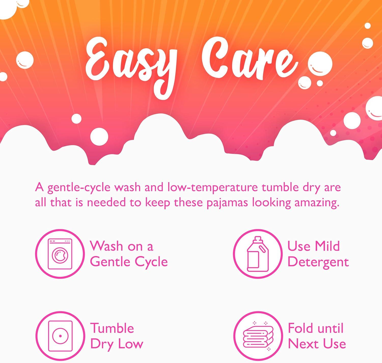 Available in a 4-piece set with matching long-sleeve tops and long pants, these girls’ cotton pajamas are great for summer, winter, fall, and spring wear. They come in a variety of sizes and feature bright, rich colors and fun graphics. These pajamas for kids are made from soft 100% cotton and provide a close, comfortable fit. For the best results, wash them on a gentle cycle and tumble dry them on low.