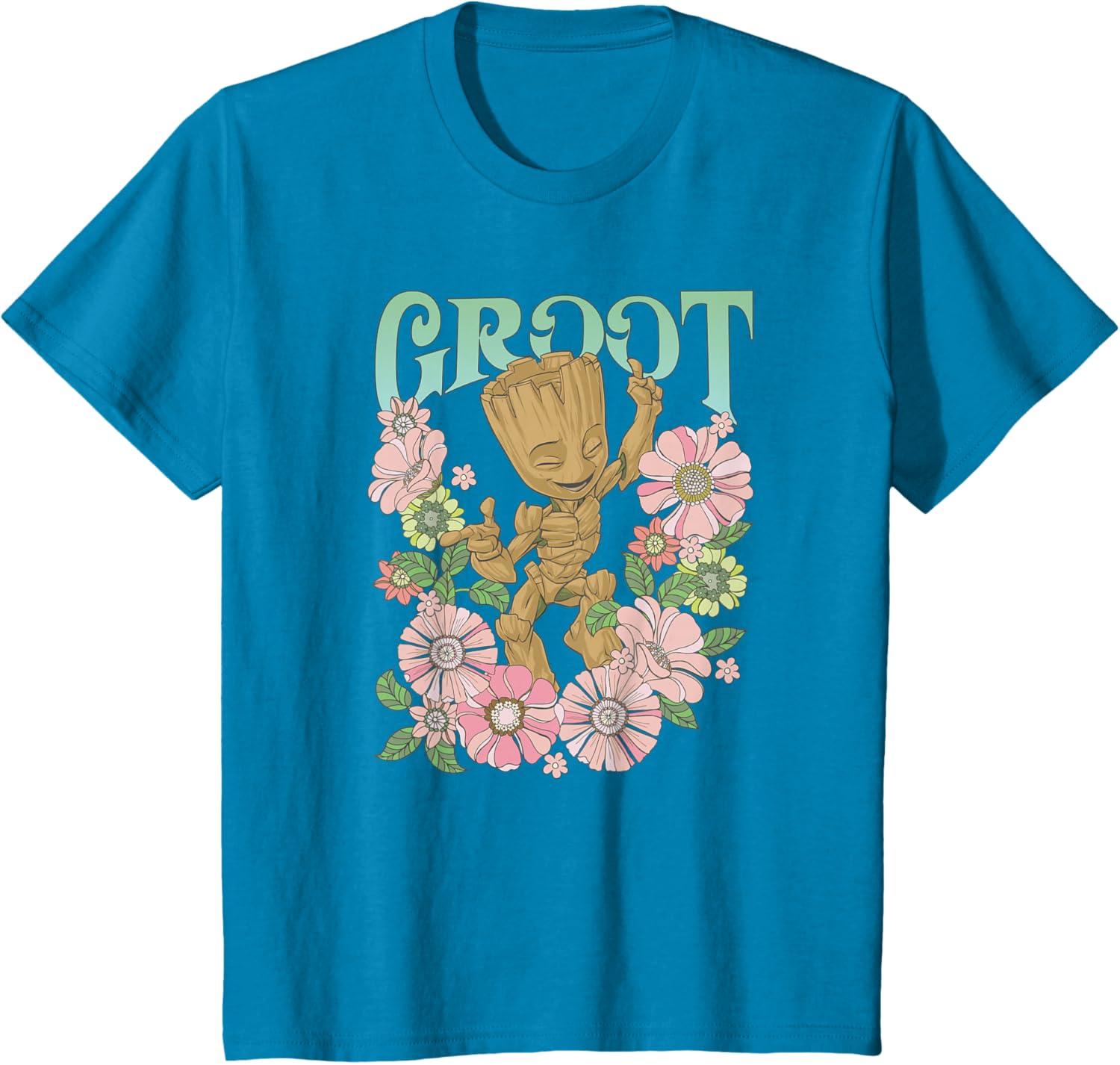 Marvel Guardians Of The Galaxy Groot Floral Dance Poster T-Shirt(Sapphire Blue)