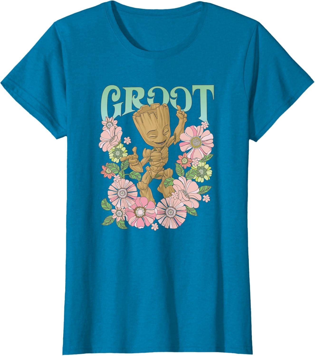 Marvel Guardians Of The Galaxy Groot Floral Dance Poster T-Shirt(Heather Blue)