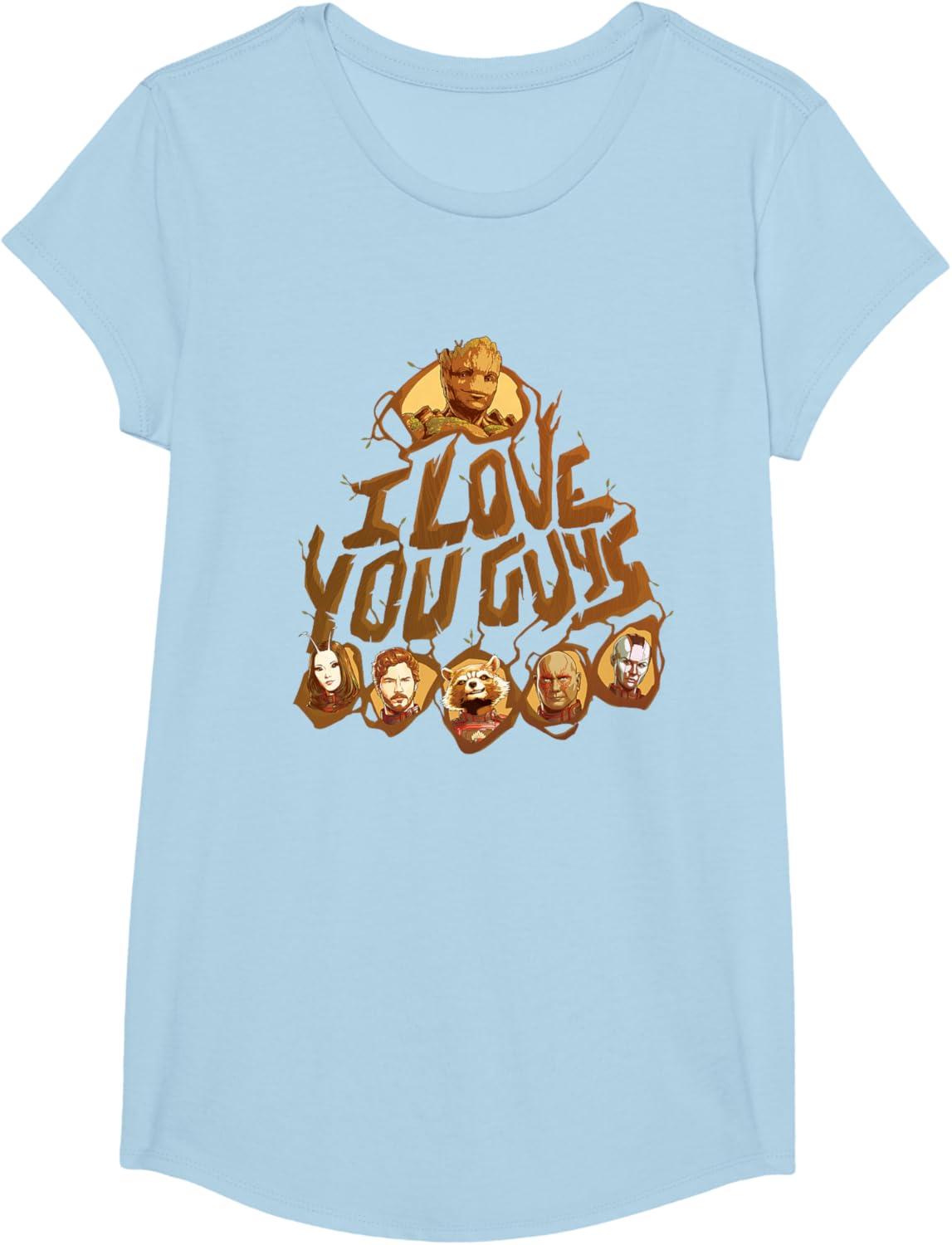 “I Love You Guys.” When you spend enough time with Groot, you begin to understand his words. From one of the most memorable scenes in Marvel Studios’ blockbuster “Guardians of the Galaxy Volume 3” movie sequel, this official tee or hoodie features Groot at the top with teammates Mantis, Peter Quill (the legendary Star-Lord), Rocket Raccoon, Drax the Destroyer, and Nebula below, joined together by Groot’s epic quote from the end of the movie. A great gift for a Groot, Guardians of the Galaxy, or Marvel Cinematic Universe (MCU) fan. Available in youth and adult sizes. Find it in a t-shirt, premium t-shirt, tank top, v-neck, long sleeve tee, hoodie, and sweatshirt.