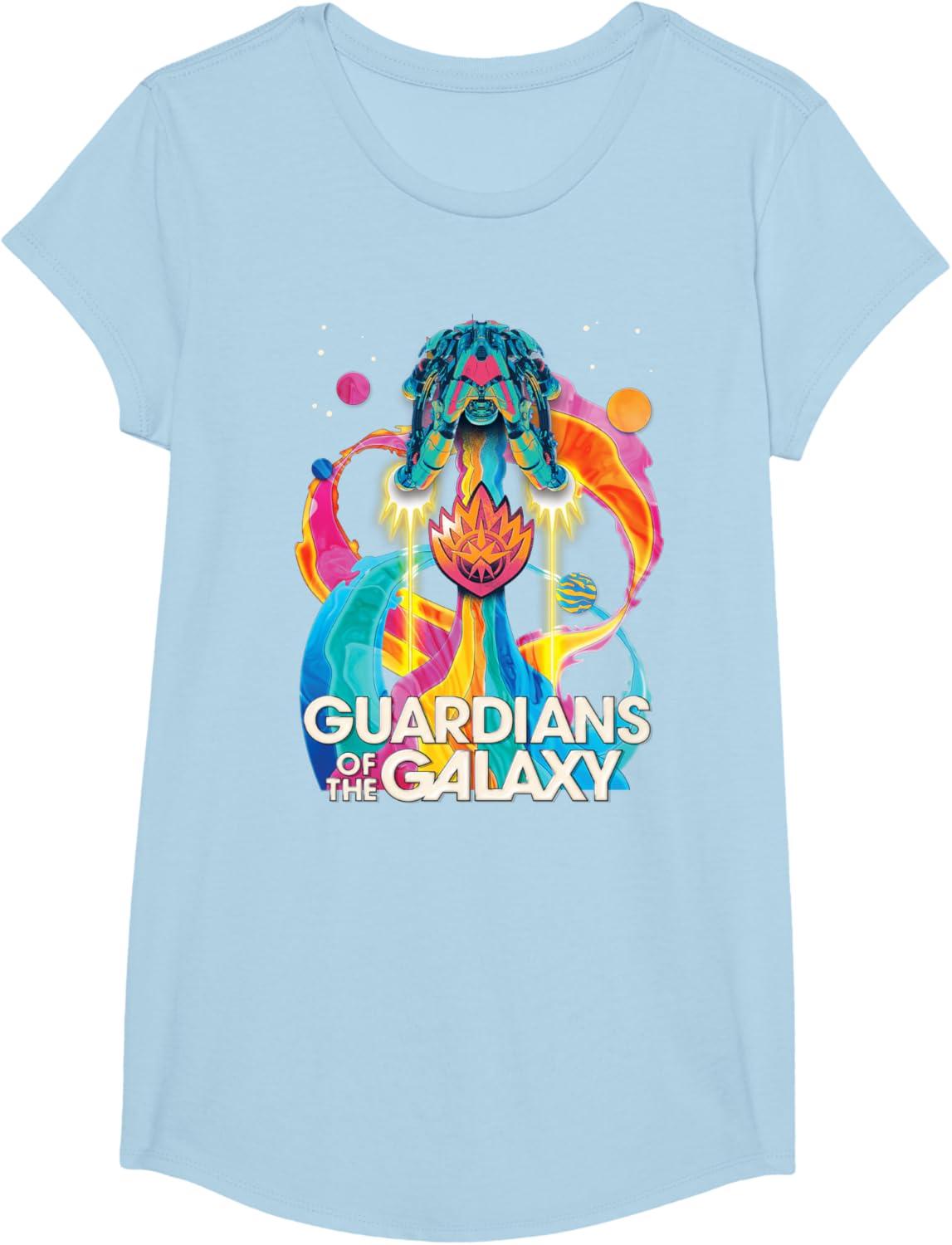 The Guardians are back to save the galaxy! From Marvel Studios’ “Guardians of the Galaxy Volume 3” movie sequel, this awesomely retro official tee or hoodie hearkens back to classic rock music album cover designs, featuring the team’s new ship, the Bowie, blasting through space with a rainbow rocket trail, accompanied by colorful planets, the Guardians’ team name, and their iconic flame symbol badge. A great gift for a Guardians of the Galaxy or Marvel Cinematic Universe (MCU) fan! Available in youth and adult sizes. Find it in a t-shirt, premium t-shirt, tank top, v-neck, long sleeve tee, hoodie, and sweatshirt.