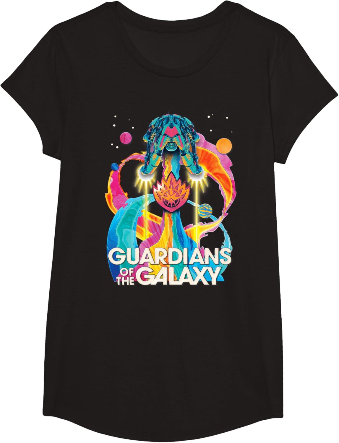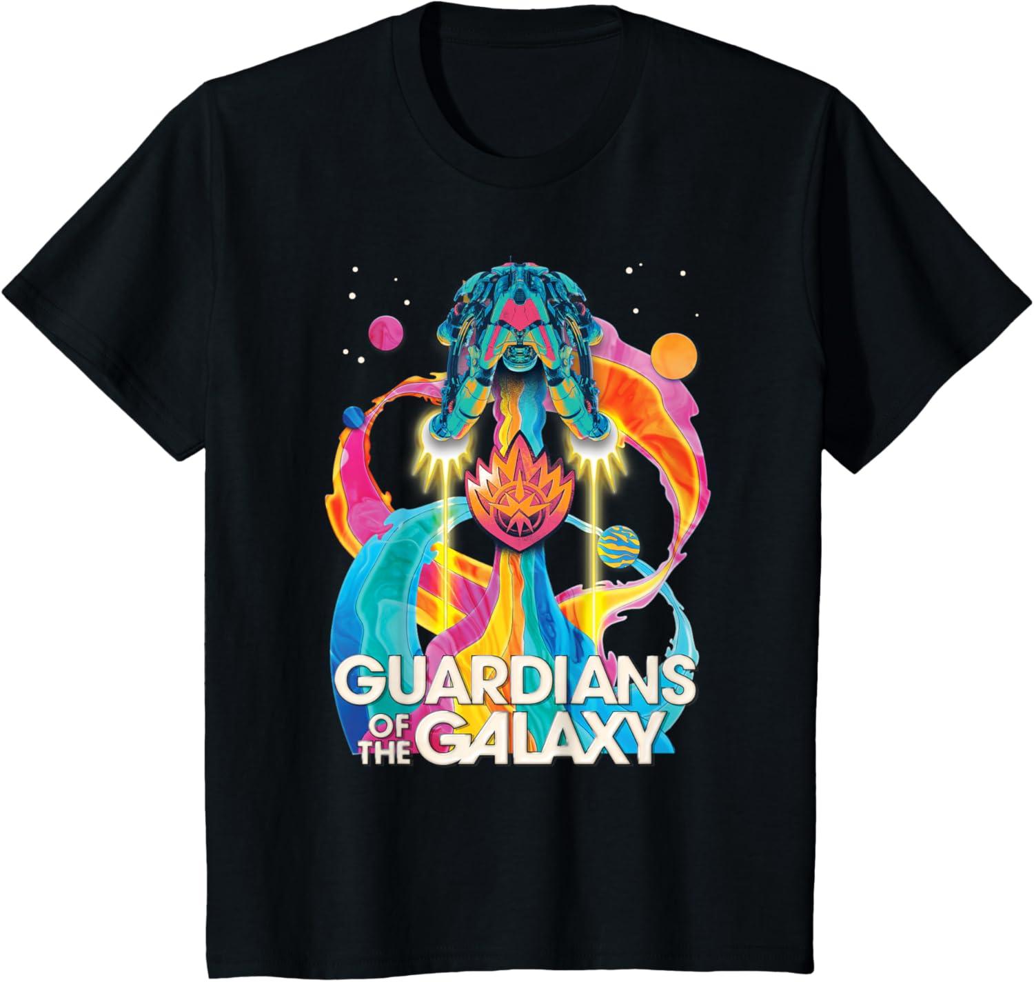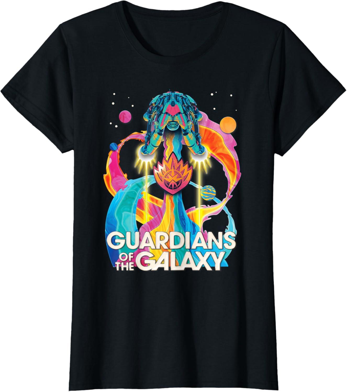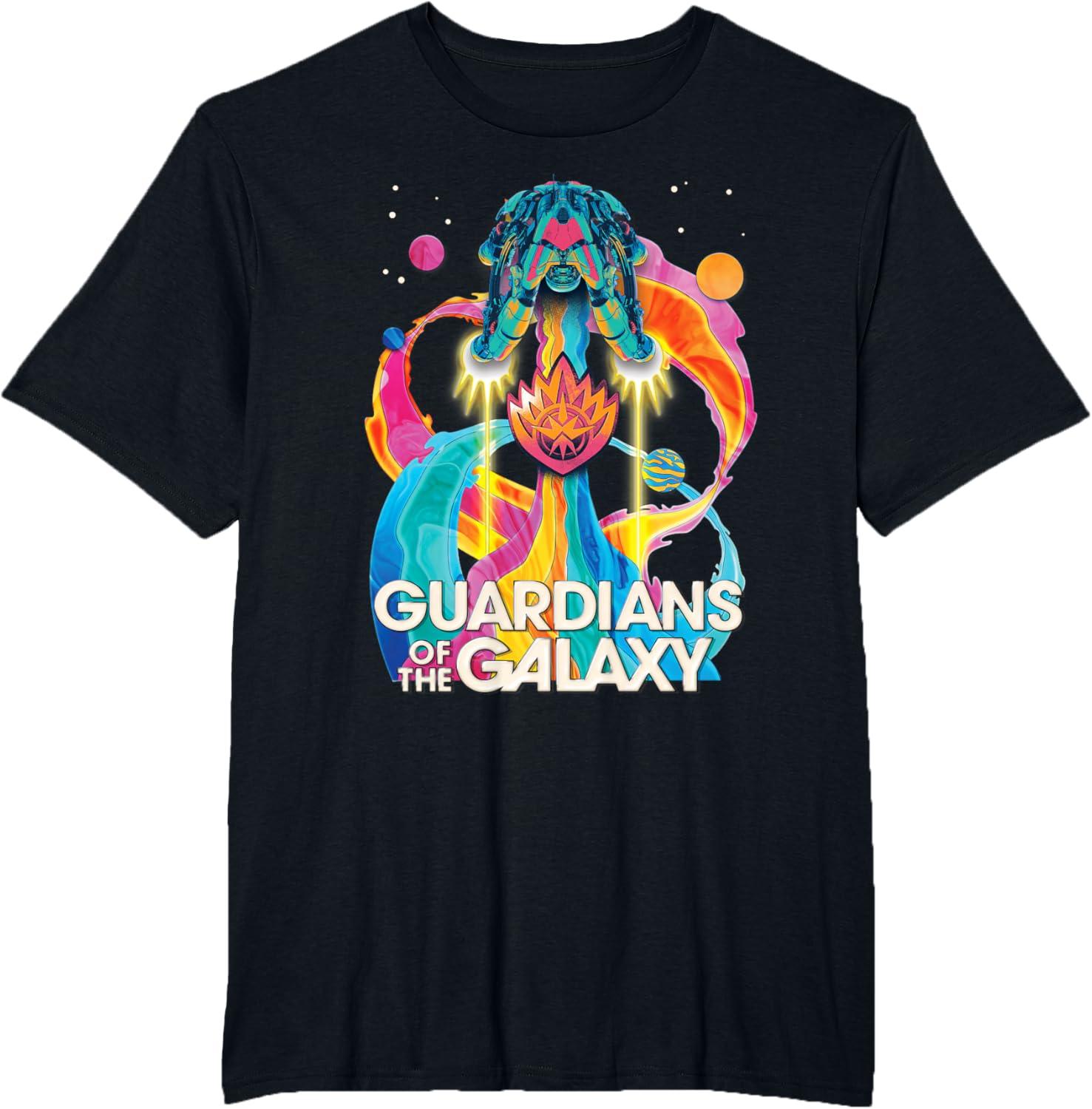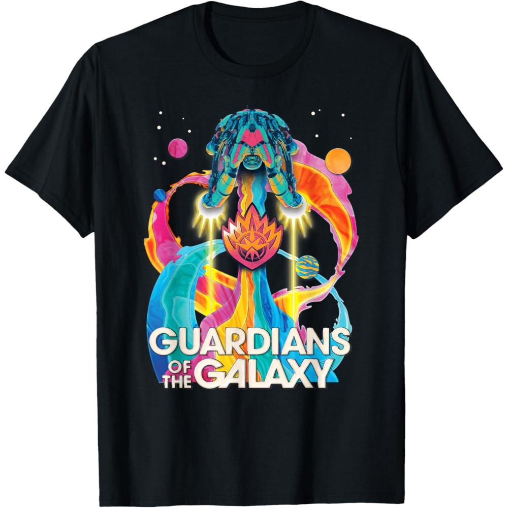 The Guardians are back to save the galaxy! From Marvel Studios’ “Guardians of the Galaxy Volume 3” movie sequel, this awesomely retro official tee or hoodie hearkens back to classic rock music album cover designs, featuring the team’s new ship, the Bowie, blasting through space with a rainbow rocket trail, accompanied by colorful planets, the Guardians’ team name, and their iconic flame symbol badge. A great gift for a Guardians of the Galaxy or Marvel Cinematic Universe (MCU) fan! Available in youth and adult sizes. Find it in a t-shirt, premium t-shirt, tank top, v-neck, long sleeve tee, hoodie, and sweatshirt.