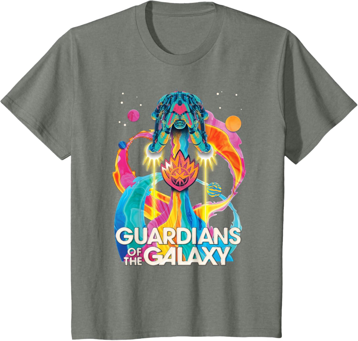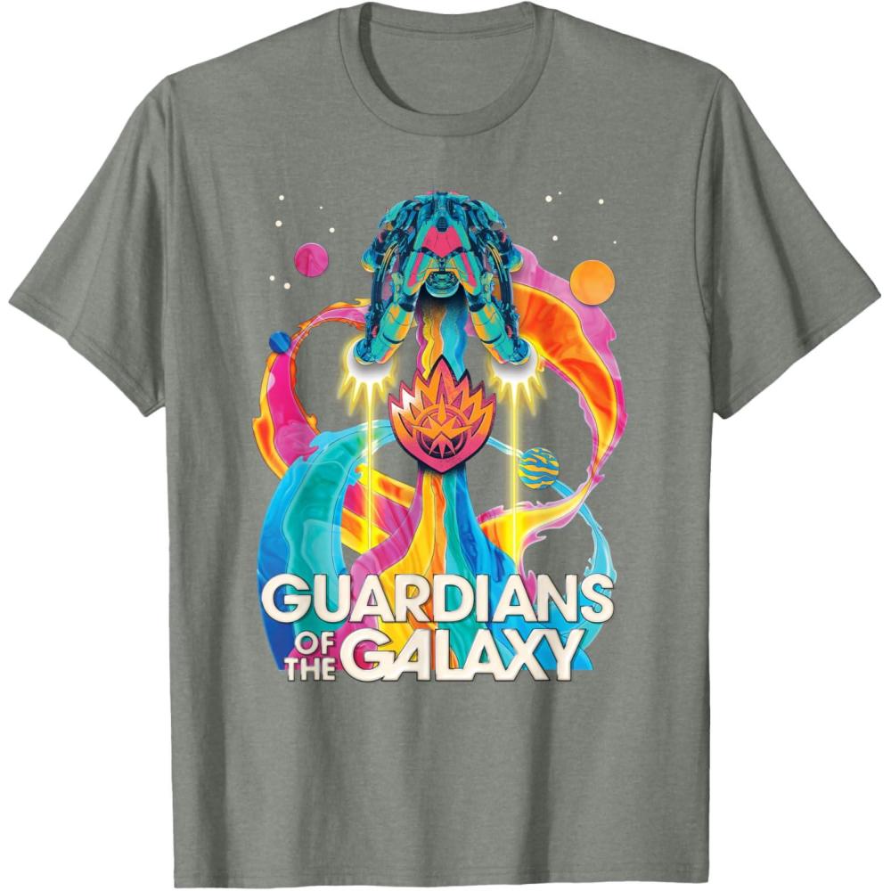 The Guardians are back to save the galaxy! From Marvel Studios’ “Guardians of the Galaxy Volume 3” movie sequel, this awesomely retro official tee or hoodie hearkens back to classic rock music album cover designs, featuring the team’s new ship, the Bowie, blasting through space with a rainbow rocket trail, accompanied by colorful planets, the Guardians’ team name, and their iconic flame symbol badge. A great gift for a Guardians of the Galaxy or Marvel Cinematic Universe (MCU) fan! Available in youth and adult sizes. Find it in a t-shirt, premium t-shirt, tank top, v-neck, long sleeve tee, hoodie, and sweatshirt.