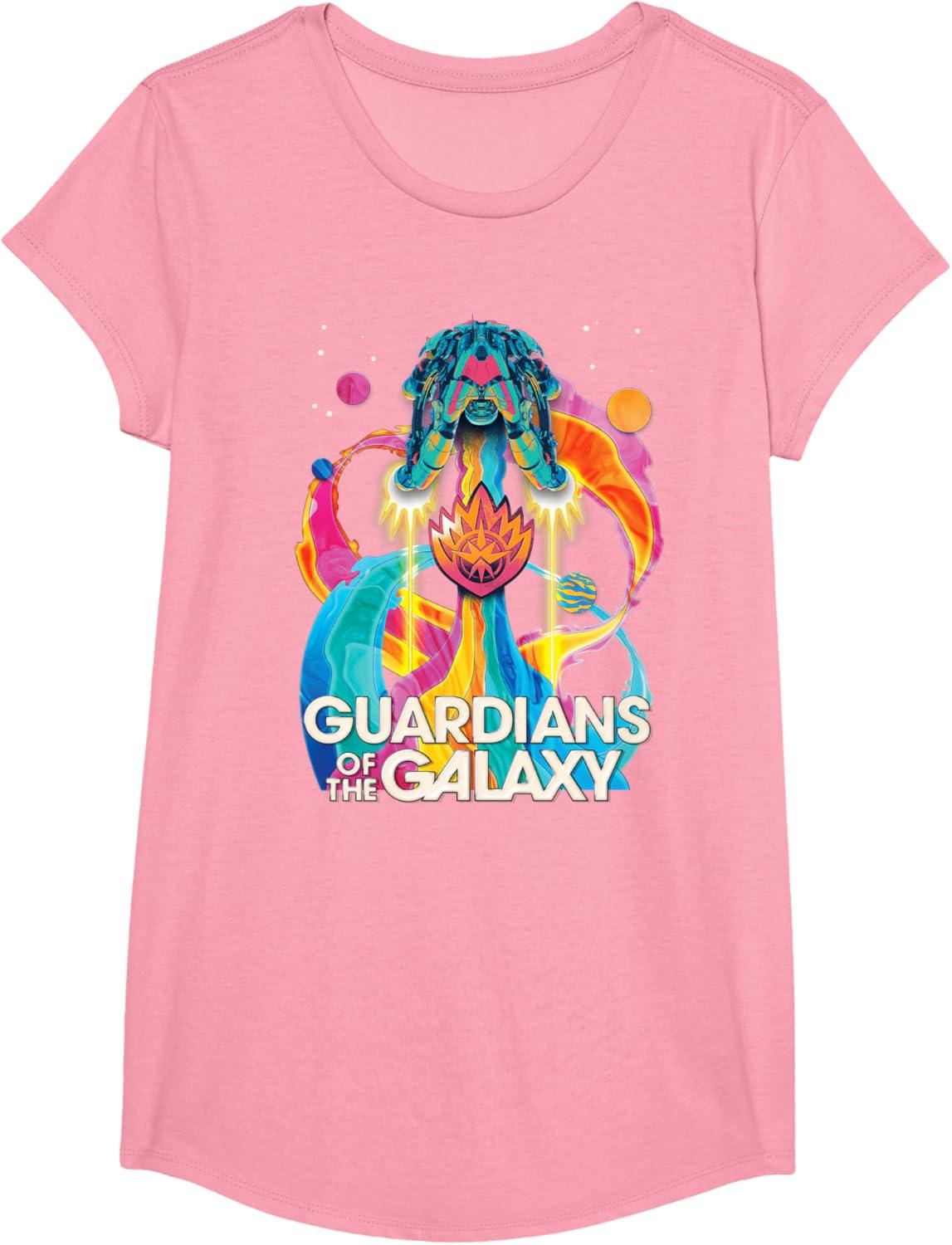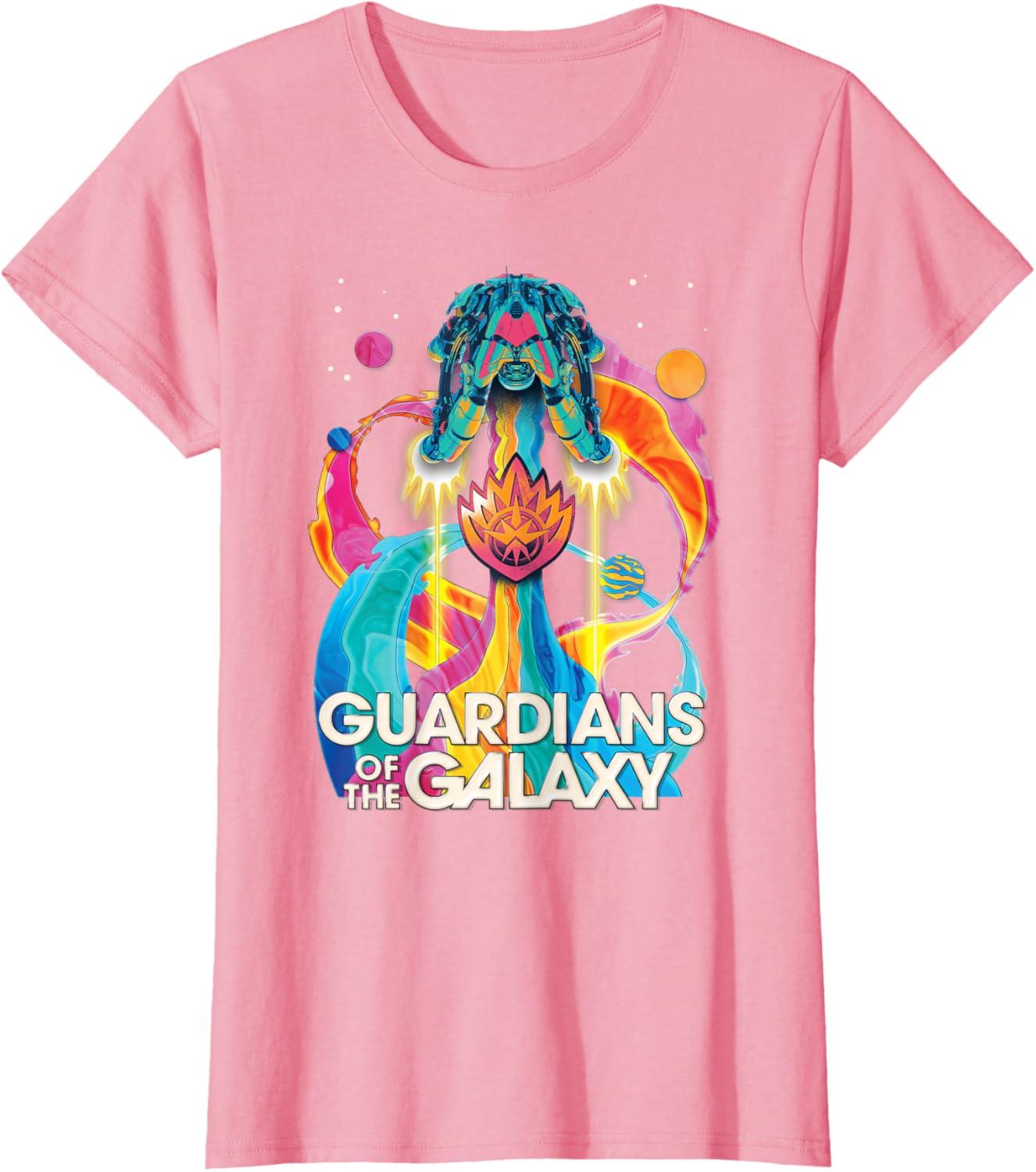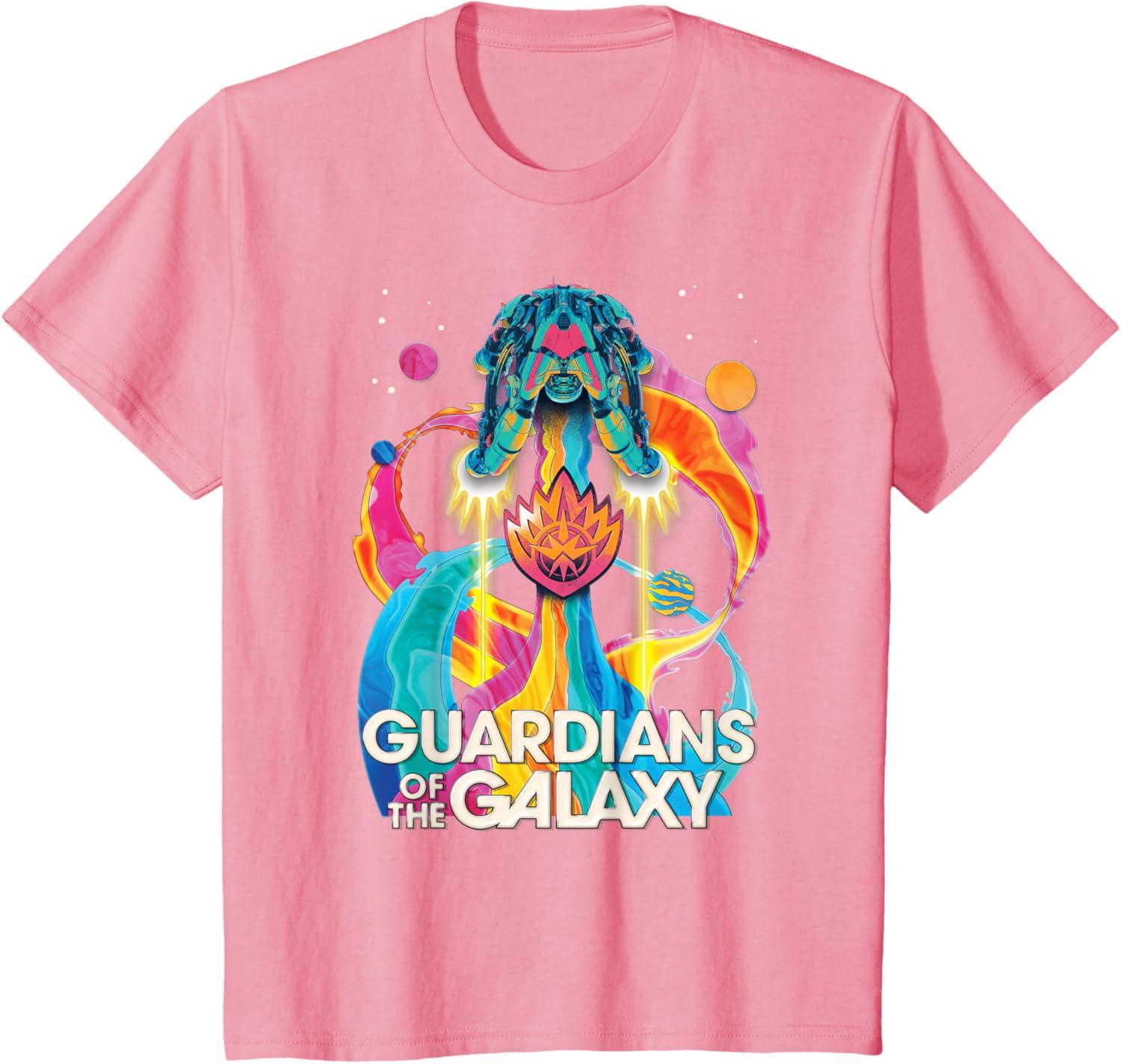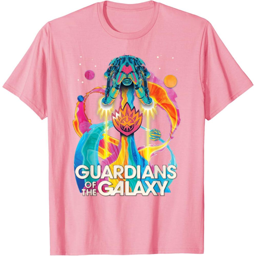 The Guardians are back to save the galaxy! From Marvel Studios’ “Guardians of the Galaxy Volume 3” movie sequel, this awesomely retro official tee or hoodie hearkens back to classic rock music album cover designs, featuring the team’s new ship, the Bowie, blasting through space with a rainbow rocket trail, accompanied by colorful planets, the Guardians’ team name, and their iconic flame symbol badge. A great gift for a Guardians of the Galaxy or Marvel Cinematic Universe (MCU) fan! Available in youth and adult sizes. Find it in a t-shirt, premium t-shirt, tank top, v-neck, long sleeve tee, hoodie, and sweatshirt.