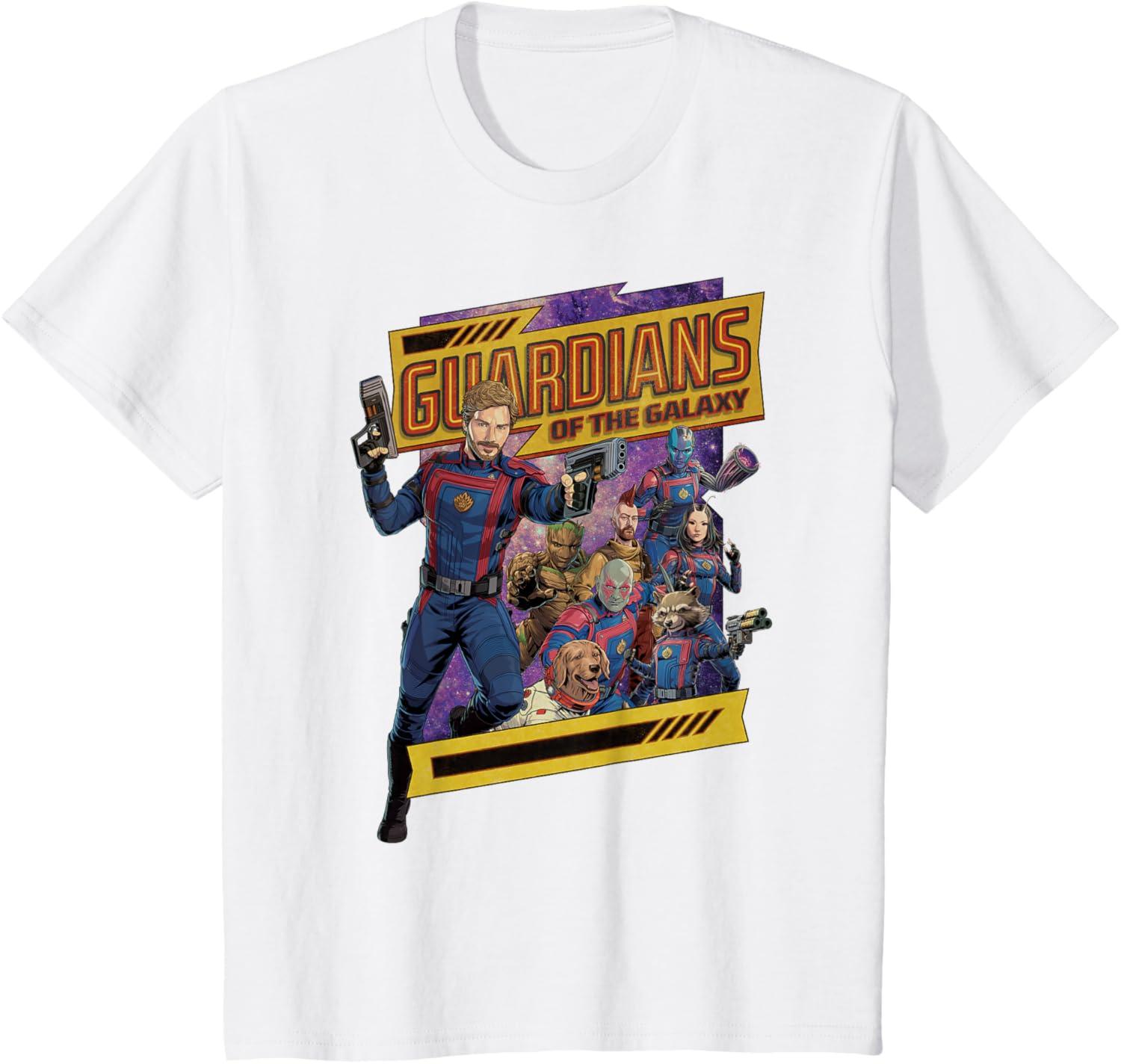 The Guardians unite to save the galaxy! From Marvel Studios’ “Guardians of the Galaxy Volume 3” film sequel, this official tee or hoodie features Peter “Star-Lord” Quill, Rocket Raccoon, Groot, Drax, Mantis, Nebula, Kraglin, and Cosmo the Space Dog in their new movie uniforms, ready for action in a colorful comic-style illustration below a fashionably distressed Guardians of the Galaxy logo. A great gift for a Guardians of the Galaxy or Marvel Cinematic Universe (MCU) fan! Available in youth and adult sizes. Find it in a t-shirt, premium t-shirt, tank top, v-neck, long sleeve tee, hoodie, and sweatshirt.