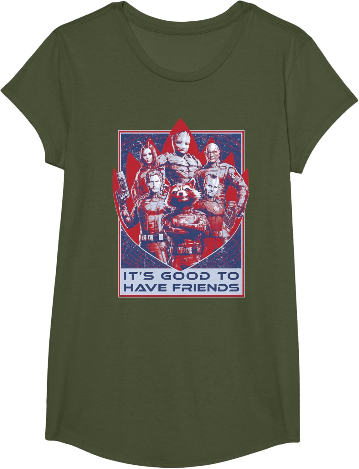 Everybody should have friends like these! From Marvel Studios’ “Guardians of the Galaxy Volume 3” film sequel, this official tee or hoodie features the team of Peter “Star-Lord” Quill, Rocket Raccoon, Groot, Drax, Mantis, and Nebula in their new movie uniforms on the Guardians’ iconic flame symbol badge, with “It’s Good to Have Friends” written underneath. A great gift for a Guardians of the Galaxy or Marvel Cinematic Universe (MCU) fan! Available in youth and adult sizes. Find it in a t-shirt, premium t-shirt, tank top, v-neck, long sleeve tee, hoodie, and sweatshirt.