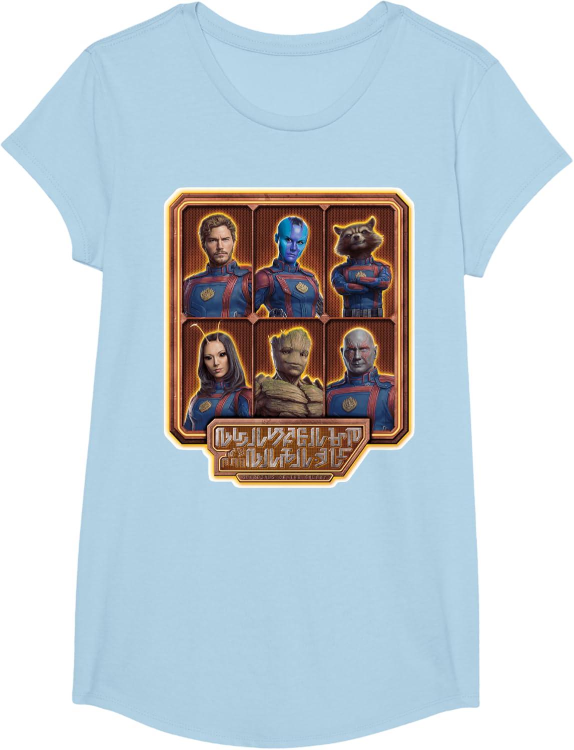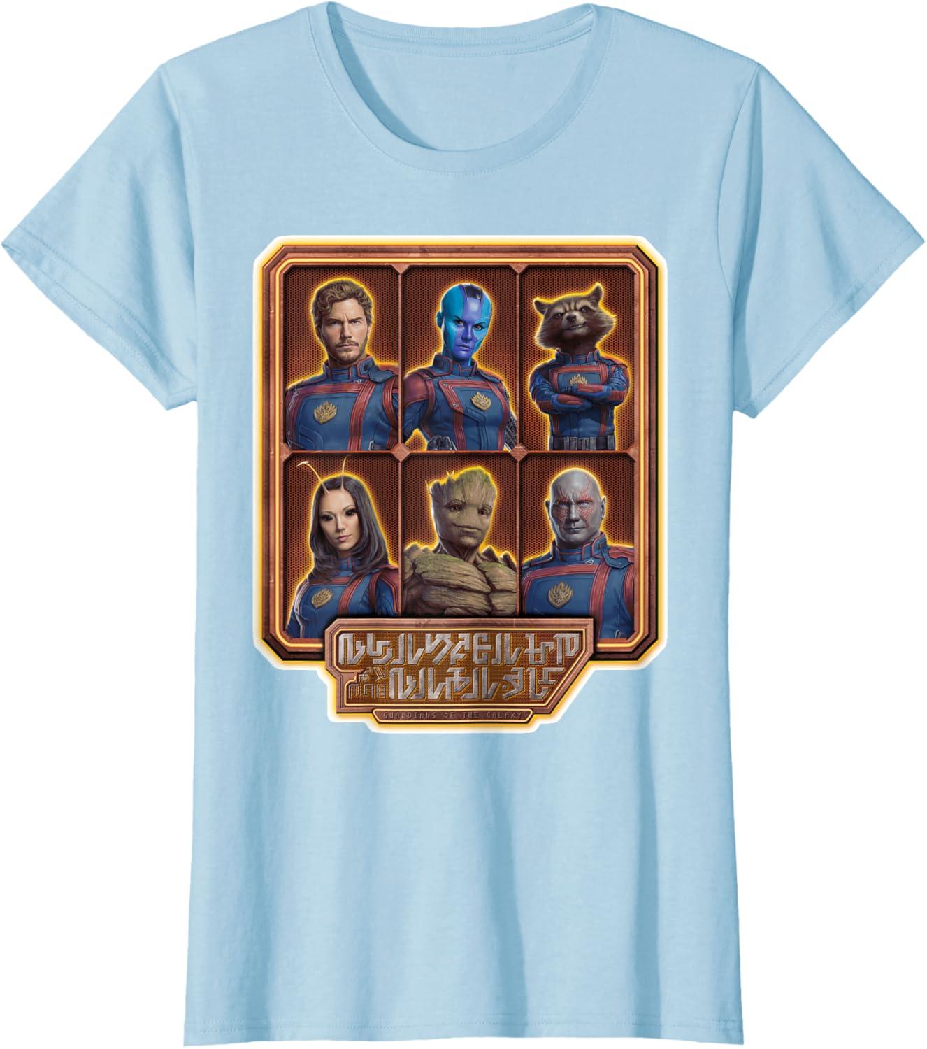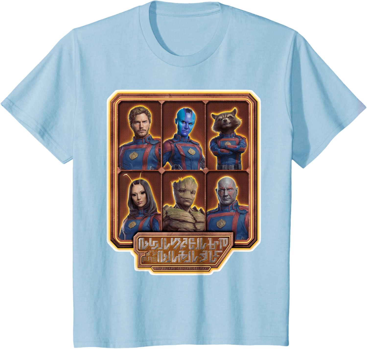 The Guardians are back in Marvel Studios’ “Guardians of the Galaxy Volume 3” film sequel! This official tee or hoodie features team members Peter “Star-Lord” Quill, Nebula, Rocket Raccoon, Mantis, Groot, and Drax in their new uniforms with the Guardians of the Galaxy movie logo written in an alien language and translated into “Guardians of the Galaxy” underneath. A great gift for a Guardians of the Galaxy or Marvel Cinematic Universe (MCU) fan! Available in youth and adult sizes. Find it in a t-shirt, premium t-shirt, tank top, v-neck, long sleeve tee, hoodie, and sweatshirt.