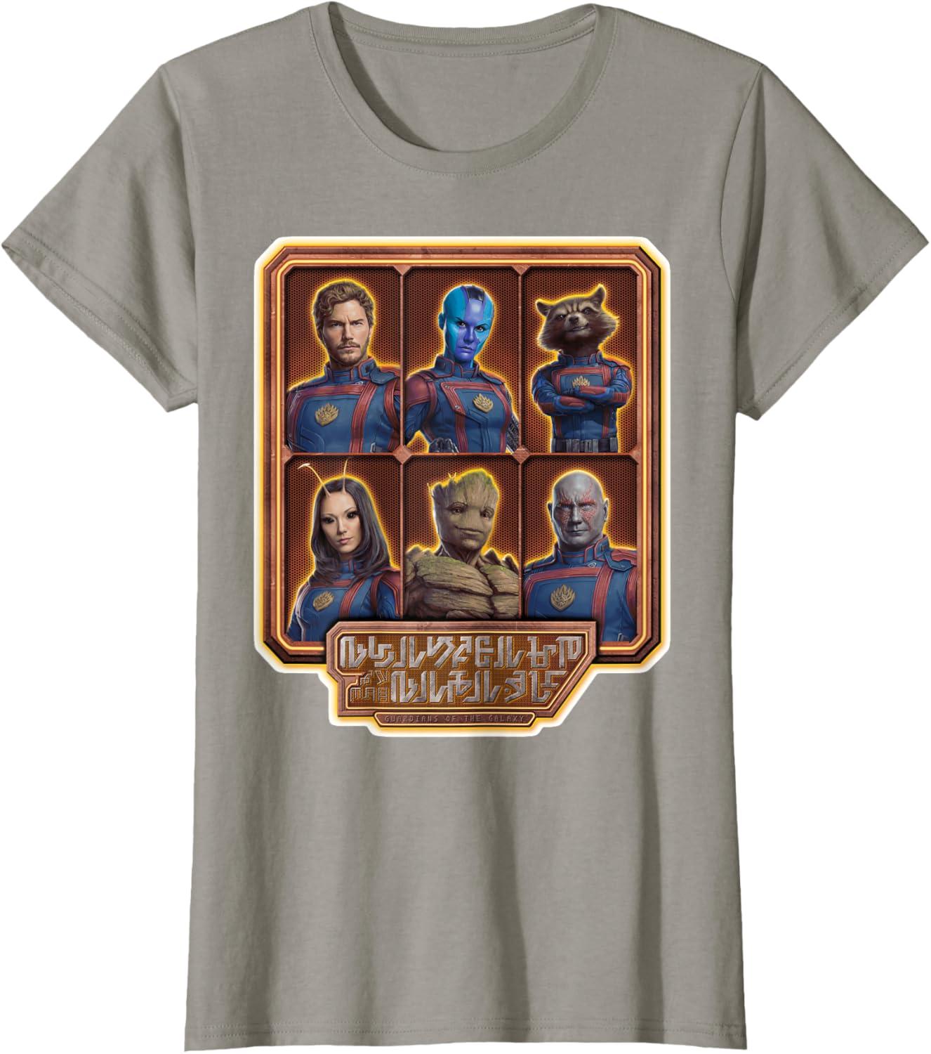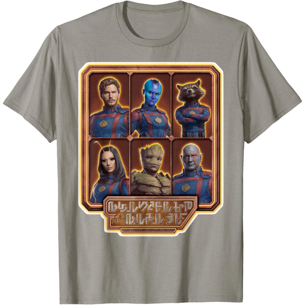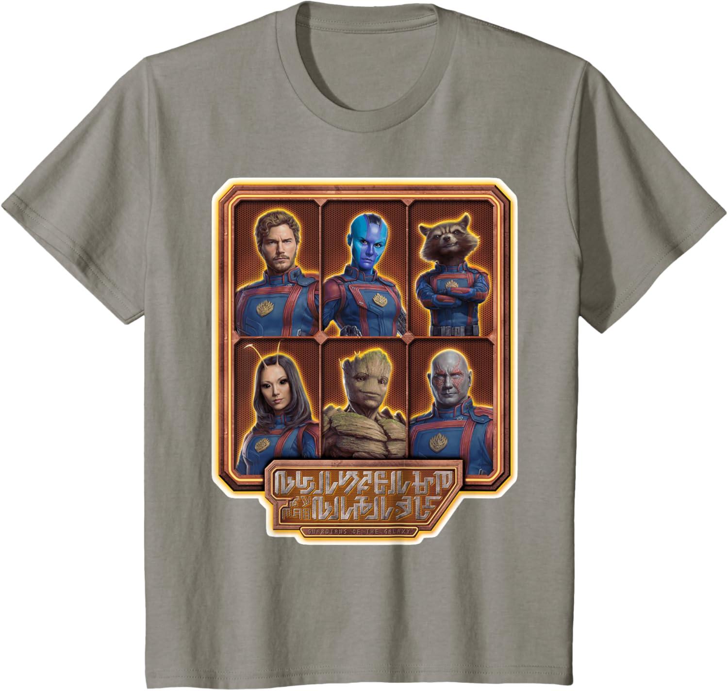 The Guardians are back in Marvel Studios’ “Guardians of the Galaxy Volume 3” film sequel! This official tee or hoodie features team members Peter “Star-Lord” Quill, Nebula, Rocket Raccoon, Mantis, Groot, and Drax in their new uniforms with the Guardians of the Galaxy movie logo written in an alien language and translated into “Guardians of the Galaxy” underneath. A great gift for a Guardians of the Galaxy or Marvel Cinematic Universe (MCU) fan! Available in youth and adult sizes. Find it in a t-shirt, premium t-shirt, tank top, v-neck, long sleeve tee, hoodie, and sweatshirt.