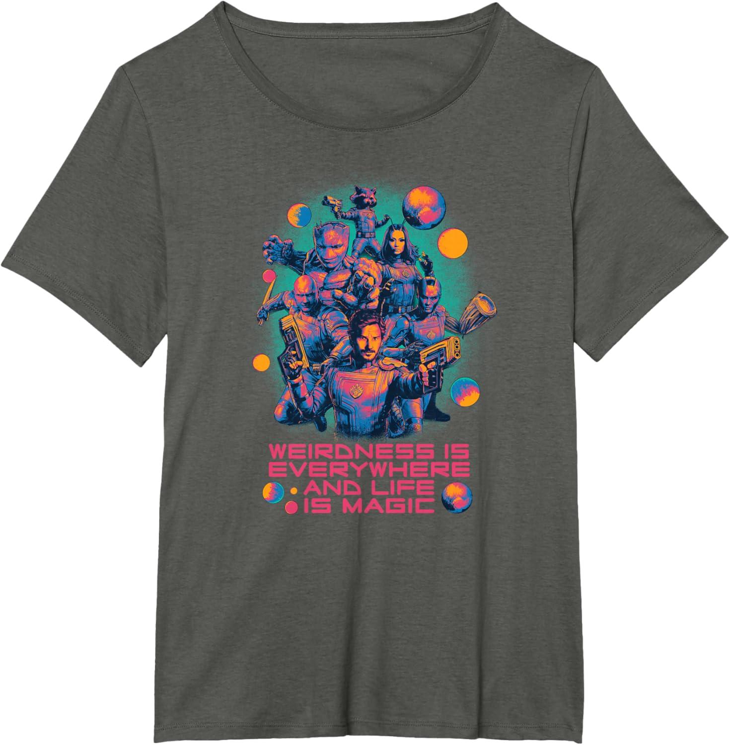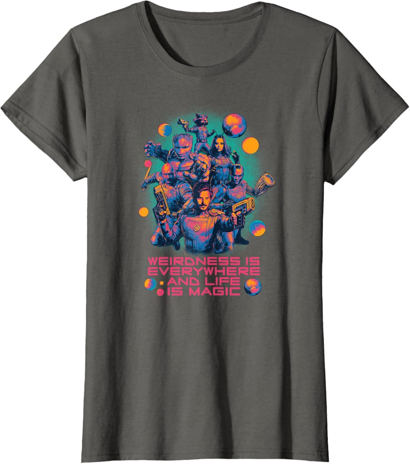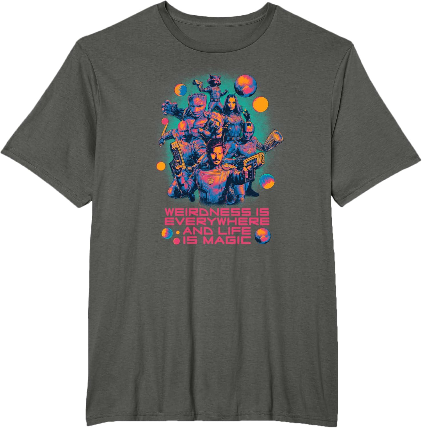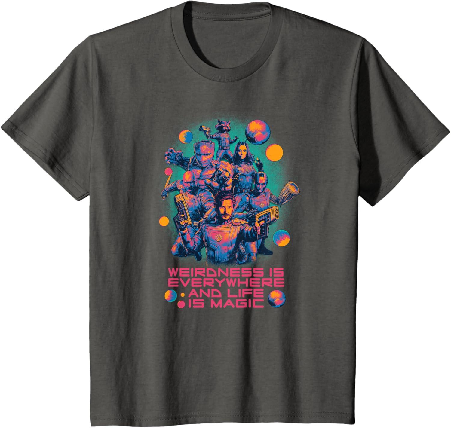 “Weirdness is Everywhere and Life is Magic” is the unforgettable quote on this official tee or hoodie from Marvel Studios’ “Guardians of the Galaxy Volume 3” film sequel, featuring Peter “Star-Lord” Quill, Rocket Raccoon, Groot, Drax, Mantis, and Nebula in their new movie uniforms, surrounded by alien planets and unknown worlds. A great gift for a Guardians of the Galaxy or Marvel Cinematic Universe (MCU) fan! Available in youth and adult sizes. Find it in a t-shirt, premium t-shirt, tank top, v-neck, long sleeve tee, hoodie, and sweatshirt.
