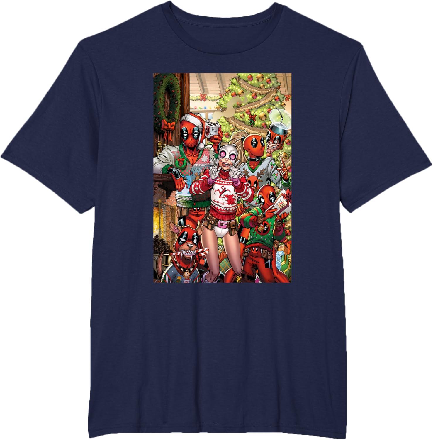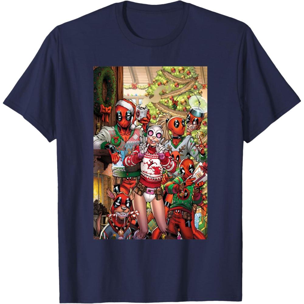 An Amazon exclusive! Join Gwenpool and the whole Deadpool Family for a festive holiday season on this official Marvel tee or hoodie, featuring the dimension-displaced Gwendolyn Poole teamed up with merc-with-a-mouth Deadpool, Lady Deadpool, Kidpool, Dogpool, and zombie Headpool in their most colorful Christmas sweaters for a family portrait of yuletide hijinks and fun. A great Christmas gift for a Deadpool, Gwenpool, or Marvel Super Heroes fan! Get multiples of this full-color graphic shirt design to coordinate and match up with friends and family for even more hero-sized fun. Find it in a t-shirt, premium t-shirt, tank top, v-neck, long sleeve tee, hoodie, and sweatshirt.