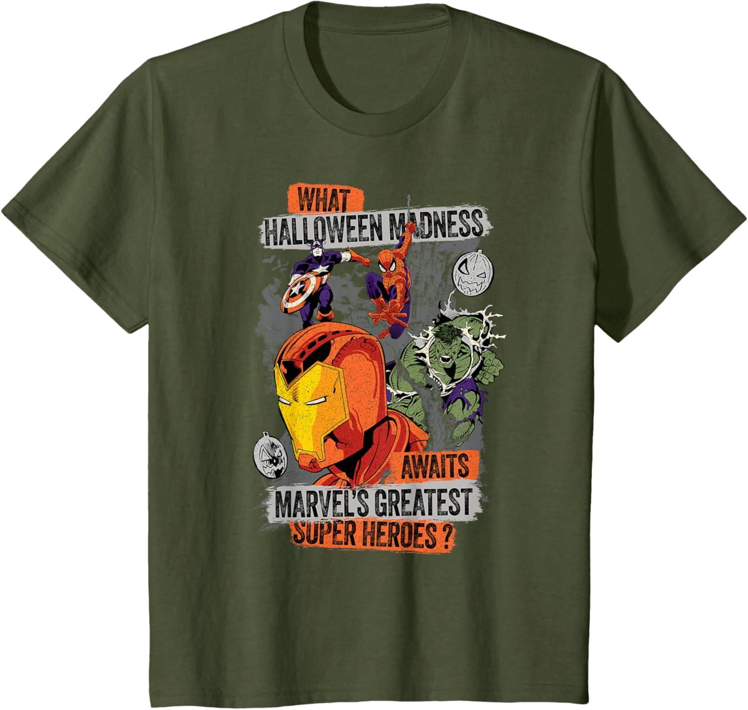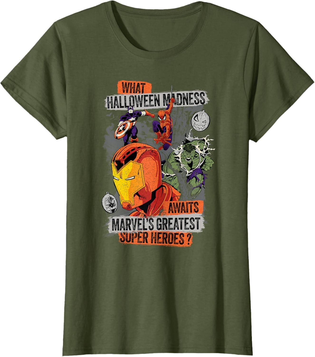 “What Halloween Madness Awaits Marvel's Greatest Super Heroes?” This official Marvel tee or hoodie poses the super spooky question with illustrated Marvel Comics art of Iron Man, Spider-Man, Captain America, and the Hulk along with a pair of jack-o'-lantern pumpkins, all with a spattered print effect for an eye-catchingly gritty look. A great Halloween gift for a Marvel Super Heroes fan, and perfect for a superhero themed costume party or Halloween trick-or-treating! Planning a fall trip to Avengers Campus at Disney California Adventure Park, Disneyland, Walt Disney World, or another super destination? Get multiples of this eye-catching graphic tee design and wear matching Marvel Halloween t-shirts with friends and family groups for even more superhero-sized fun! Available in youth and adult sizes. Find it in a t-shirt, premium t-shirt, tank top, v-neck, long sleeve tee, hoodie, and sweatshirt.