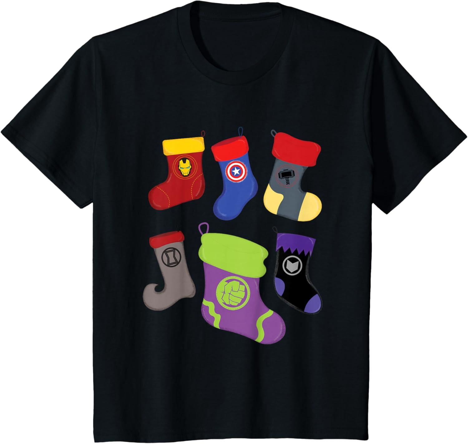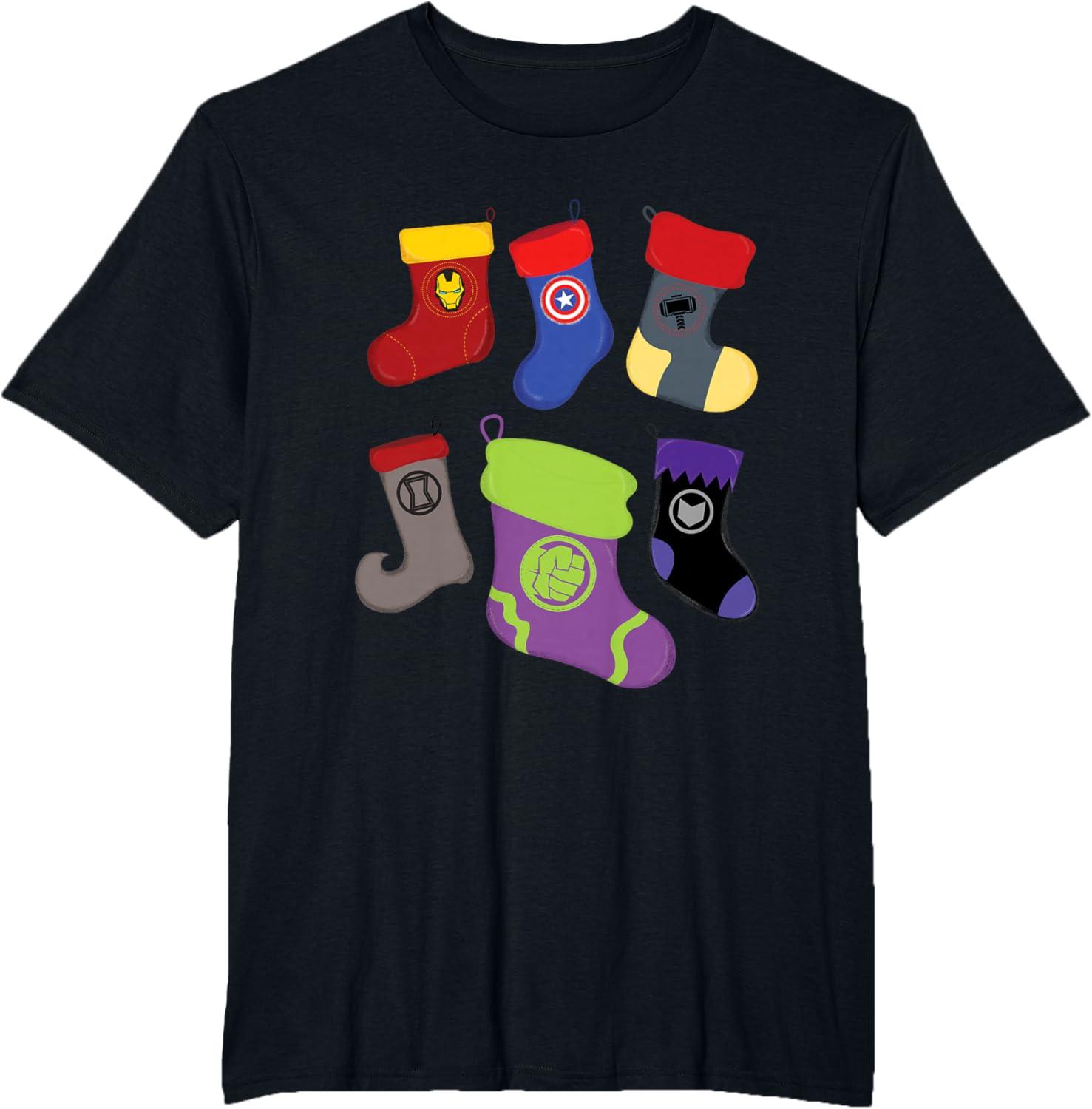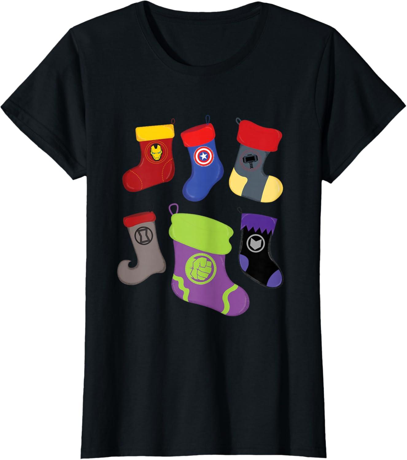 Have a heroic holiday season with the Mighty Avengers! This fun and festive official Marvel tee or hoodie features colorful Christmas stockings decorated as Iron Man, Captain America, Thor, Black Widow, Hulk, and Hawkeye. A great Christmas gift for a Marvel Super Heroes or Avengers fan! Planning a winter holiday trip to Avengers Campus at Disney California Adventure Park or another super destination? Get multiples to coordinate and match with friends and family for even more hero-sized fun! Available in youth and adult sizes. Find it in a t-shirt, premium t-shirt, tank top, v-neck, long sleeve tee, hoodie, and sweatshirt.