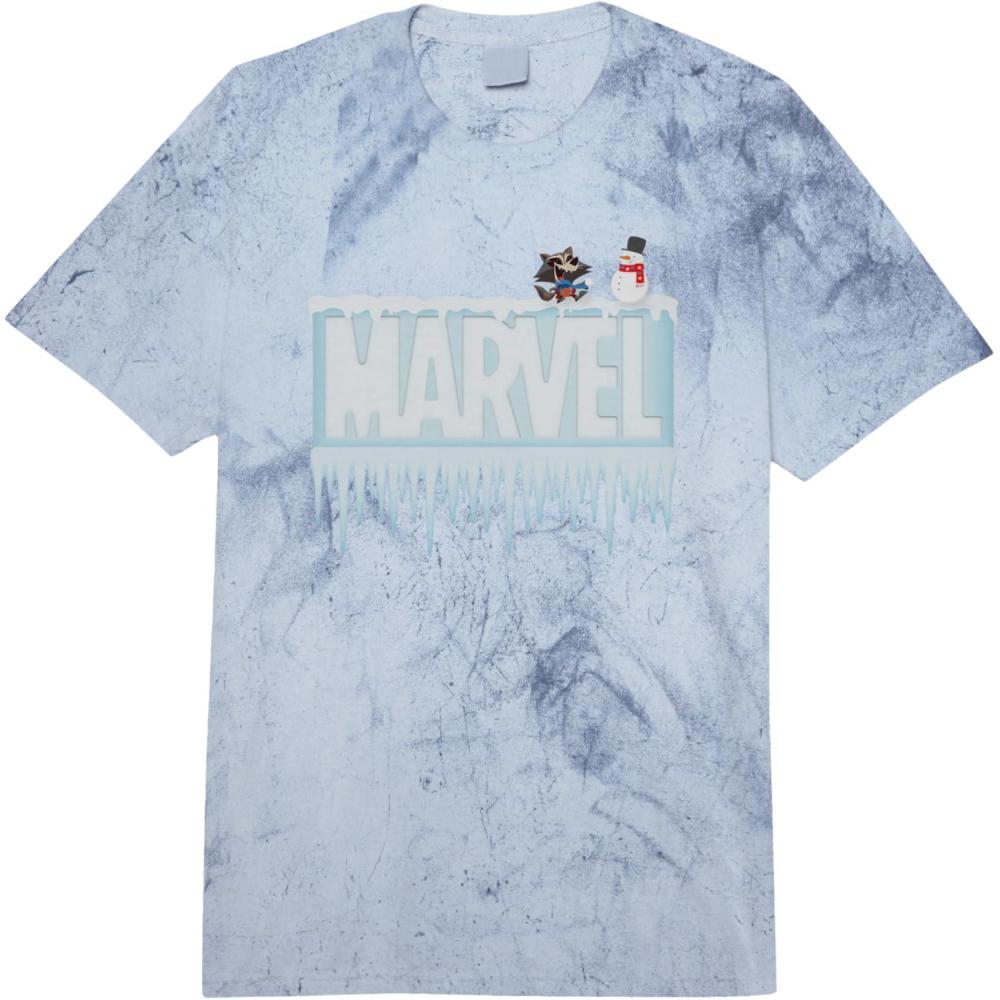 Marvel Holiday Snow Logo with Rocket Raccoon and Snowman Comfort Colors Adult Heavyweight T-Shirt(Blue Tie Dye)