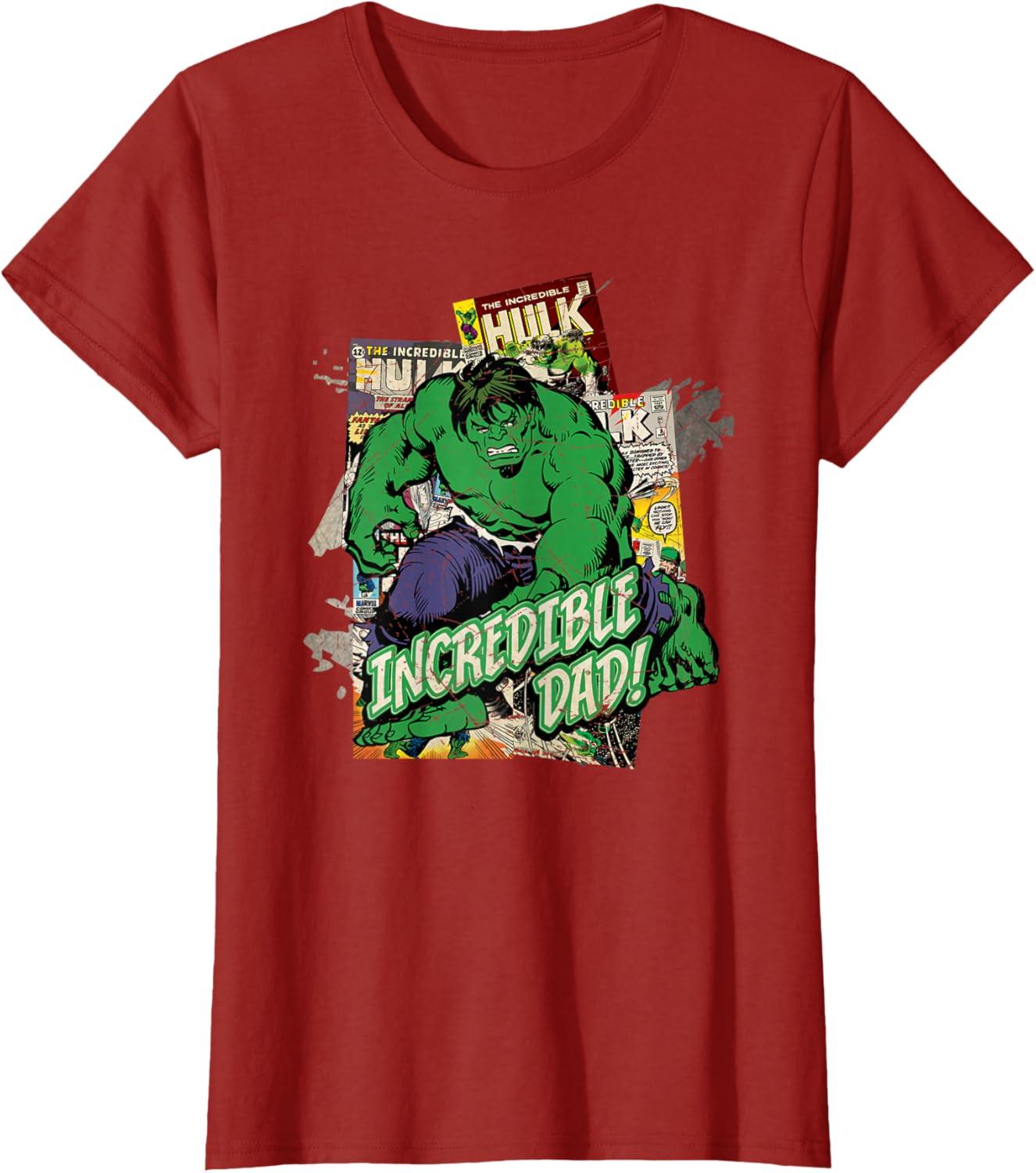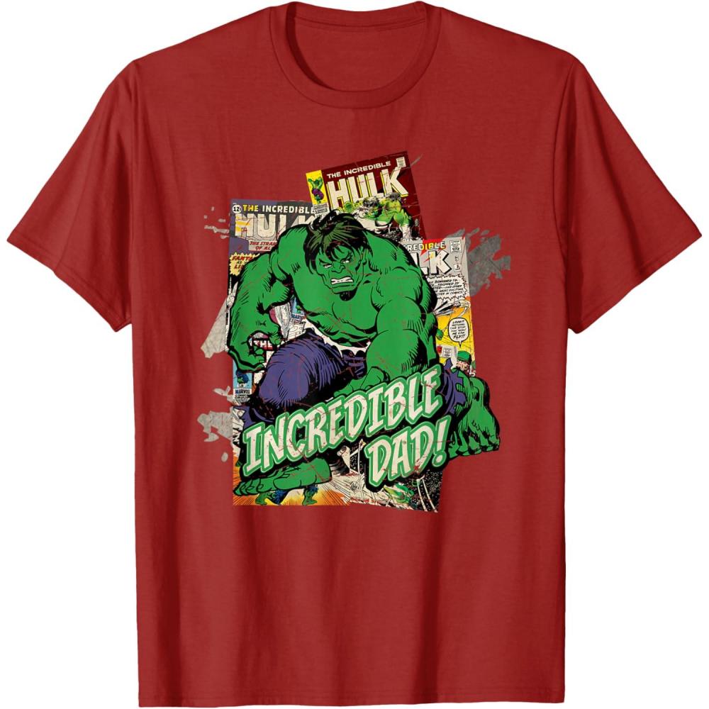 With physical strength that amplifies as his emotional distress grows, Bruce Banner's physical strength is practically limitless and it's apparent on this retro Hulk tee shirt. It features distressed details and vintage comic book covers guaranteed to delight Marvel fans. This Father's Day tell the Super Hero in your life that he's an “Incredible Dad!” just like the green and powerful Hulk. This t-shirt makes the perfect Father's Day gift