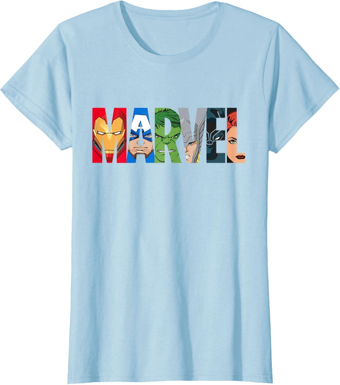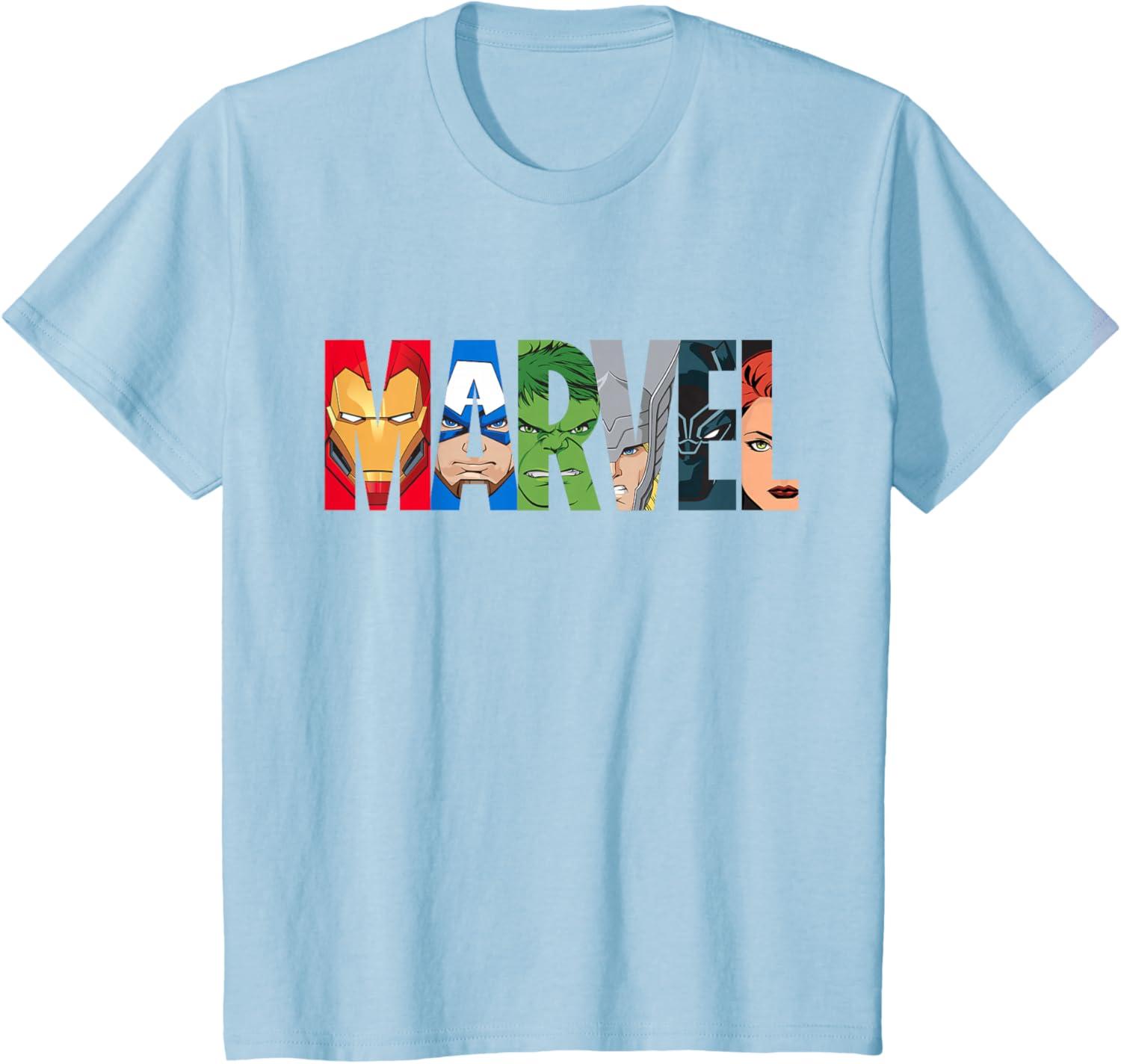 The Avengers come together on this awesome Marvel logo graphic tee shirt. Iron Man, Captain America, Hulk, Thor, Black Panther, and Black Widow are illustrated inside the letters of the Marvel logo in their classic comic style. This cool t-shirt is sure to add some Super Hero power to your wardrobe.