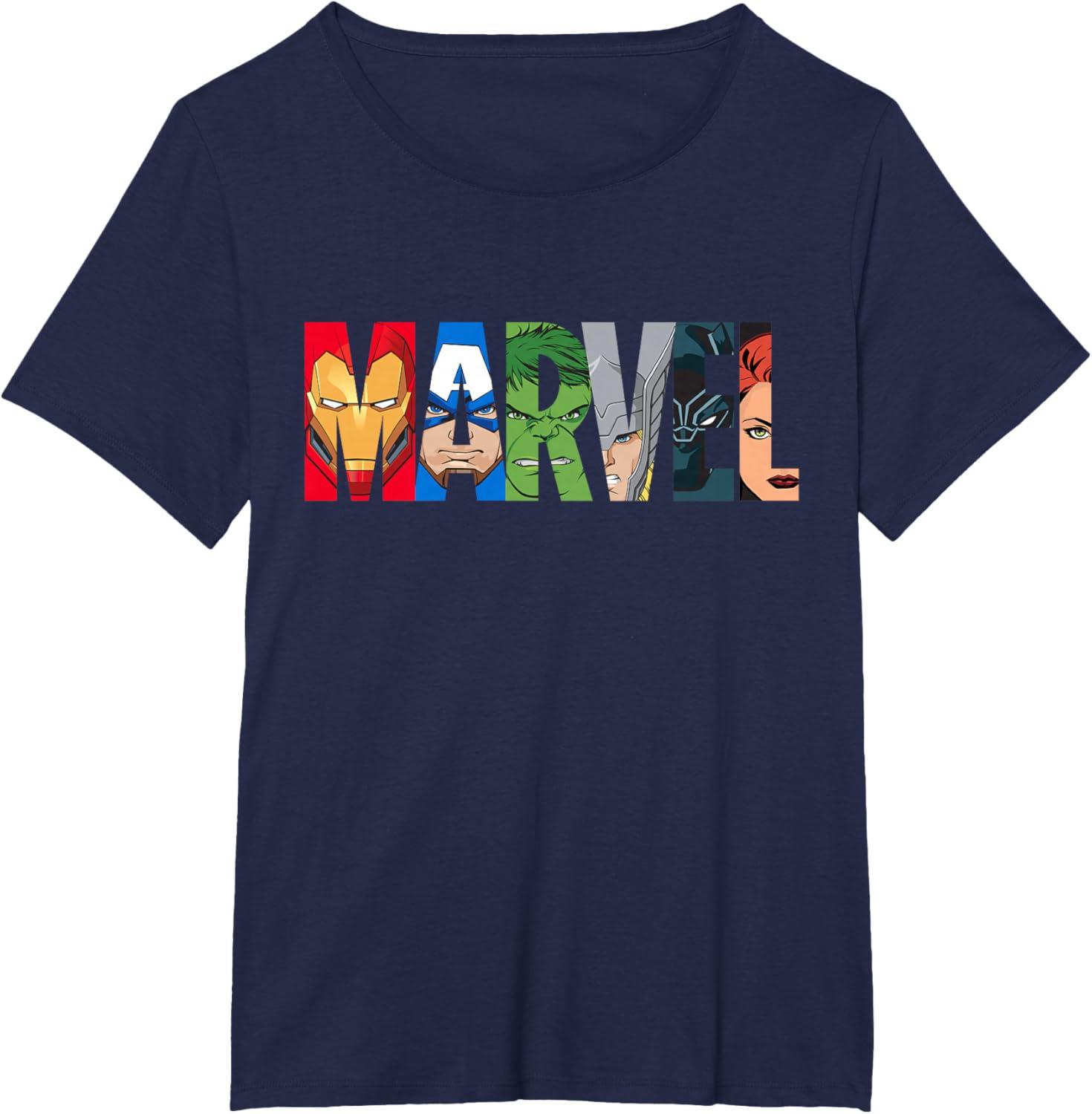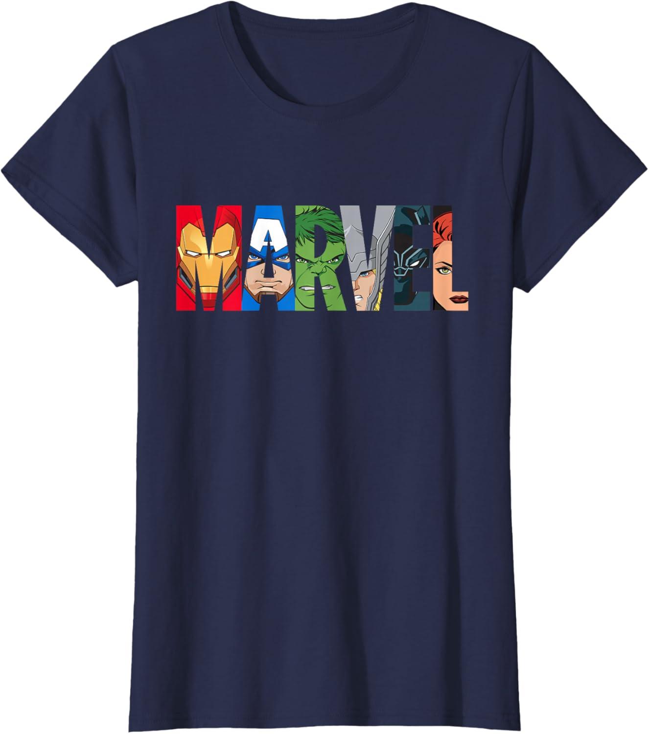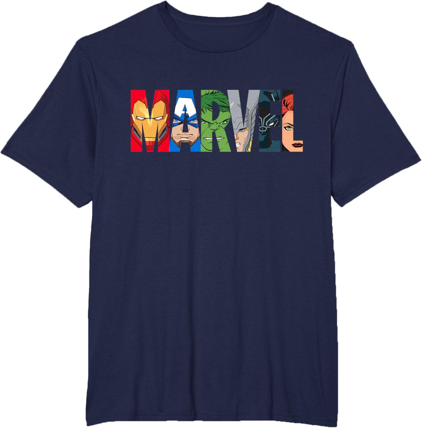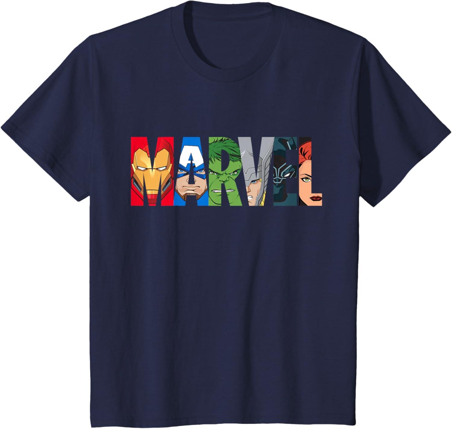 The Avengers come together on this awesome Marvel logo graphic tee shirt. Iron Man, Captain America, Hulk, Thor, Black Panther, and Black Widow are illustrated inside the letters of the Marvel logo in their classic comic style. This cool t-shirt is sure to add some Super Hero power to your wardrobe.