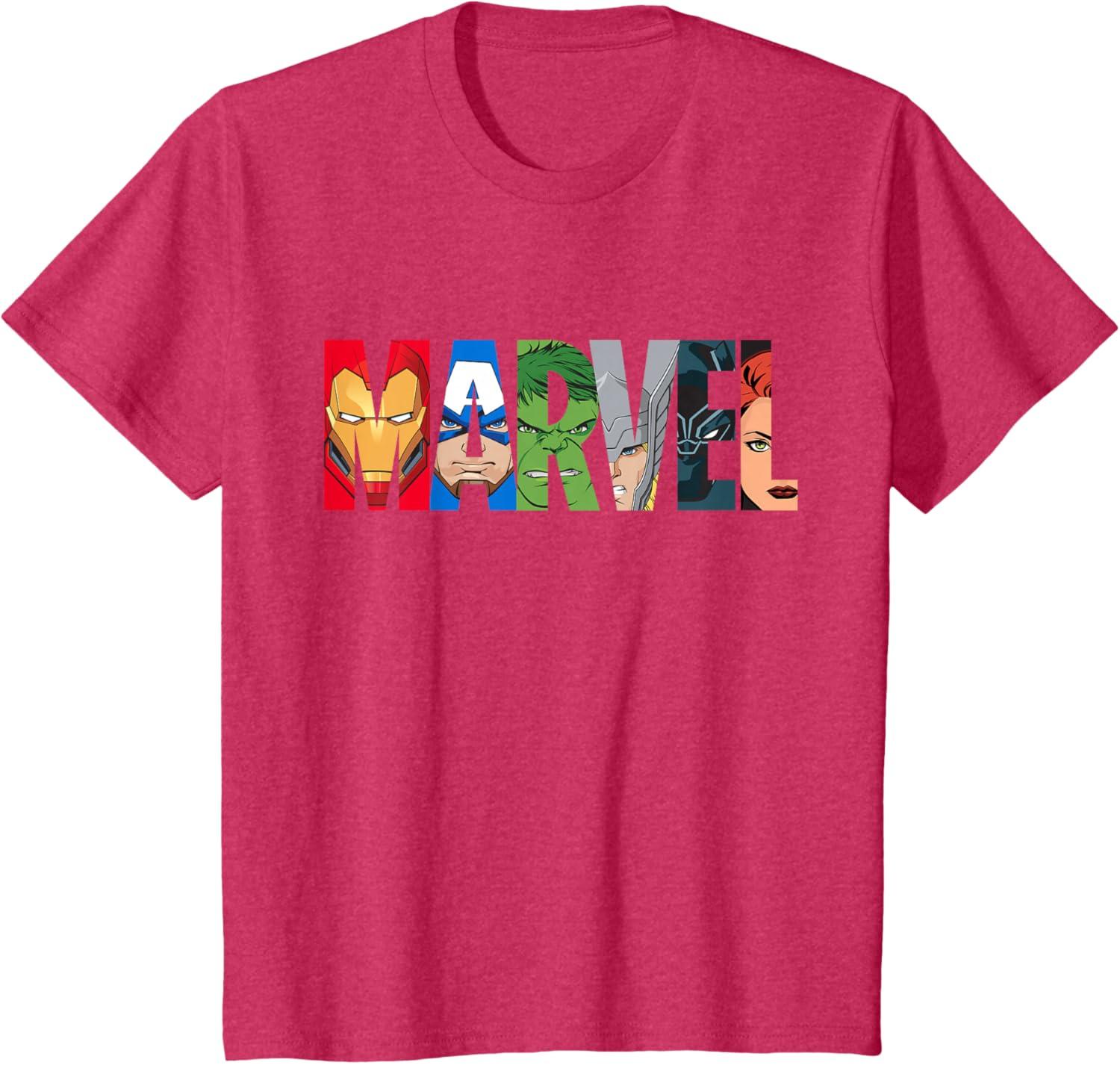 The Avengers come together on this awesome Marvel logo graphic tee shirt. Iron Man, Captain America, Hulk, Thor, Black Panther, and Black Widow are illustrated inside the letters of the Marvel logo in their classic comic style. This cool t-shirt is sure to add some Super Hero power to your wardrobe.