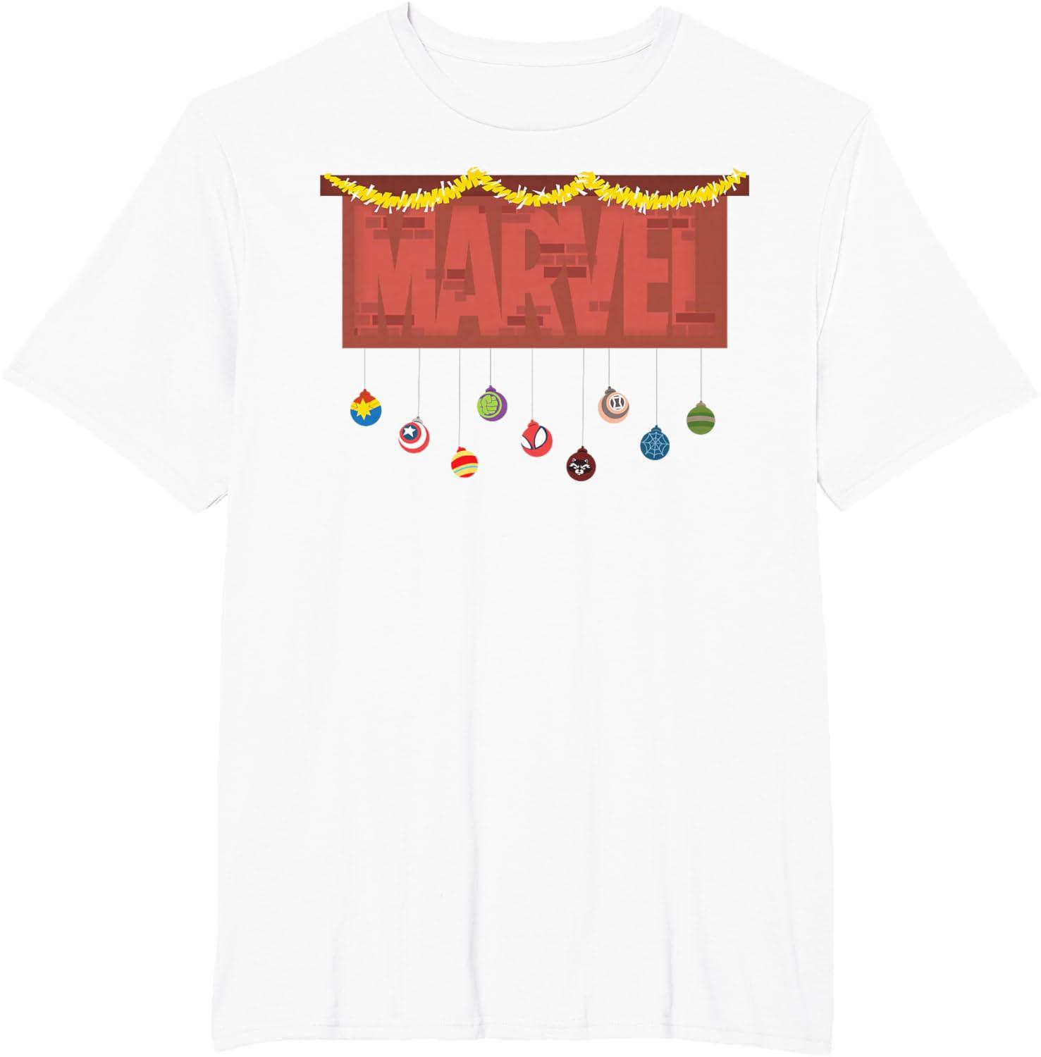 imageMarvel Logo Holiday Christmas Avengers Super Hero Ornaments TShirtWhite