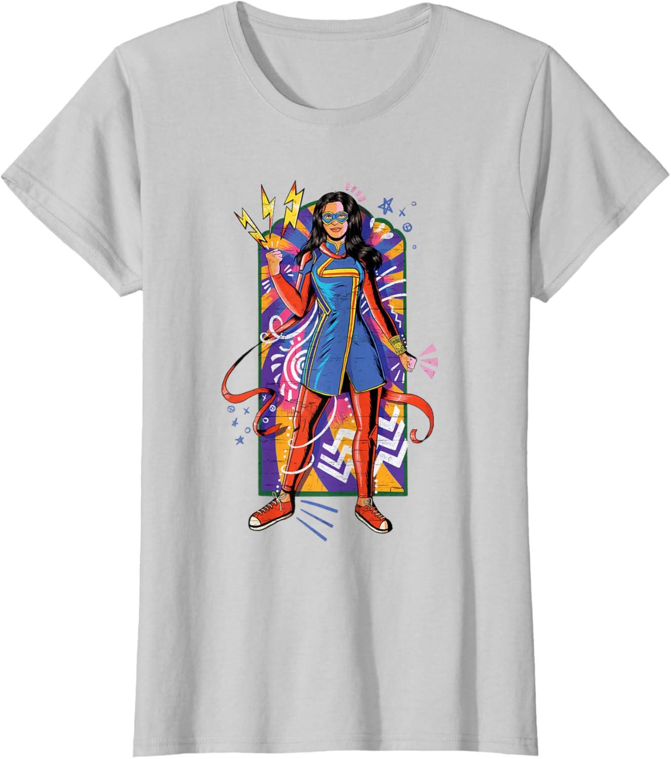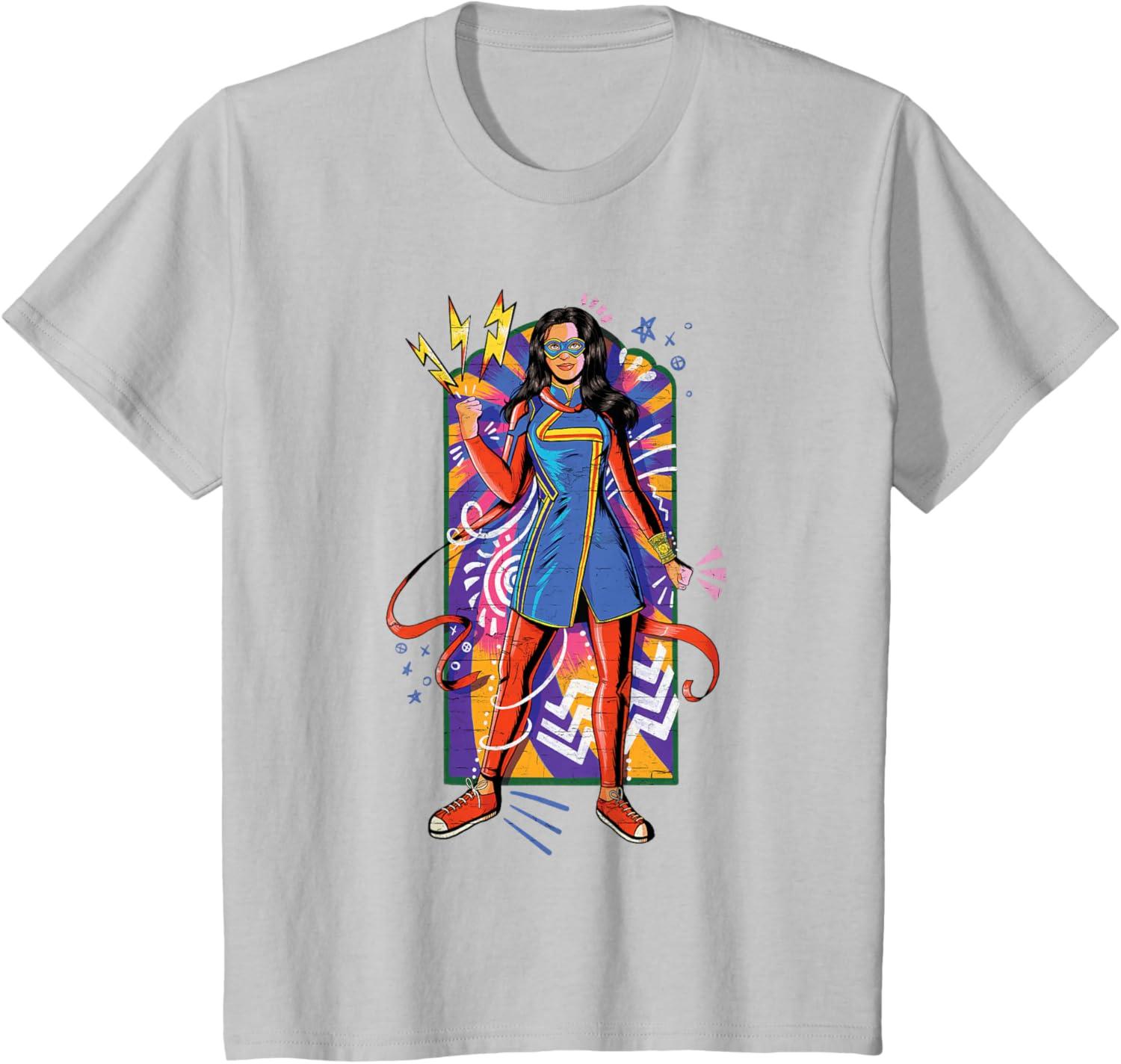 Kamala Khan is a Super Hero! She's a 16-year-old Pakistani-American high school kid from Jersey City who transforms into the type of Super Hero she's always admired. You'll be ready for the Original Series from Marvel Studios with this vibrant, mural-inspired Ms. Marvel tee. Catch Ms. Marvel streaming on Disney+. Available in youth and adult sizes. Find it in a t-shirt, premium t-shirt, tank top, v-neck, long sleeve tee, hoodie, and sweatshirt.