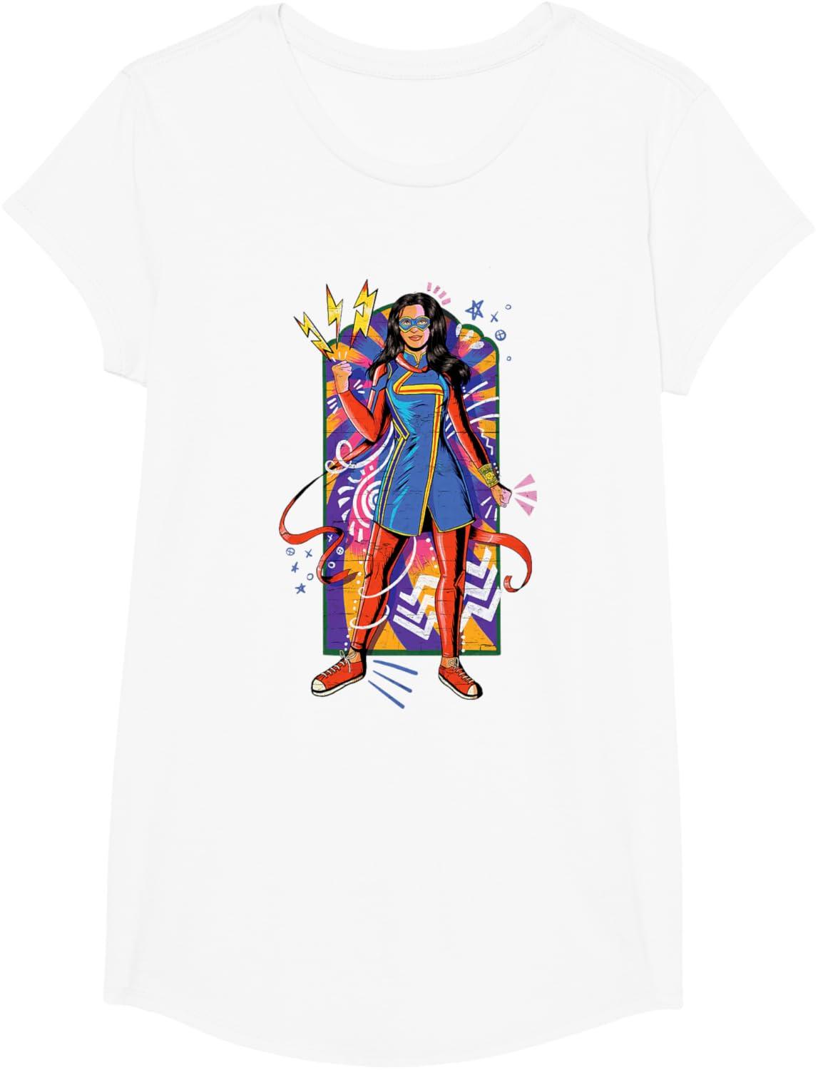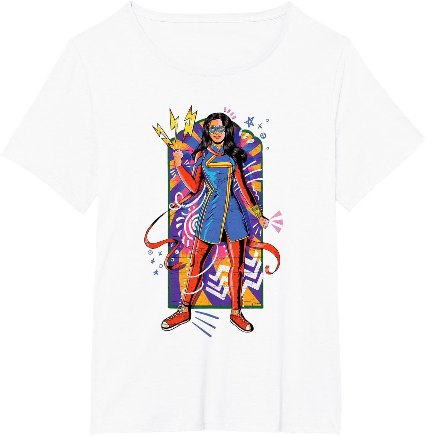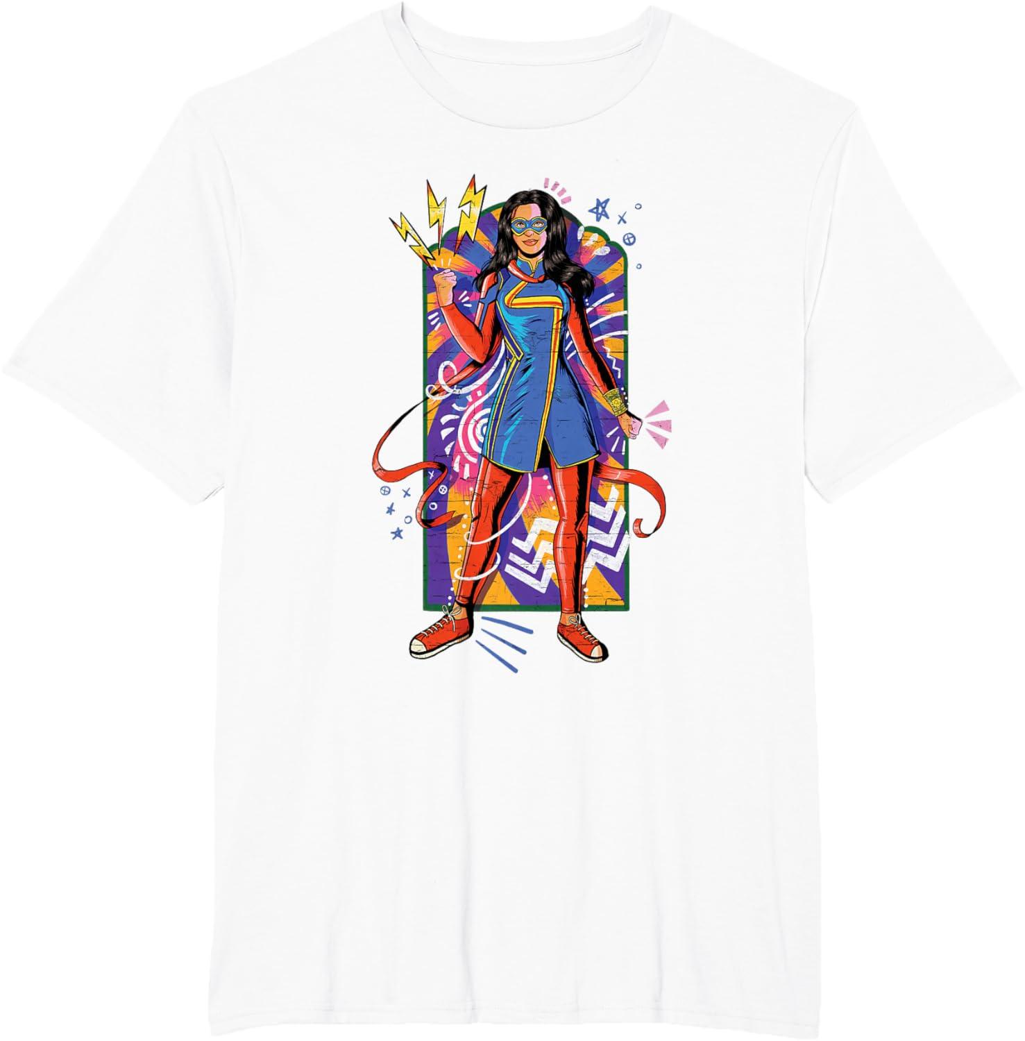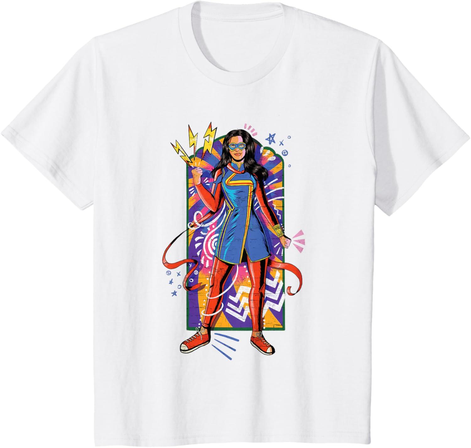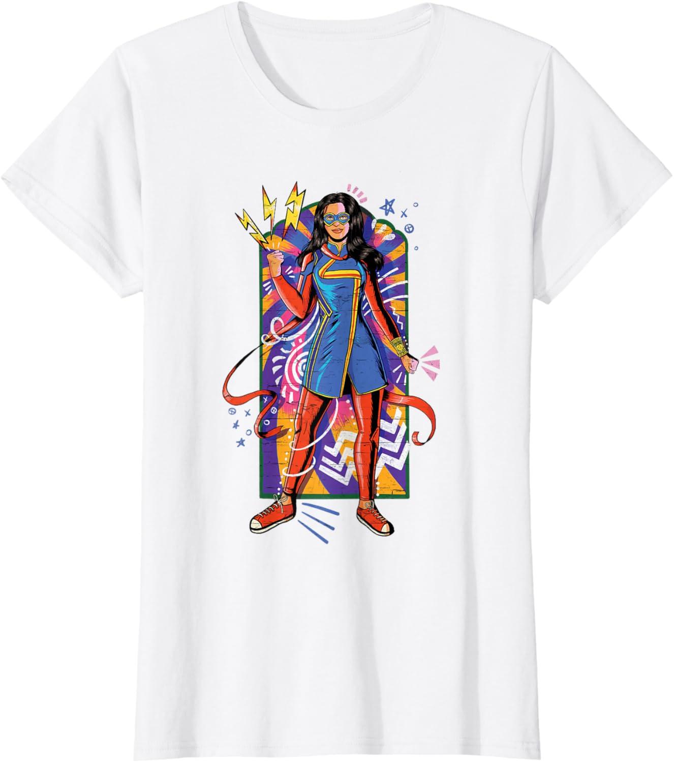 Kamala Khan is a Super Hero! She's a 16-year-old Pakistani-American high school kid from Jersey City who transforms into the type of Super Hero she's always admired. You'll be ready for the Original Series from Marvel Studios with this vibrant, mural-inspired Ms. Marvel tee. Catch Ms. Marvel streaming on Disney+. Available in youth and adult sizes. Find it in a t-shirt, premium t-shirt, tank top, v-neck, long sleeve tee, hoodie, and sweatshirt.