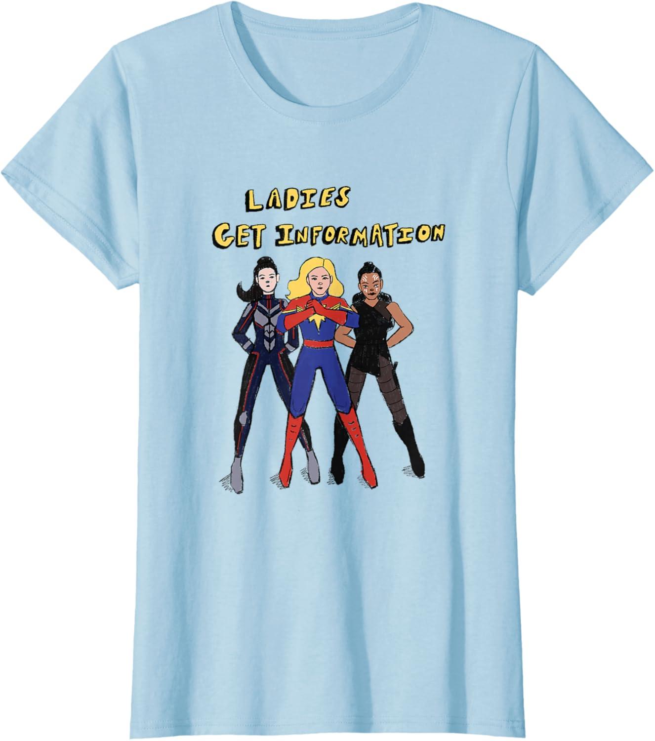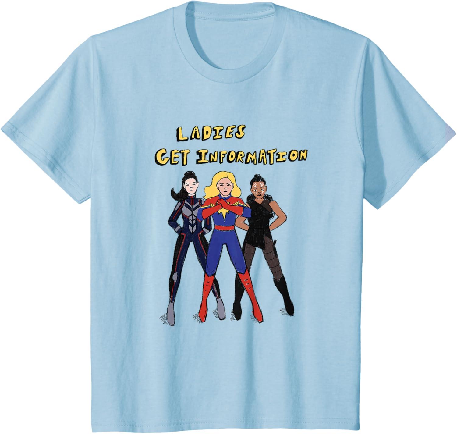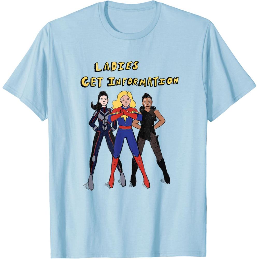 Get to know the 16-year-old Pakistani-American high school kid that transforms into a Super Hero with this cool in-world Marvel tee that reads, “Ladies Get Information.” Showcasing Wasp, Valkyrie, and Captain Marvel this heroic tee is the very same design worn by Kamala Kahn in the series. Catch the Original Series from Marvel Studios, MS. MARVEL, streaming on Disney+. Available in youth and adult sizes. Find it in a t-shirt, premium t-shirt and v-neck.