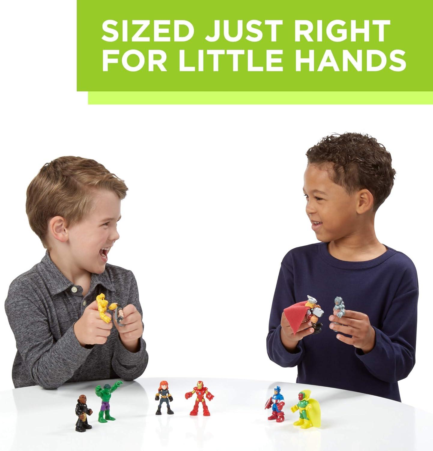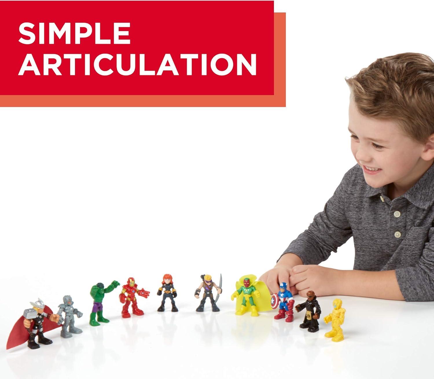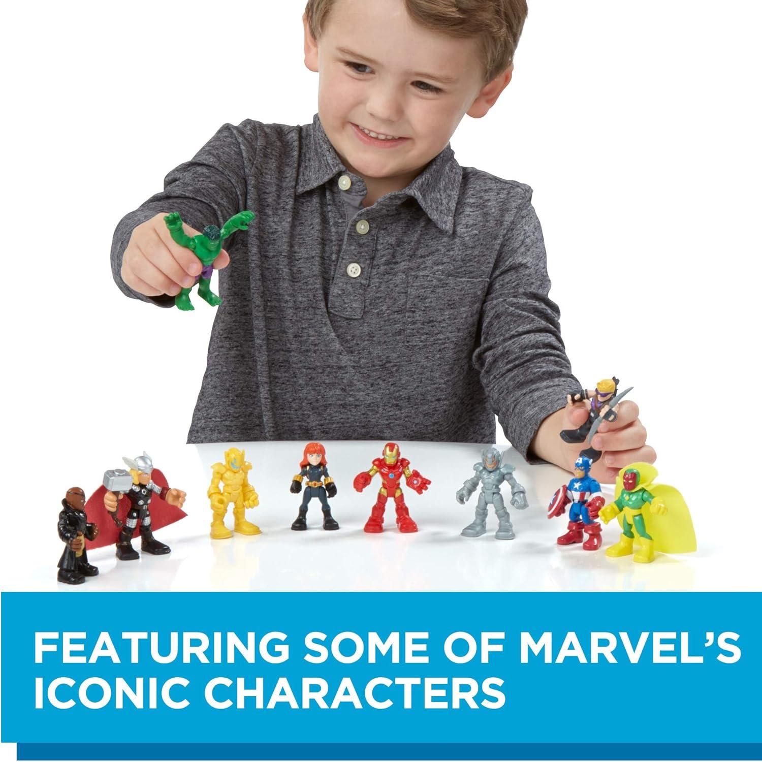 Preschoolers can imagine saving the day alongside the Avengers with this toy set, featuring some of Marvel’s most iconic characters! The Playskool Heroes Marvel Super Hero Adventures collectible toys lets kids ages 3 and up recreate favorite action scenes from the Avengers: Age of Ultron movie. The fun doesn’t end there, though, as boys and girls can imagine their own adventures! The Captain America, Iron Man, Thor, Hulk, Marvel’s Black Widow, and other included figures provide big fun, but are sized right for small hands. Featuring simple articulation, each figure can be posed to fit any mission kids can imagine. Playtime with the Ultimate Super Hero Set can take pretending to save the day with the Avengers to an epic level, and with 10 2.5 inch action figures, kids can start a collection, add to one, or swap with friends! Copyright MARVEL. All trademarks and registered trademarks are the property of their respective owners. Playskool and all related terms are trademarks of Hasbro.