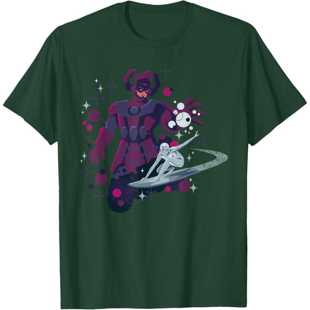 Go cosmic with this official tee or hoodie from Marvel Studios' blockbuster new movie “The Fantastic Four: First Steps”, featuring a colorfully retro, '60s style illustration of the mighty planet devourer Galactus and his herald the Silver Surfer. A great gift for an MCU or Fantastic Four fan! Get multiples and wear matching Fantastic Four t-shirts with friends and family at your super hero themed party, comic convention, or group trip to Disneyland, Walt Disney World, or Avengers Campus at Disney California Adventure Park. Available in youth and adult sizes. Find it in a t-shirt, premium t-shirt, tank top, v-neck, long sleeve tee, hoodie, and sweatshirt.