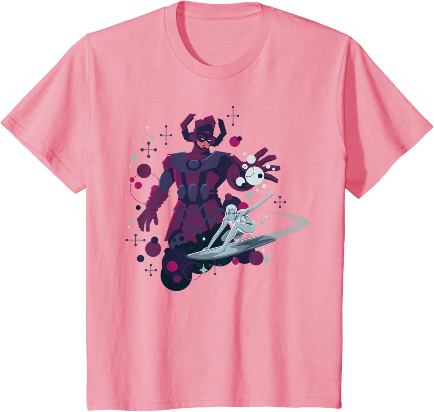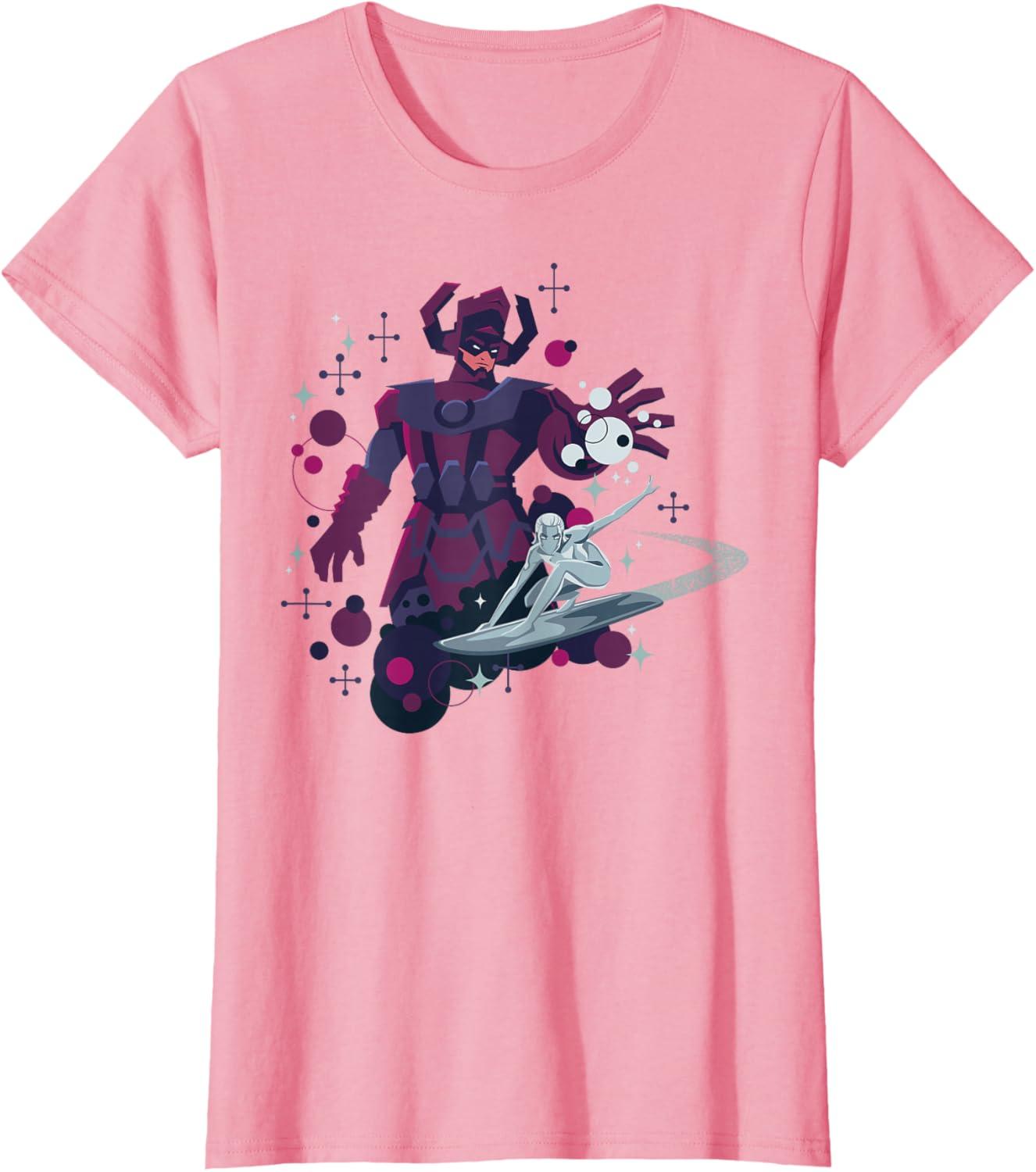Marvel Silver Surfer and Galactus Retro Sixties Stylized T-Shirt(Pink)