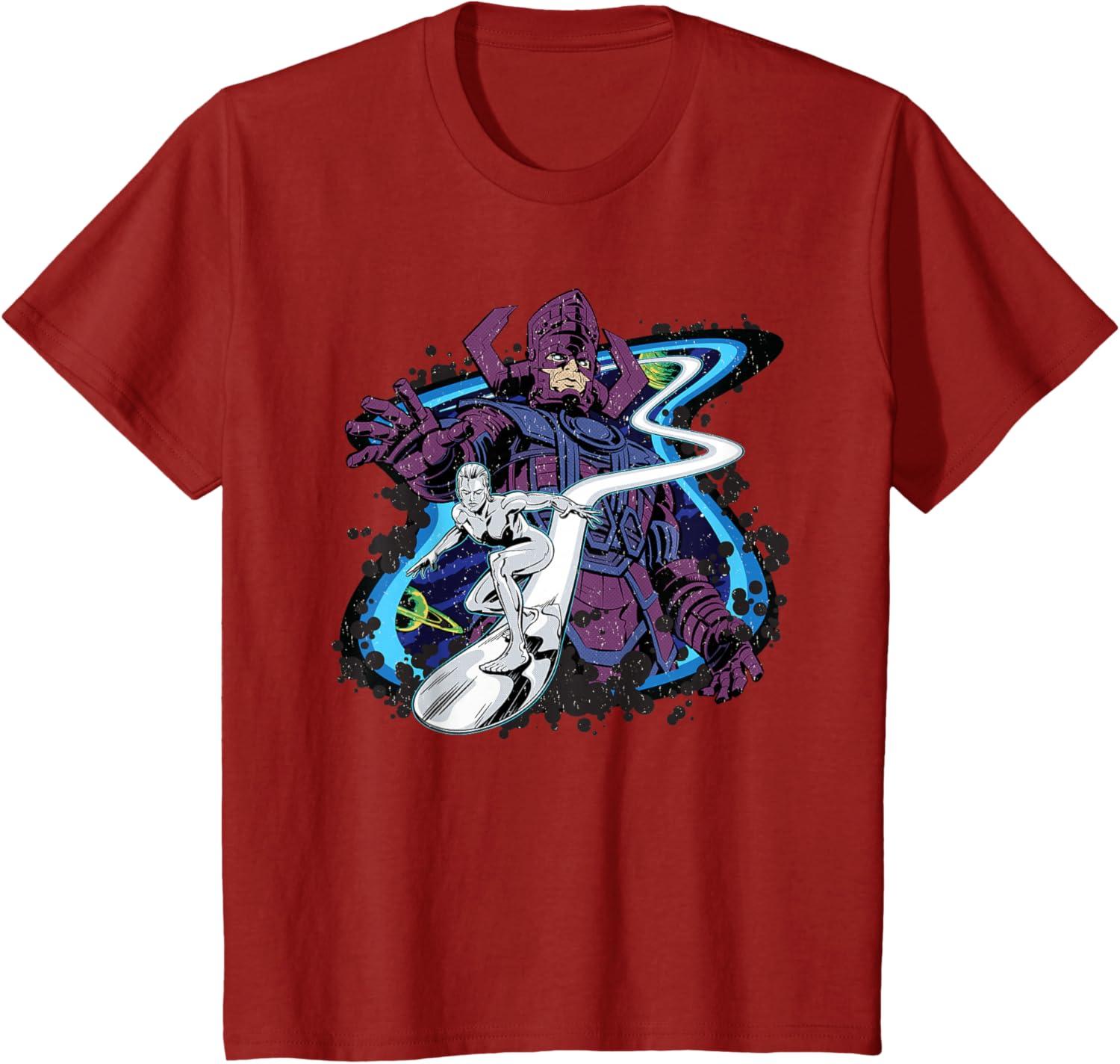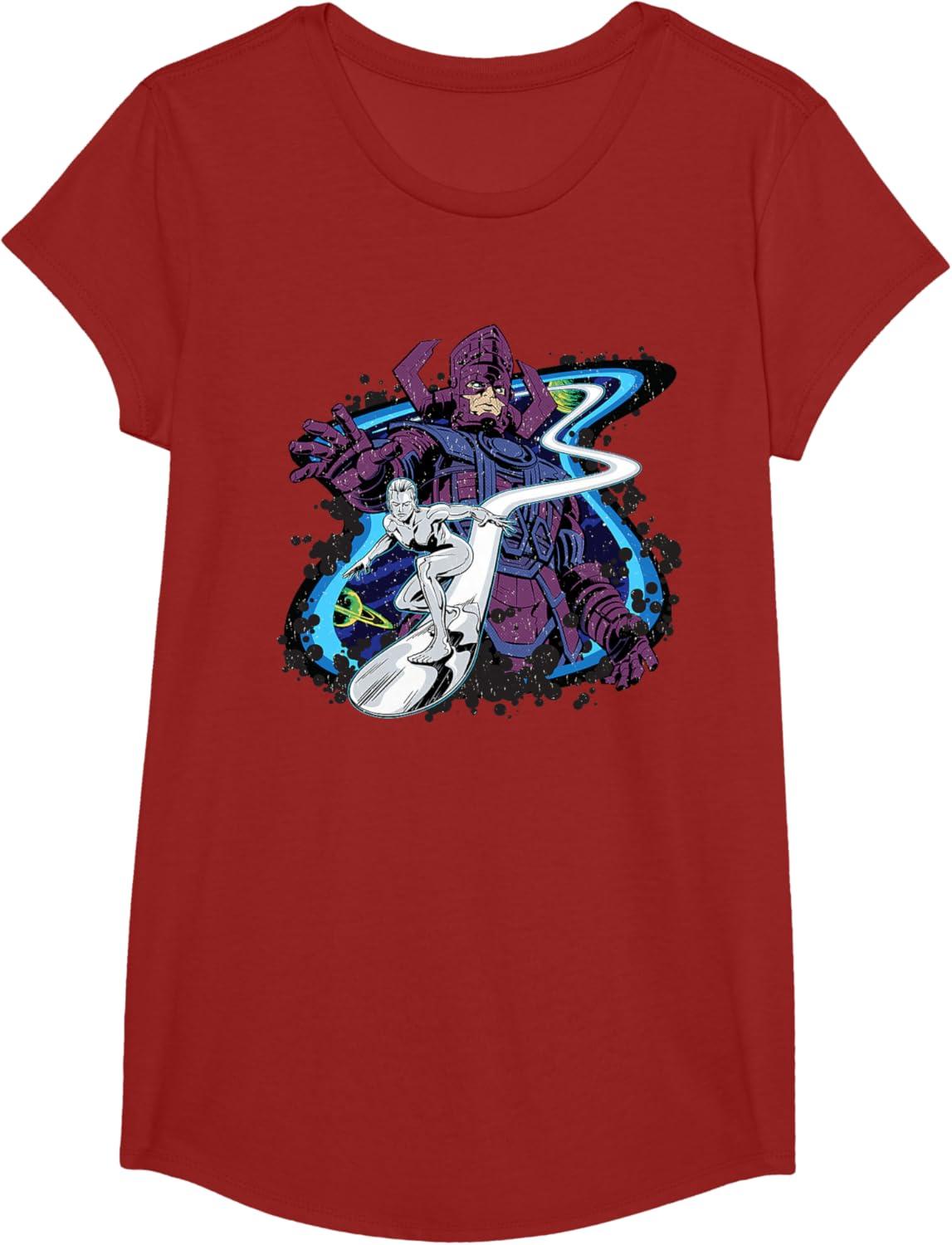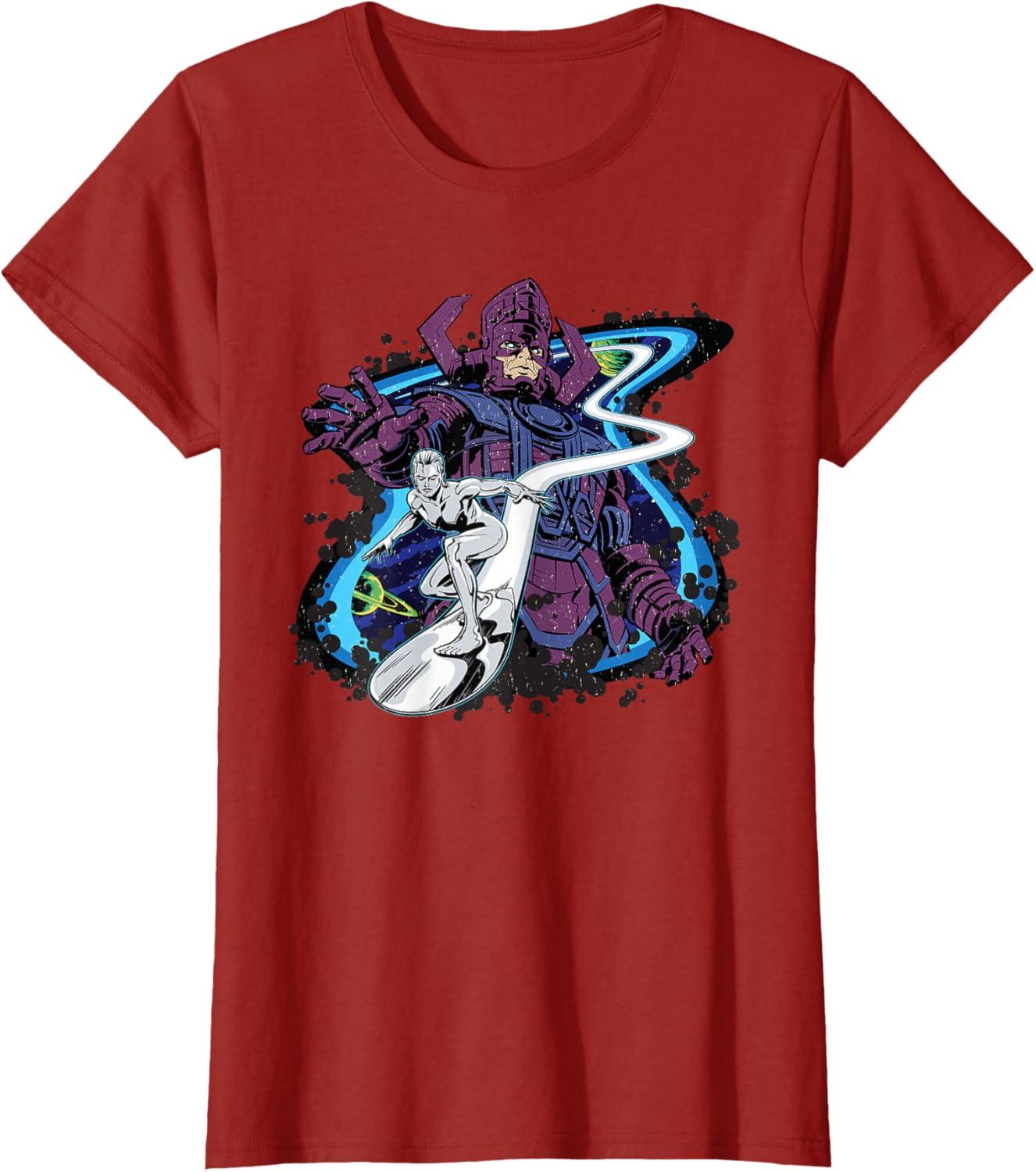 Go cosmic with this official tee or hoodie from Marvel Studios' blockbuster new movie “The Fantastic Four: First Steps”, featuring a colorful comic-style illustration of the mighty planet devourer Galactus and his herald the Silver Surfer with a distressed print effect for a fashionably vintage look. A great gift for an MCU or Fantastic Four fan! Get multiples and wear matching Fantastic Four t-shirts with friends and family at your super hero themed party, comic convention, or group trip to Disneyland, Walt Disney World, or Avengers Campus at Disney California Adventure Park. Available in youth and adult sizes. Find it in a t-shirt, premium t-shirt, tank top, v-neck, long sleeve tee, hoodie, and sweatshirt.