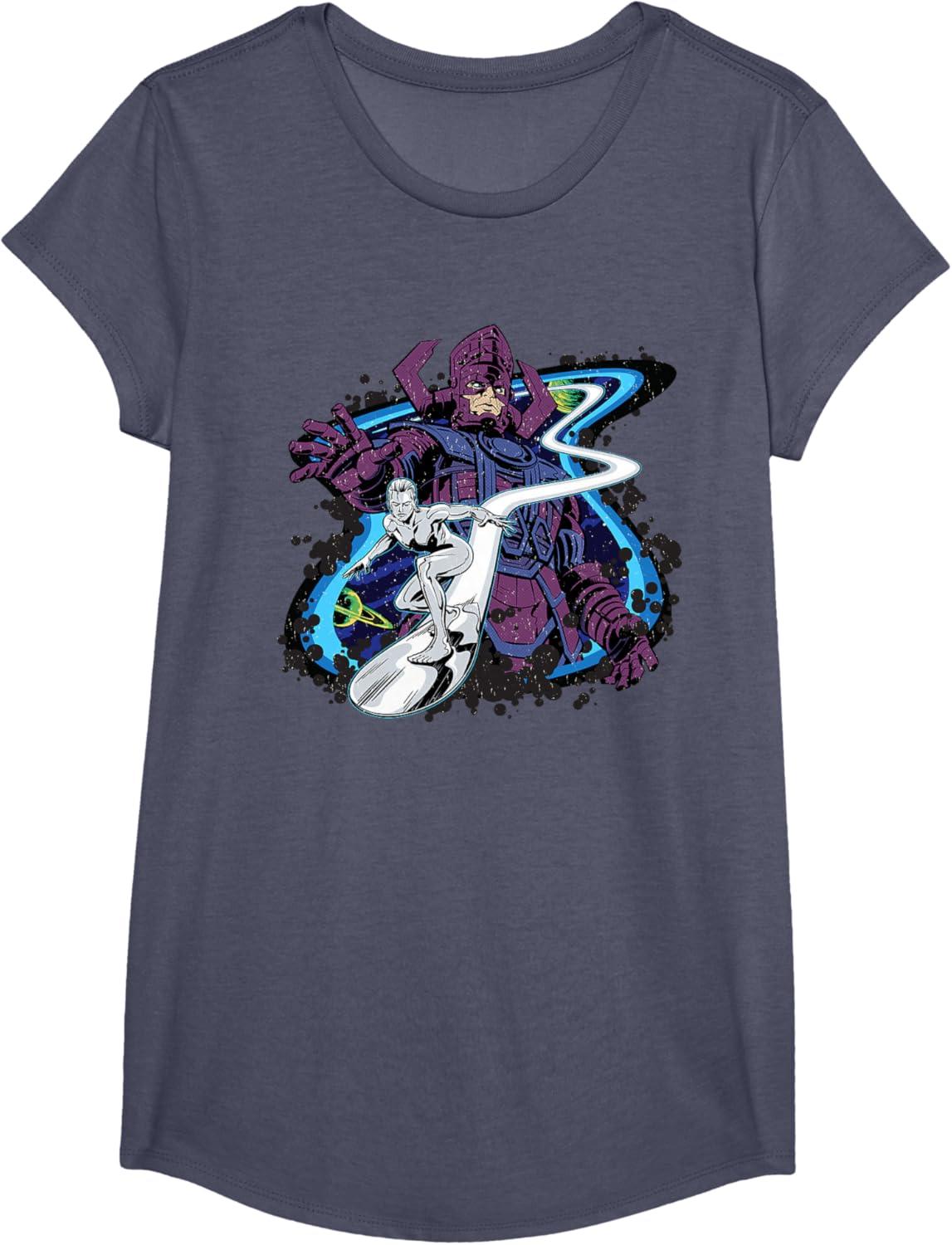 Go cosmic with this official tee or hoodie from Marvel Studios' blockbuster new movie “The Fantastic Four: First Steps”, featuring a colorful comic-style illustration of the mighty planet devourer Galactus and his herald the Silver Surfer with a distressed print effect for a fashionably vintage look. A great gift for an MCU or Fantastic Four fan! Get multiples and wear matching Fantastic Four t-shirts with friends and family at your super hero themed party, comic convention, or group trip to Disneyland, Walt Disney World, or Avengers Campus at Disney California Adventure Park. Available in youth and adult sizes. Find it in a t-shirt, premium t-shirt, tank top, v-neck, long sleeve tee, hoodie, and sweatshirt.