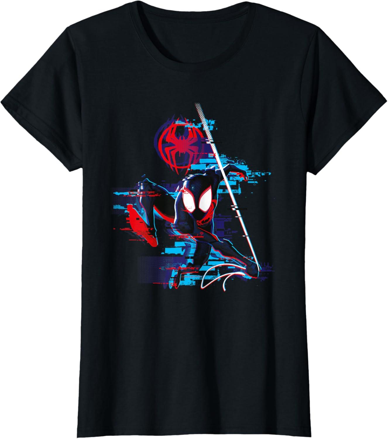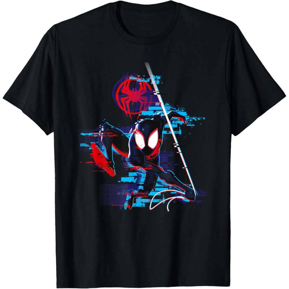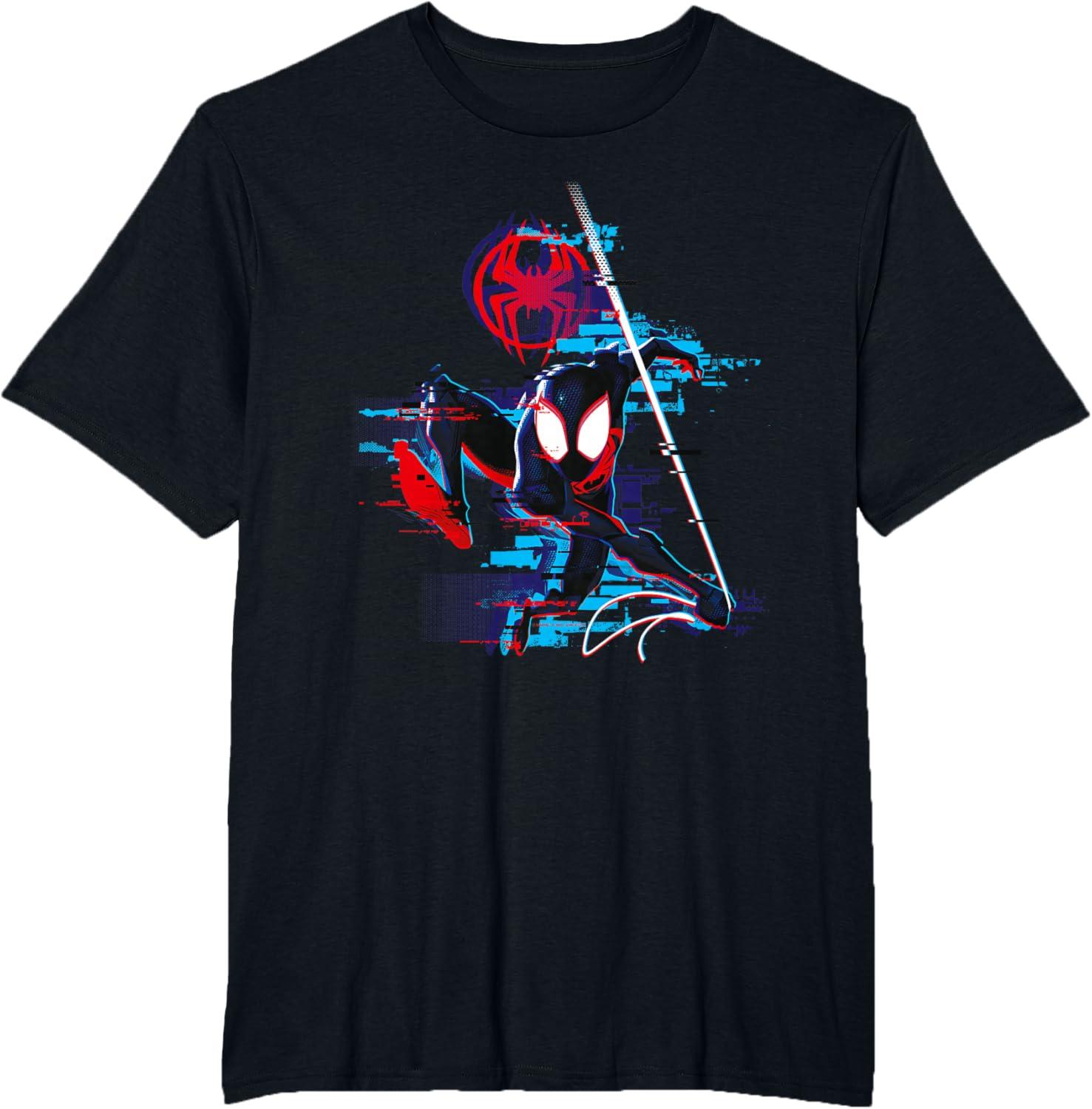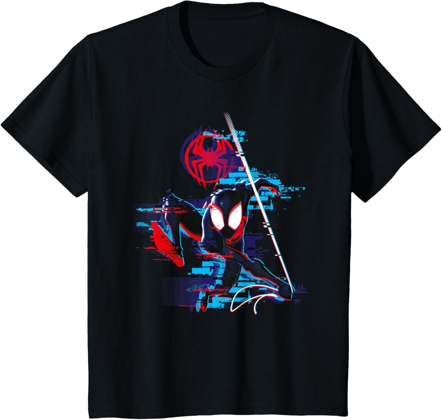 Miles Morales as the all-new Spider-Man web-swings into action accompanied by his graffiti street art-inspired spider-symbol icon in the middle of a multiverse-spanning dimensional glitch! This exciting and action-packed official Marvel graphic tee or hoodie from the new “Spider-Man: Across the Spider-Verse” movie sequel makes a great gift for a Miles Morales, Spider-Man, or Marvel fan. Available in youth and adult sizes. Find it in a t-shirt, premium t-shirt, tank top, v-neck, long sleeve tee, hoodie, and sweatshirt.