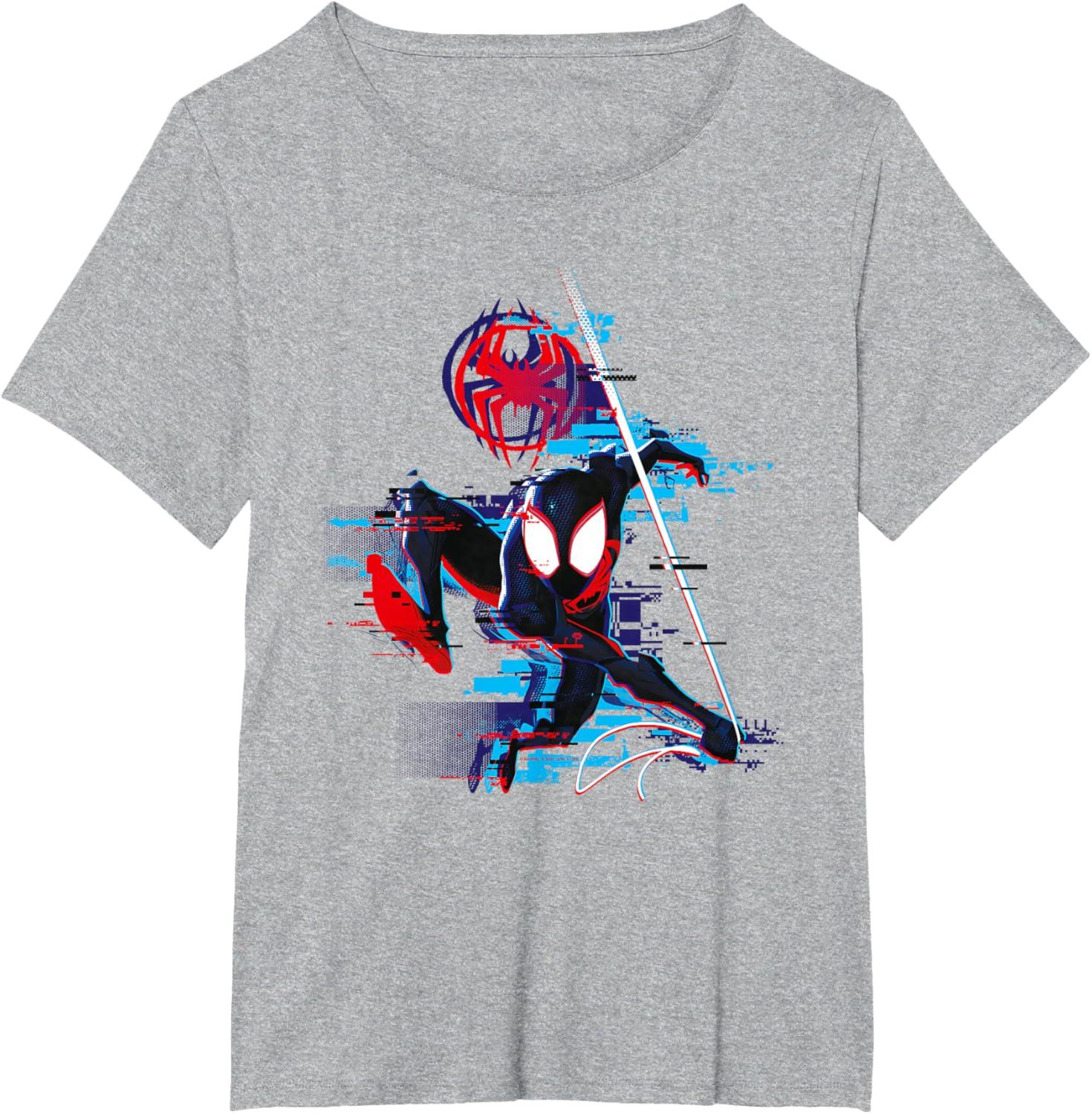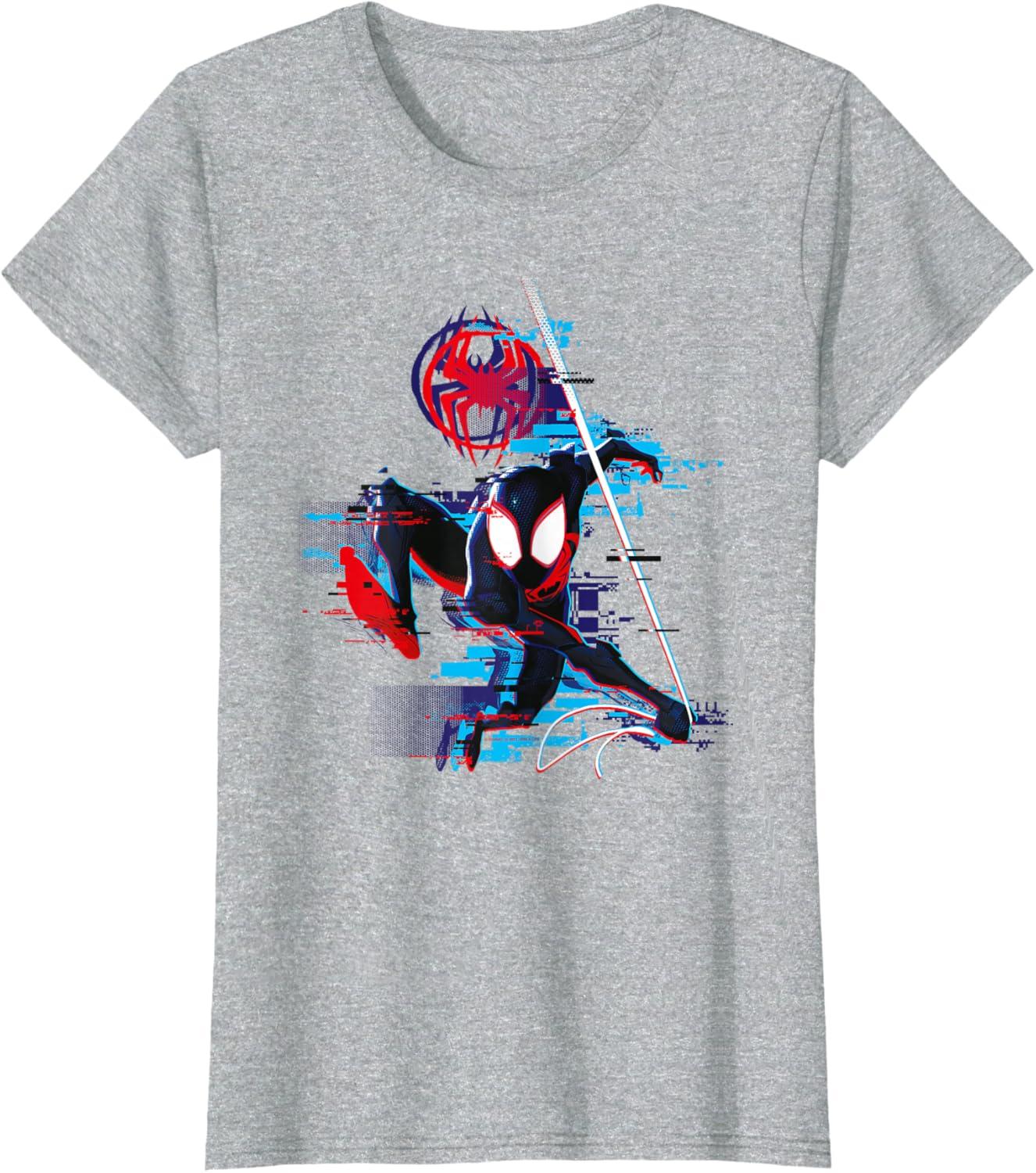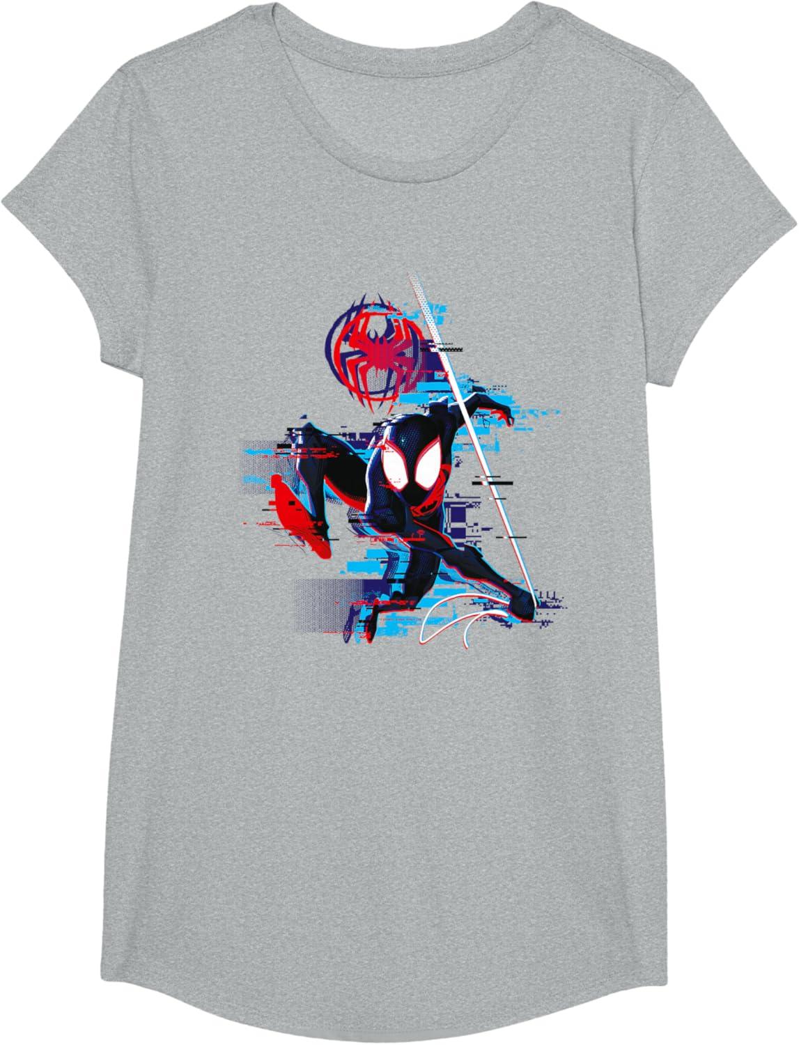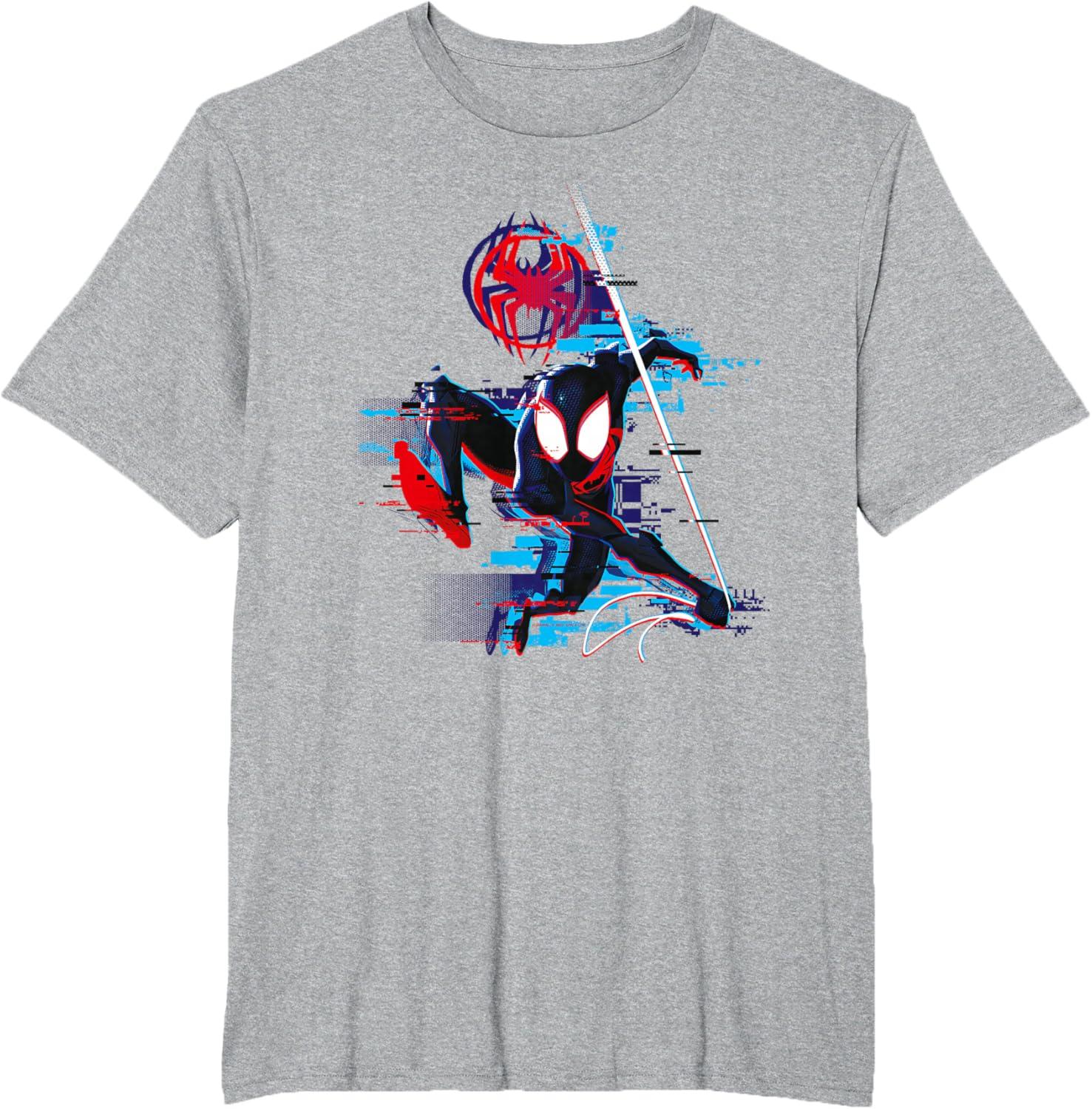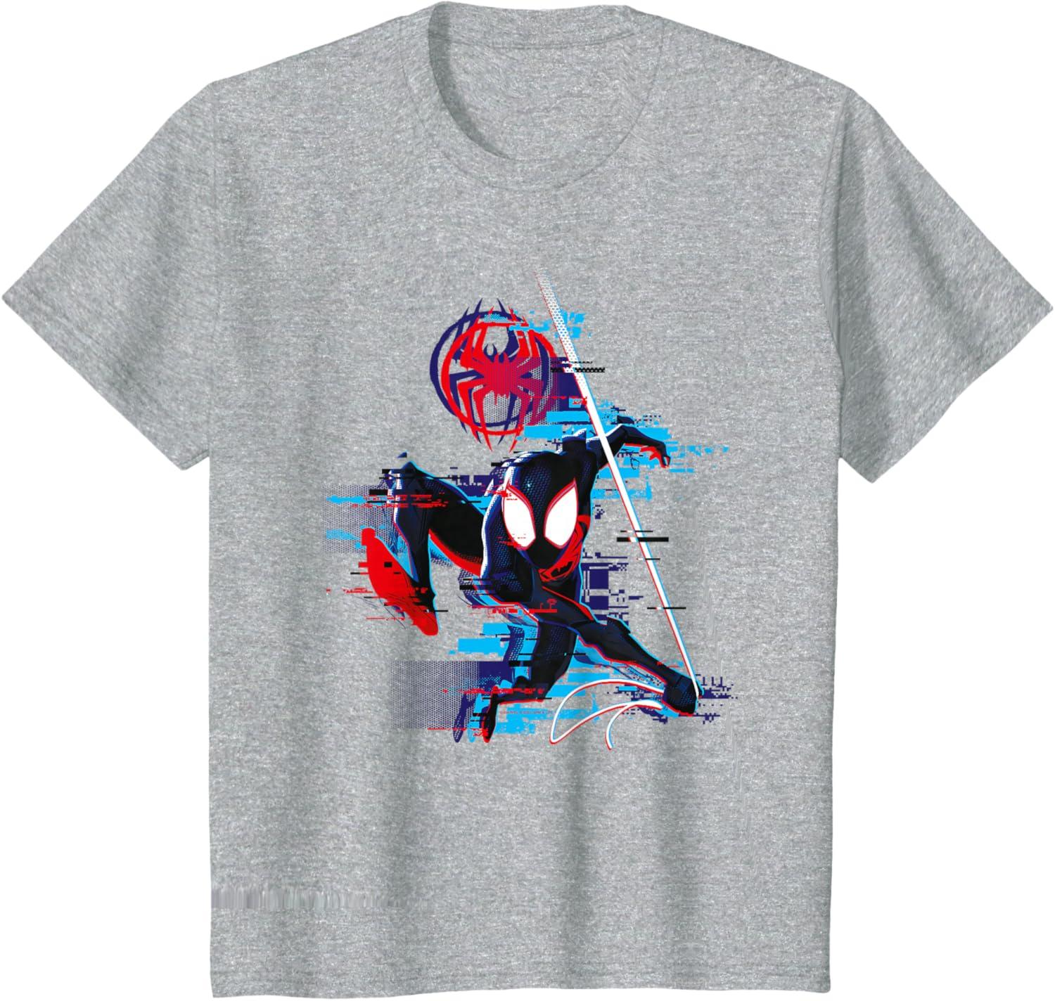 Miles Morales as the all-new Spider-Man web-swings into action accompanied by his graffiti street art-inspired spider-symbol icon in the middle of a multiverse-spanning dimensional glitch! This exciting and action-packed official Marvel graphic tee or hoodie from the new “Spider-Man: Across the Spider-Verse” movie sequel makes a great gift for a Miles Morales, Spider-Man, or Marvel fan. Available in youth and adult sizes. Find it in a t-shirt, premium t-shirt, tank top, v-neck, long sleeve tee, hoodie, and sweatshirt.