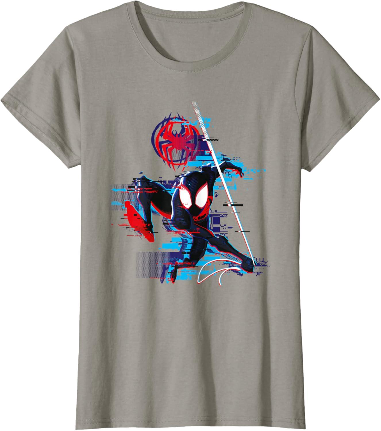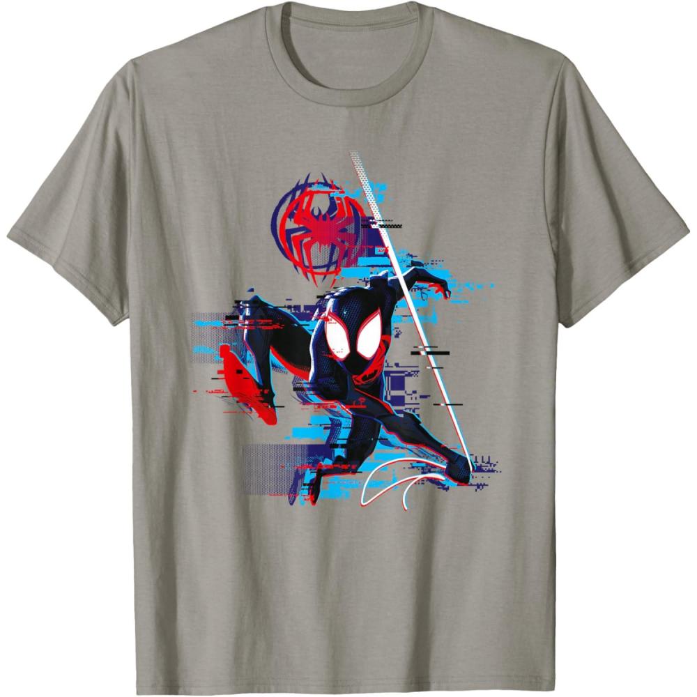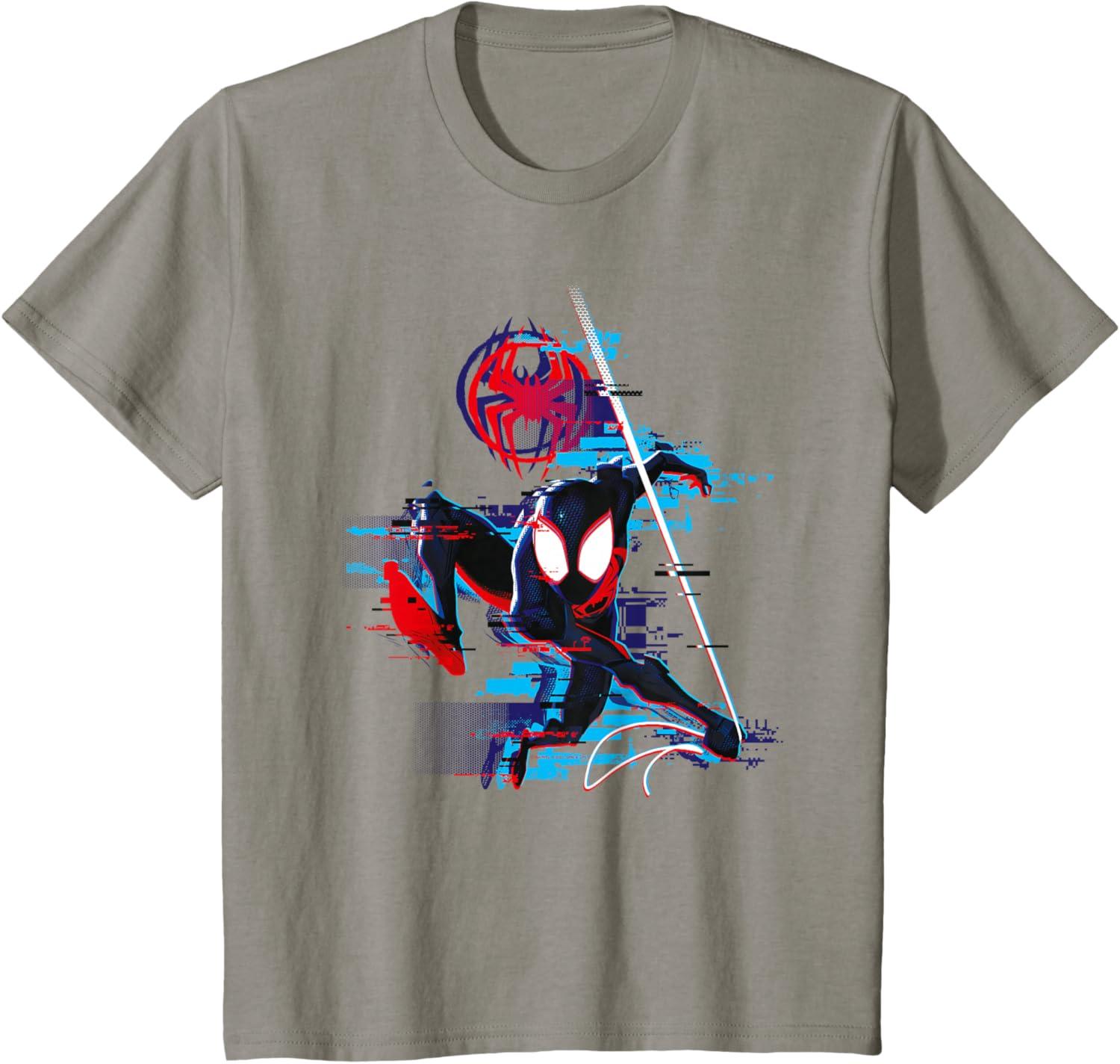 Miles Morales as the all-new Spider-Man web-swings into action accompanied by his graffiti street art-inspired spider-symbol icon in the middle of a multiverse-spanning dimensional glitch! This exciting and action-packed official Marvel graphic tee or hoodie from the new “Spider-Man: Across the Spider-Verse” movie sequel makes a great gift for a Miles Morales, Spider-Man, or Marvel fan. Available in youth and adult sizes. Find it in a t-shirt, premium t-shirt, tank top, v-neck, long sleeve tee, hoodie, and sweatshirt.