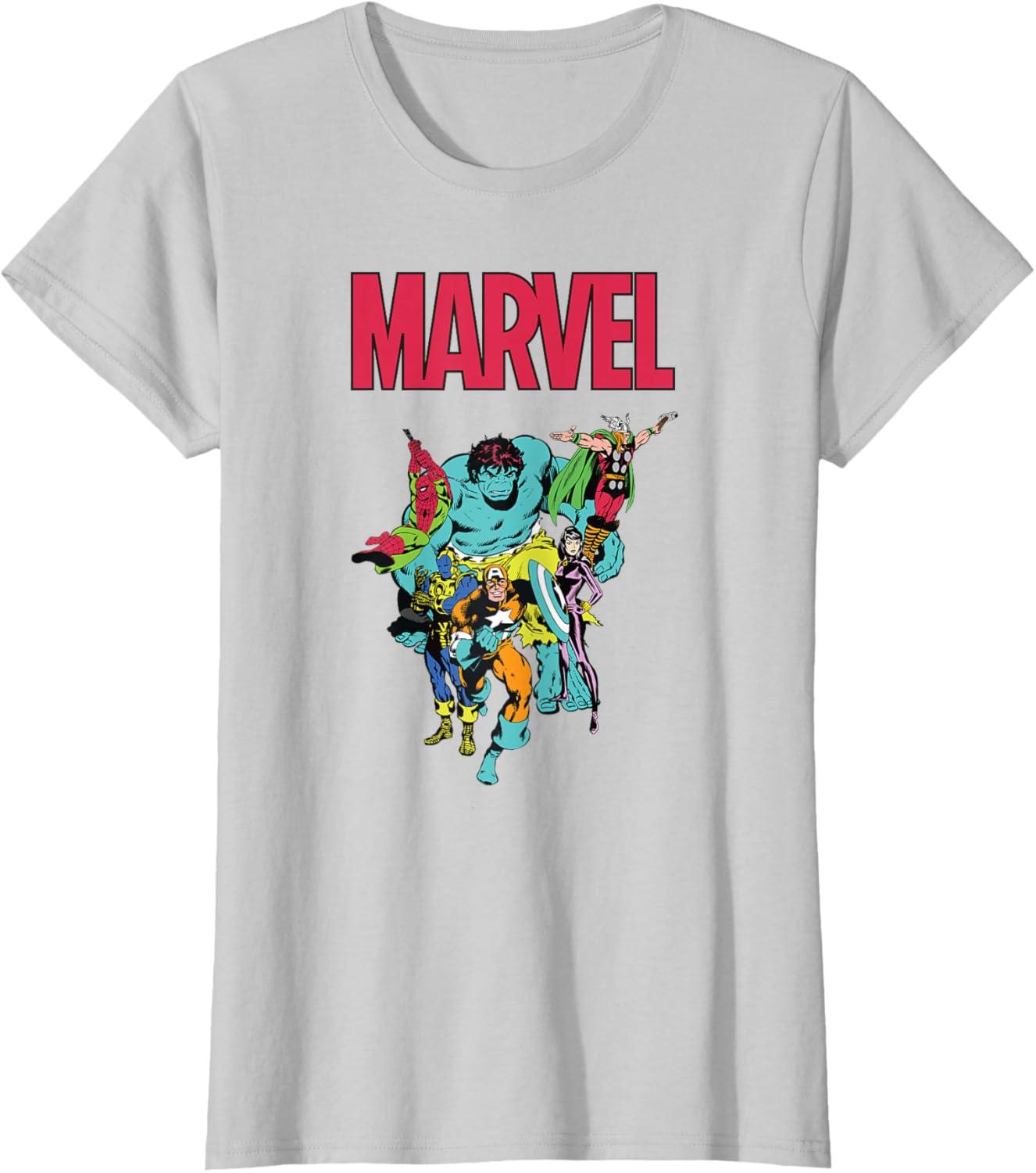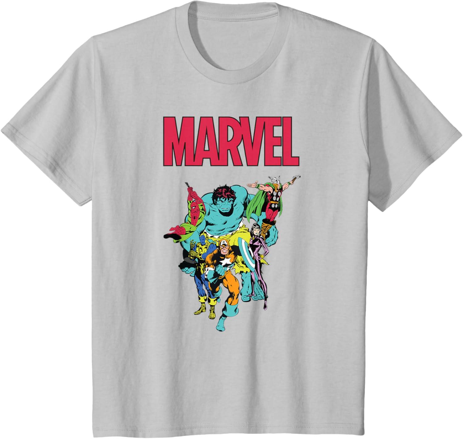 Make your love of Marvel Super Heroes a little bit retro with this official Marvel tee and hoodie, featuring eye-catchingly colored Silver Age comic art of Captain America, Iron Man, the Hulk, Thor, Black Widow, and Spider-Man, with the iconic Marvel logo above. A great gift for a Marvel, Avengers, or Spider-Man fan! Planning a trip to Avengers Campus at Disney California Adventure Park or another super destination? Get multiples to coordinate and match with friends and family for even more superhero-sized fun! Available in youth and adult sizes. Find it in a t-shirt, premium t-shirt, tank top, v-neck, long sleeve tee, hoodie, and sweatshirt.