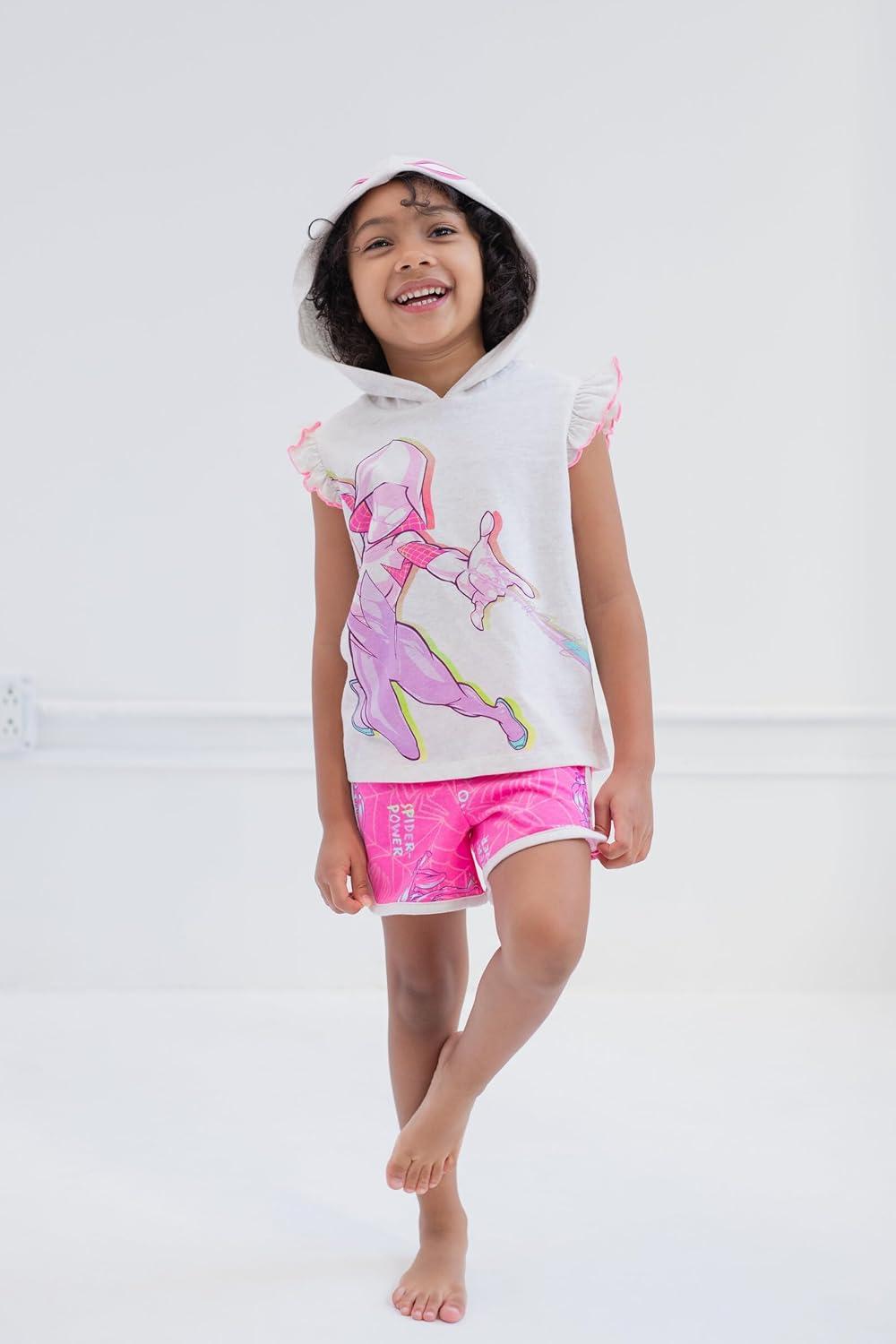 Are your Spidey senses tingling? Get ready for a fun superhero adventure in this cool Spiderman cosplay outfit! This comfy hooded tee and dolphin shorts set features an easy-to-dress design, pretty flutter sleeves, and vibrant Spider-Verse artwork of the Amazing Spider-Man and Spider-Gwen a.k.a. Ghost Spider that your little girl will love to wear! Soft and comfortable, this fashionable Marvel outfit is the perfect summer and spring essential for your little hero to play in all day!