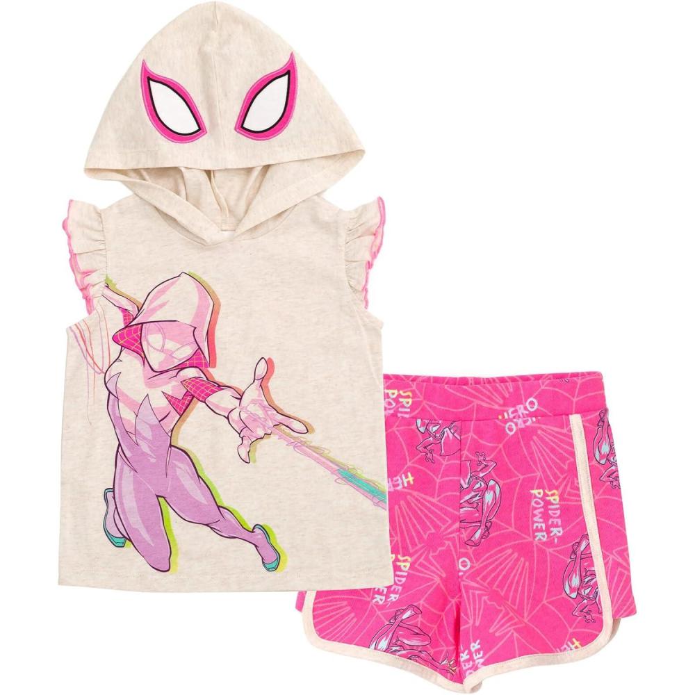 Are your Spidey senses tingling? Get ready for a fun superhero adventure in this cool Spiderman cosplay outfit! This comfy hooded tee and dolphin shorts set features an easy-to-dress design, pretty flutter sleeves, and vibrant Spider-Verse artwork of the Amazing Spider-Man and Spider-Gwen a.k.a. Ghost Spider that your little girl will love to wear! Soft and comfortable, this fashionable Marvel outfit is the perfect summer and spring essential for your little hero to play in all day!