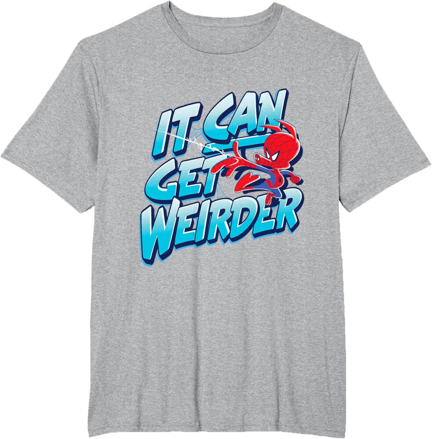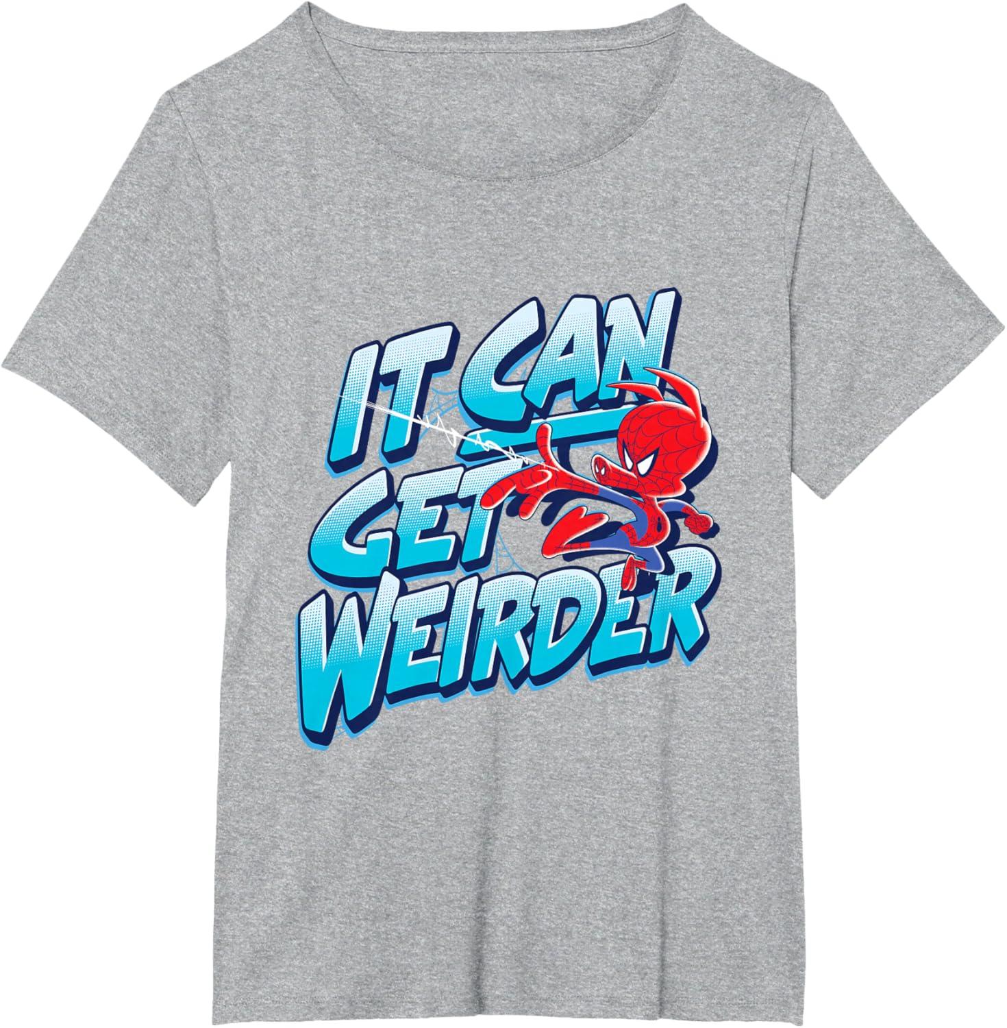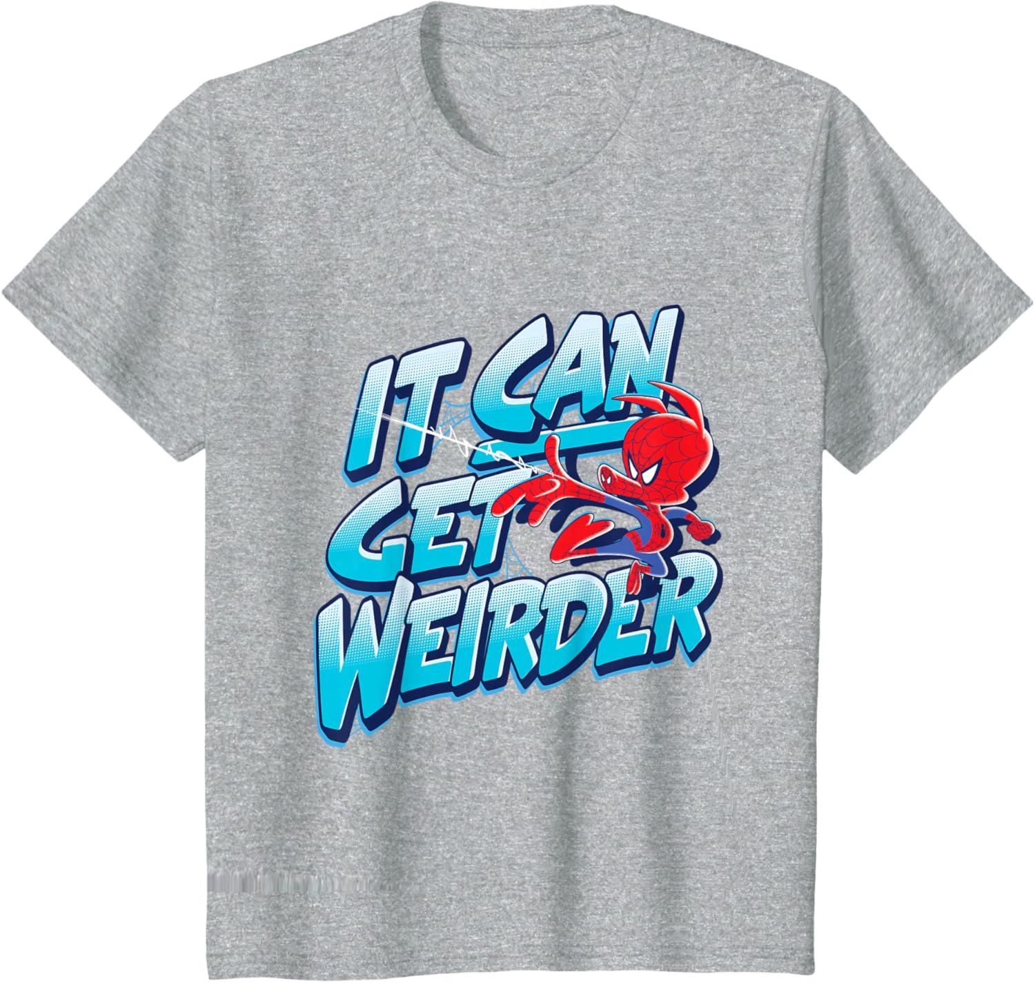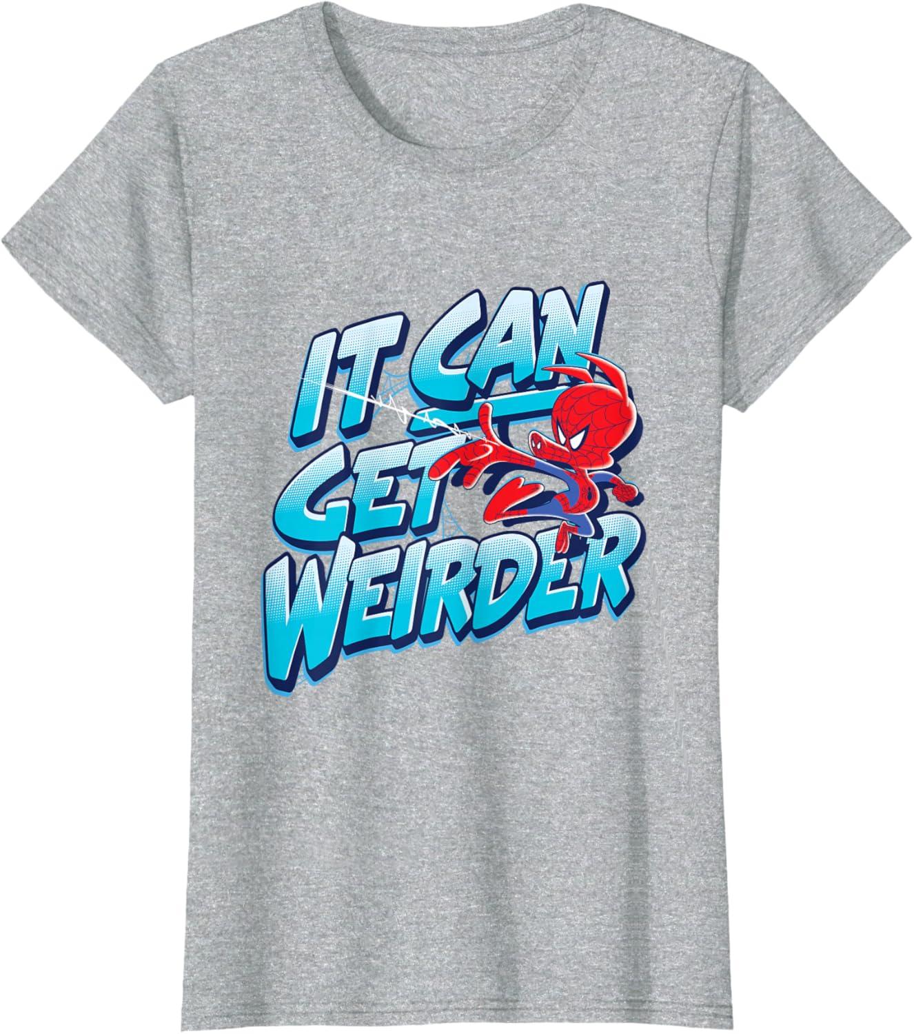 Spider-Ham fires his web shooter on the front of this graphic tee shirt featuring blue comic-style lettering. Peter Porker, the Spectacular Spider-Ham, tells us that “it can get weirder” when alternate versions of Spidey come together in Spider-Man: Into the Spider-Verse. But since this adorable pig helps Miles Morales battle the evil Kingpin, weird can be a good thing. This Spider-Ham t-shirt makes the perfect gift for Marvel fans.