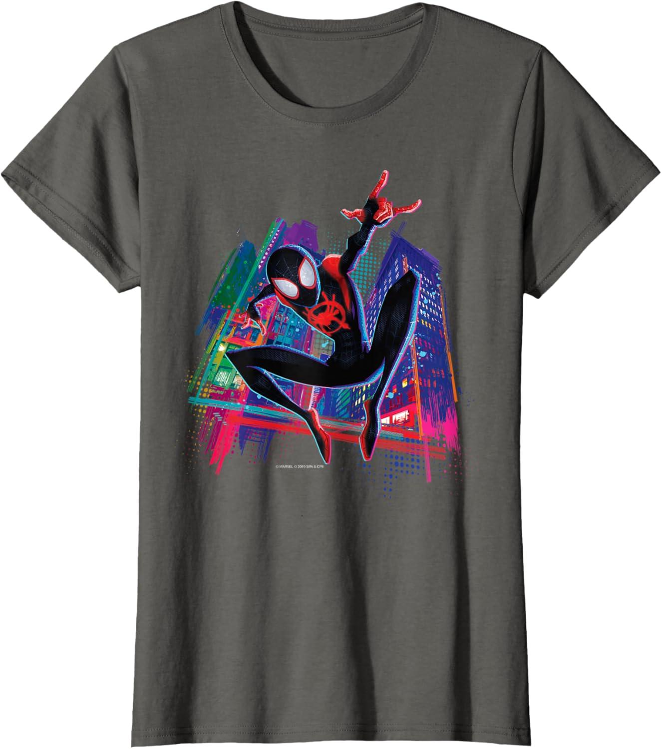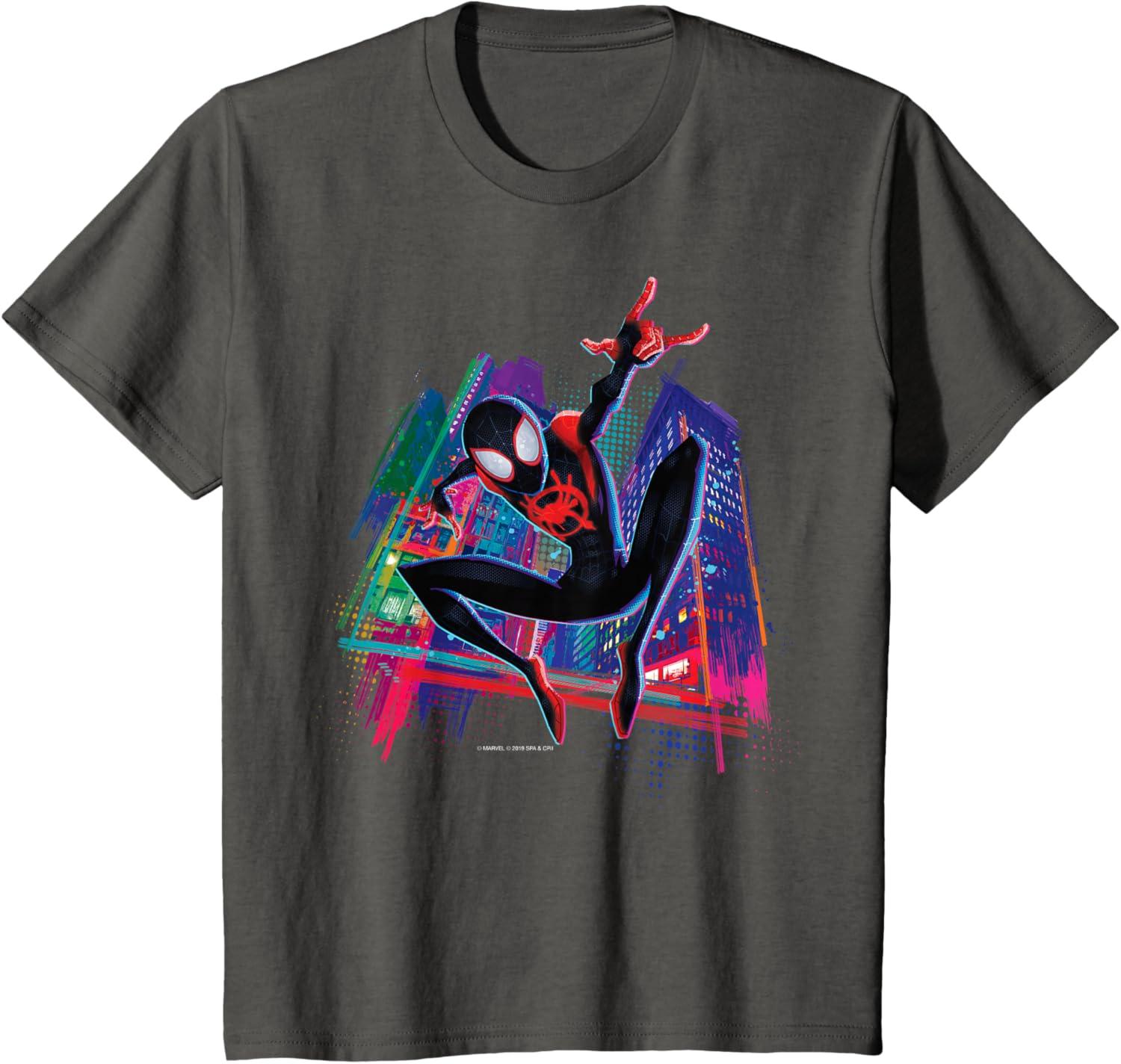 Without Peter Parker, how will Miles Morales leave his mark on the city as the one and only Spider-Man? This awesome shirt features art inspired by Spider-Man: Into the Spider-Verse with Miles in his black spider suit against New York City high rises. Fans of the movie will recognize Miles' spider logo in red spray paint on his chest. Searching for the perfect gift for Marvel fans? This shirt will not disappoint.