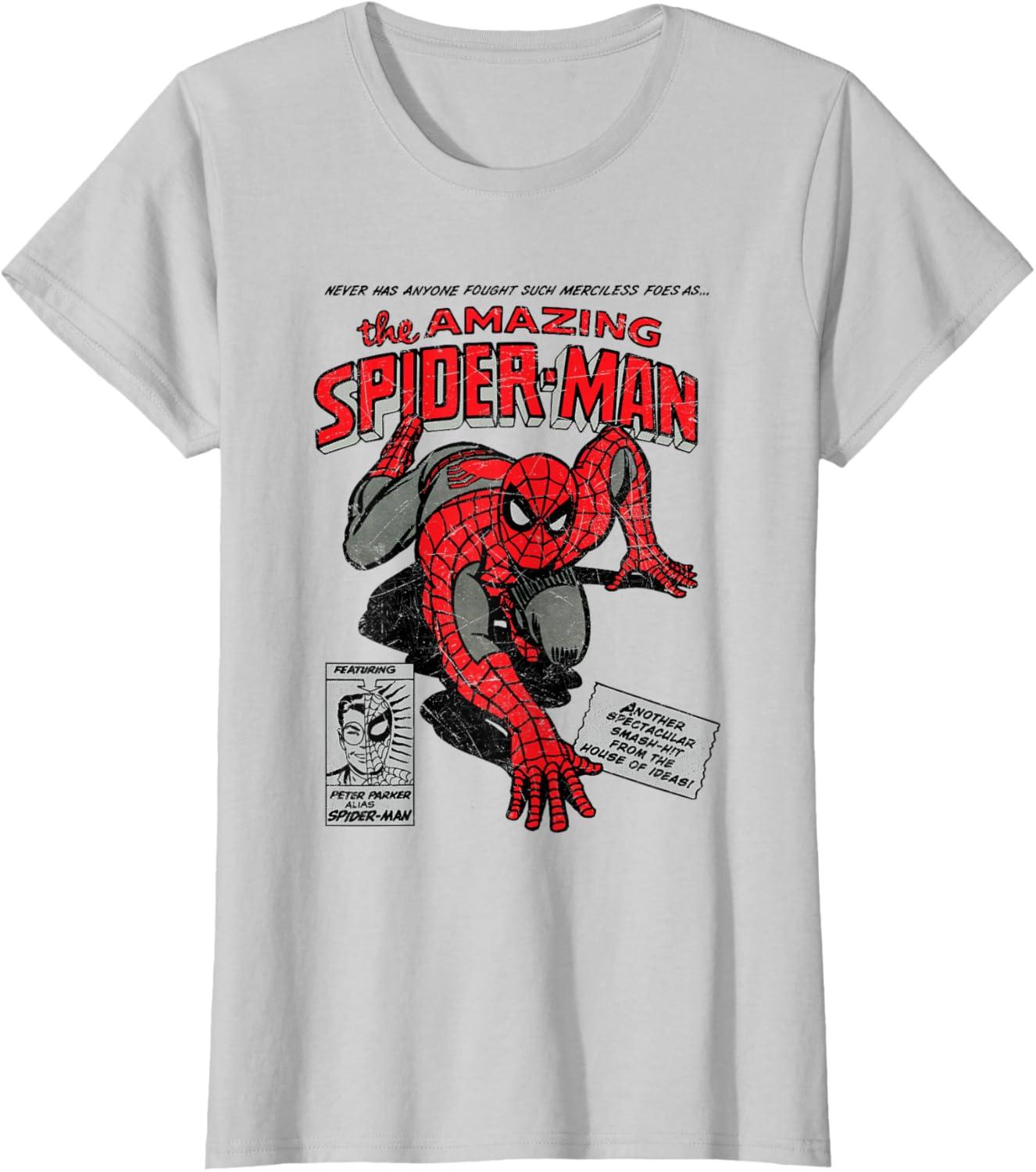 The Amazing Spider-Man, aka Peter Parker, looks ready to fight his foes on this vintage Marvel comics design. Add your favorite Super Hero to your tee shirt rotation with this retro version of Spidey featuring comic blurbs and a distressed design. Searching for the perfect gift for Marvel fans? This awesome t-shirt won't disappoint.