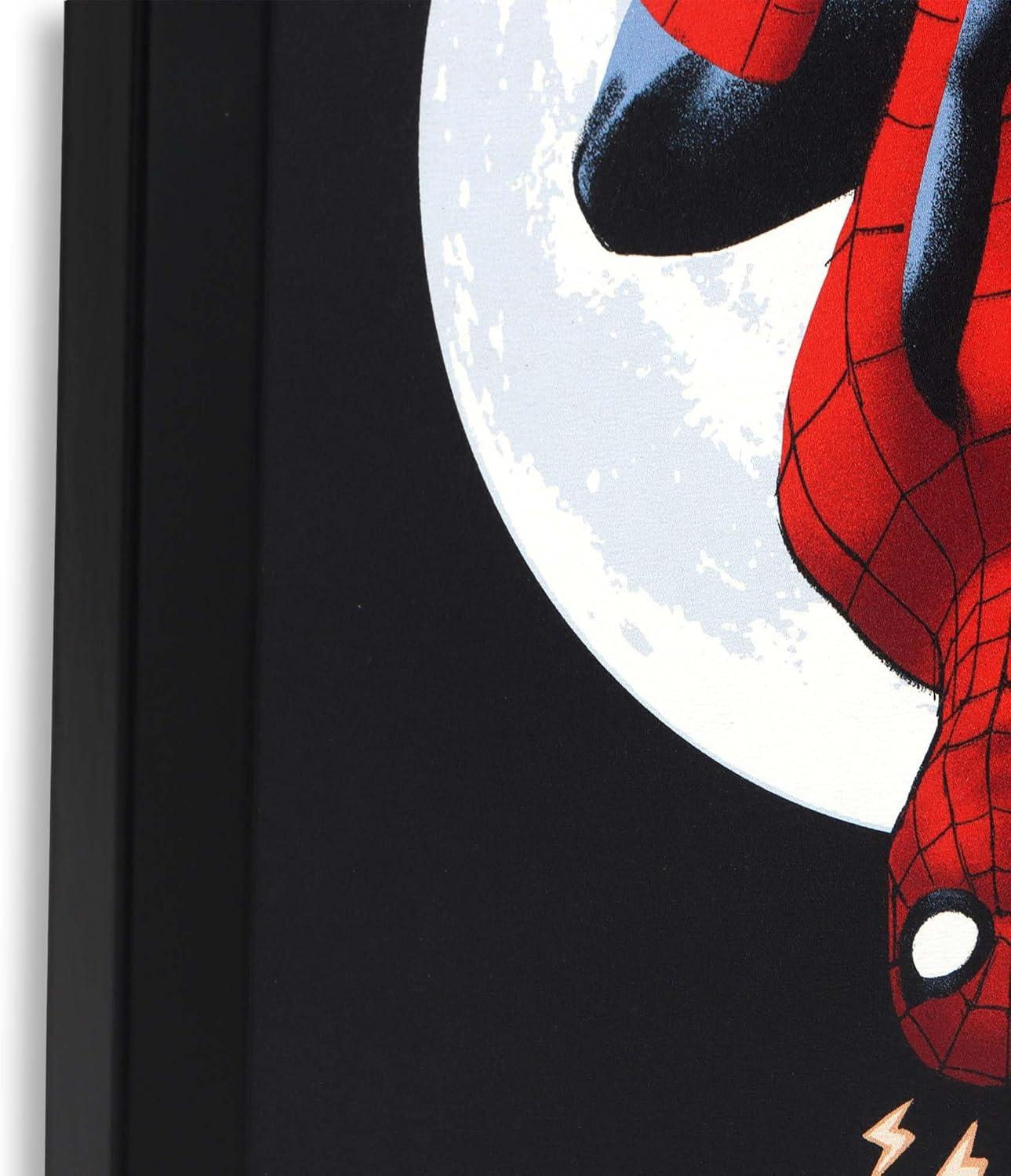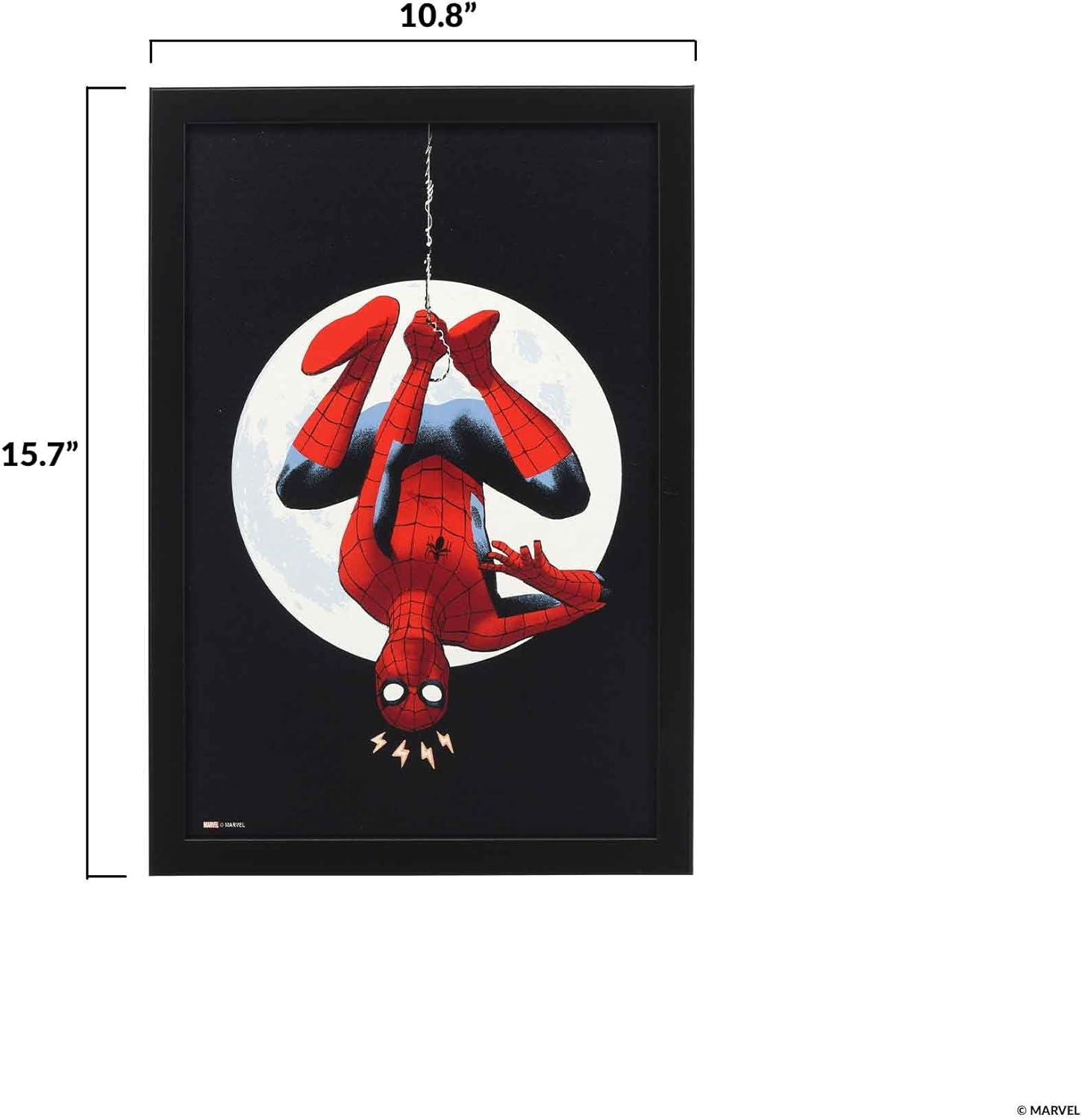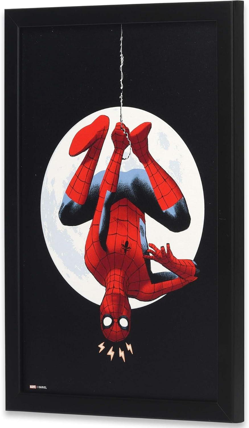 Framed Wall Decor: Featuring Spider-Man dangling upside-down from his web against a pitch black, moon-centered background, this sign is a perfectly simple, yet incredibly dynamic addition to your superhero-themed space.