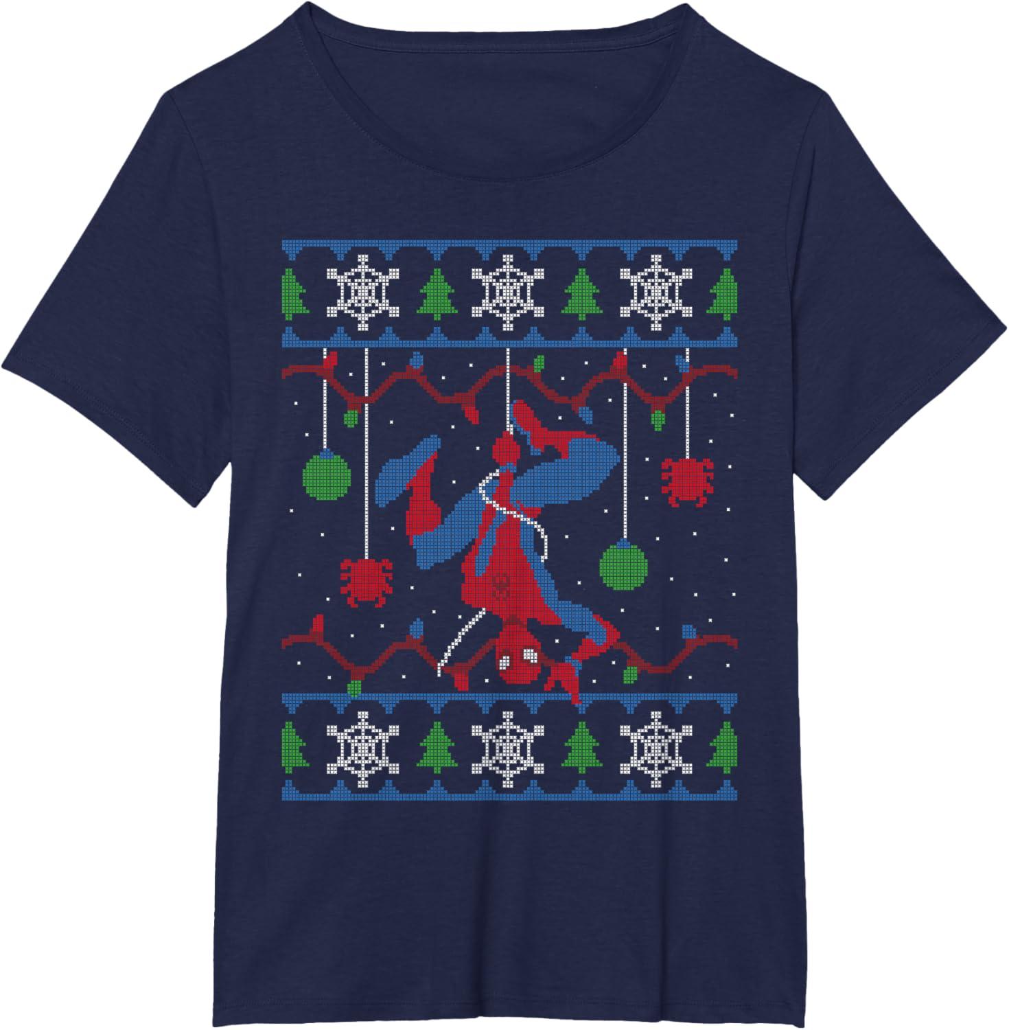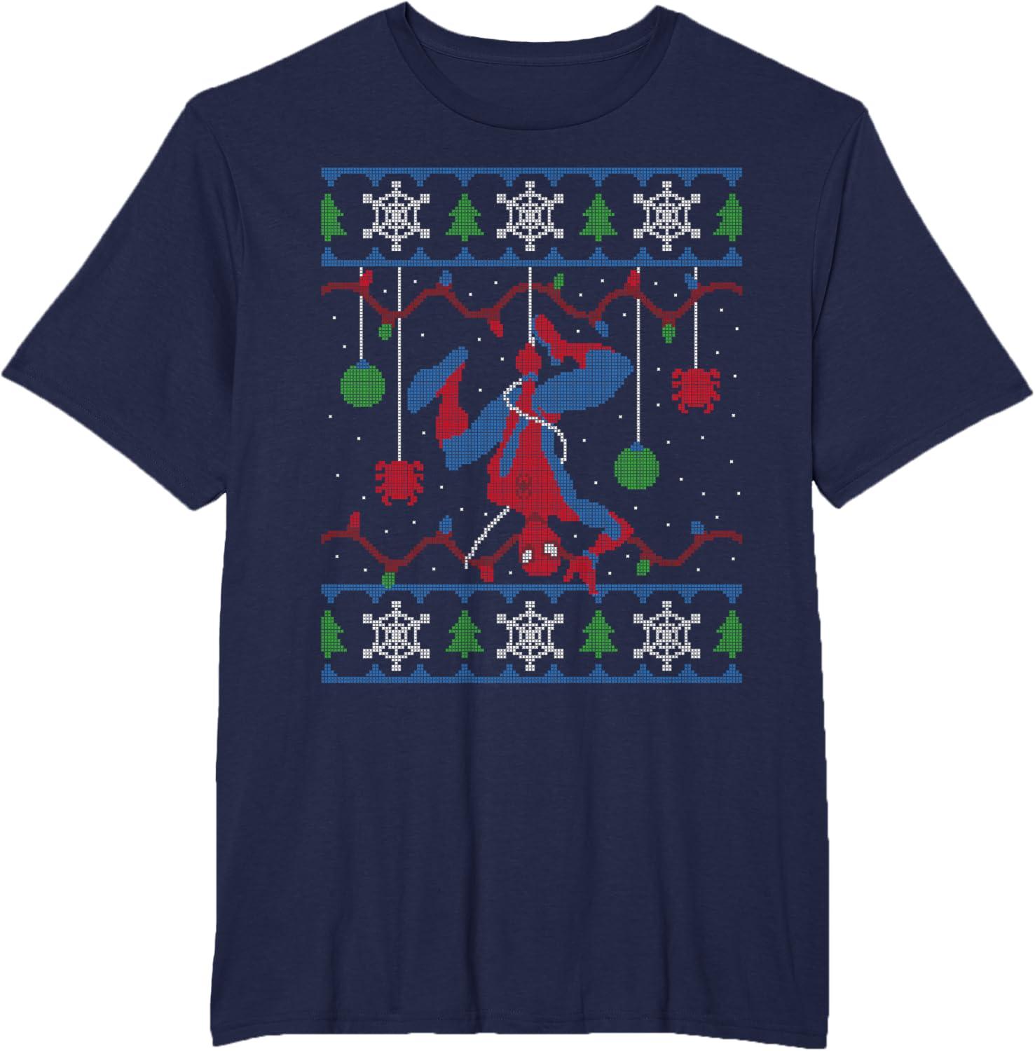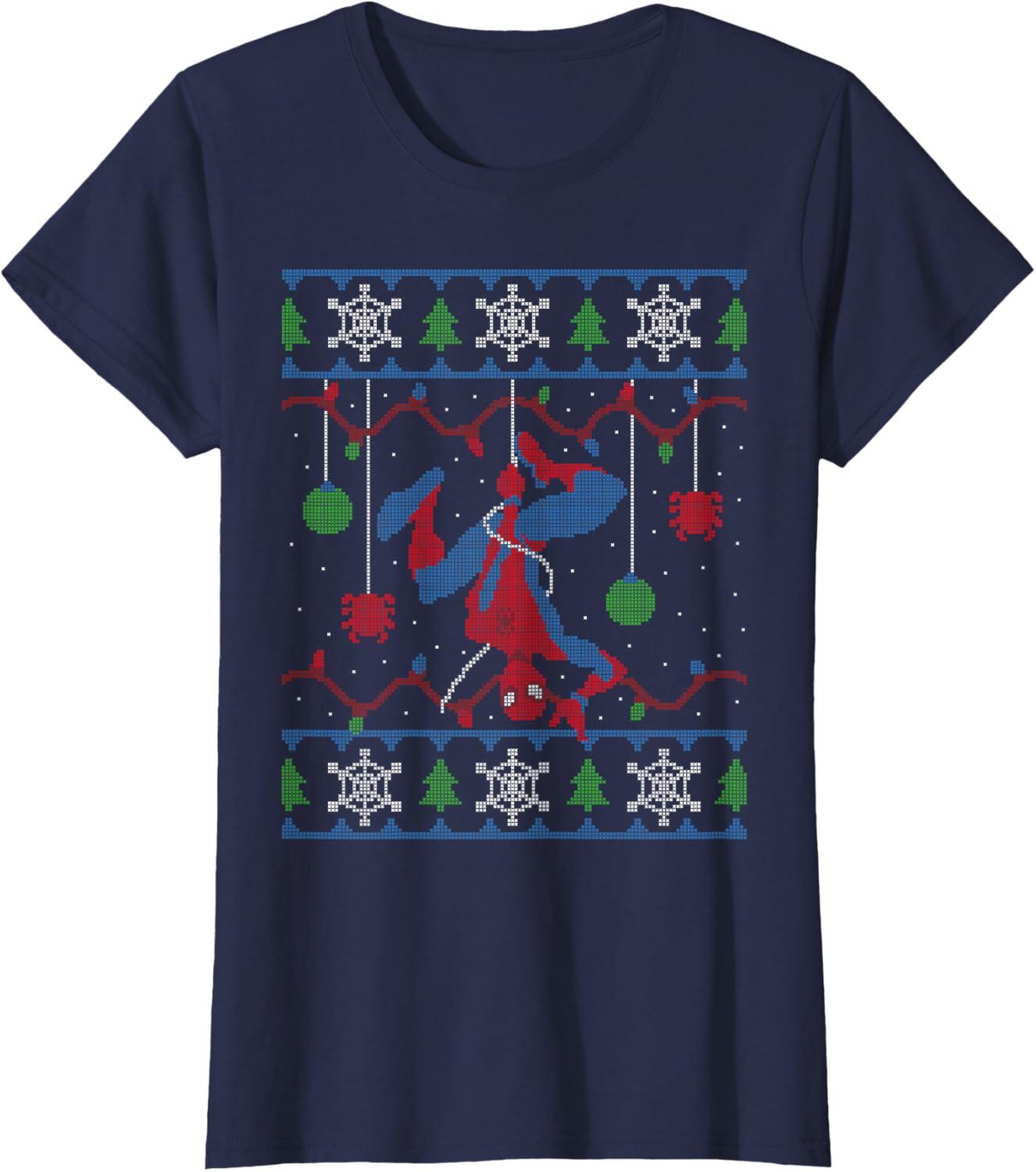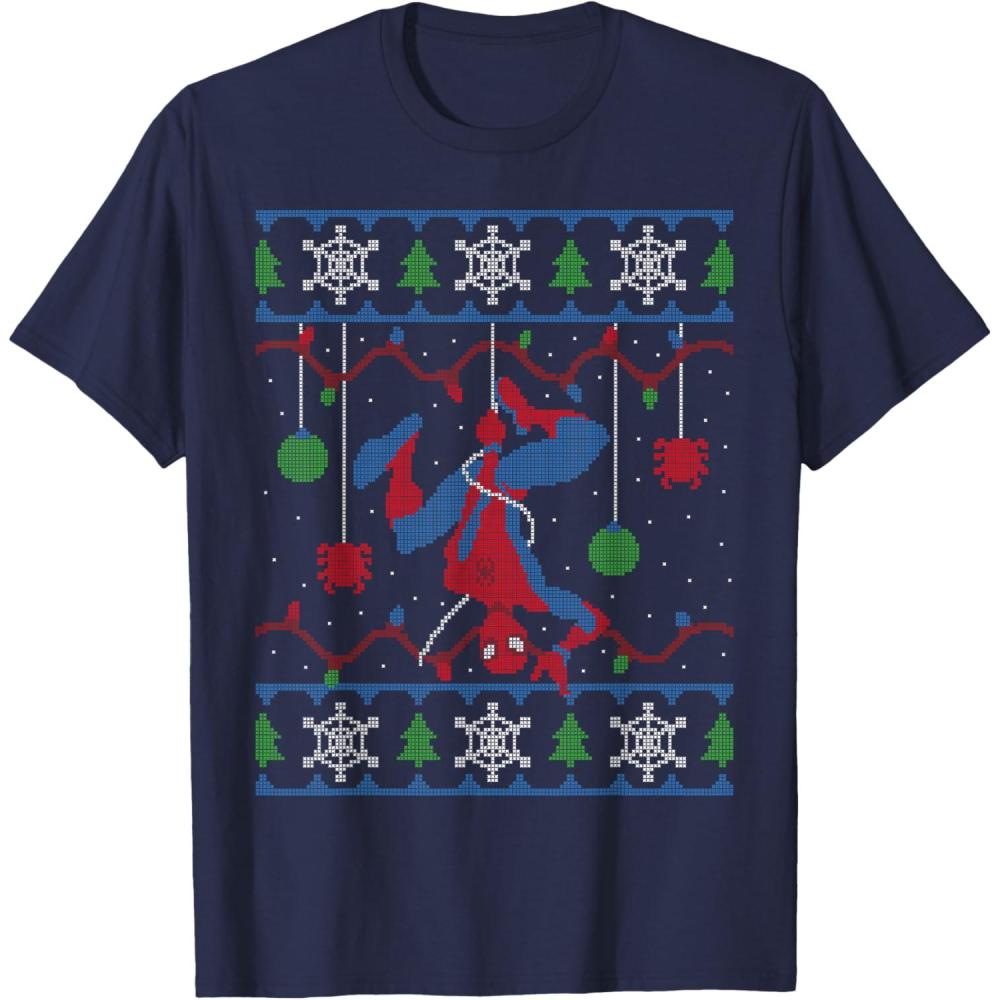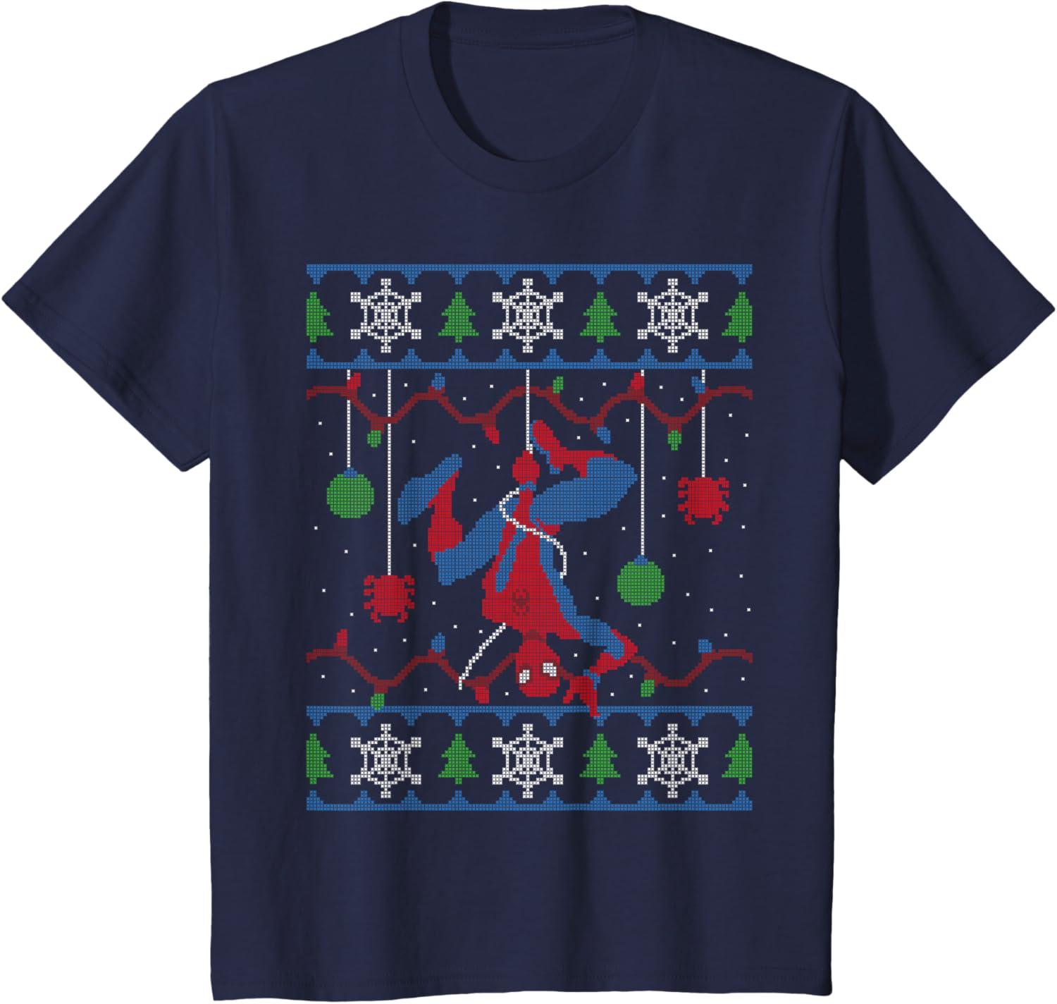 Swing in the holidays with Spidey on this fun and festive official ugly Christmas sweater style graphic tee or hoodie! Dangling upside-down from his web-line and giving a friendly neighborhood wave, Peter Parker as Spider-Man – web-slinging, wall-crawling super hero star of Marvel comics, animation, and movies – is accompanied by Christmas lights, snowflakes, trees, ornaments, and Spider-symbols. A great Christmas or holiday gift for a Spider-Man or Marvel fan! Available in youth and adult sizes. Find it in a t-shirt, premium t-shirt, tank top, v-neck, long sleeve tee, hoodie, and sweatshirt.