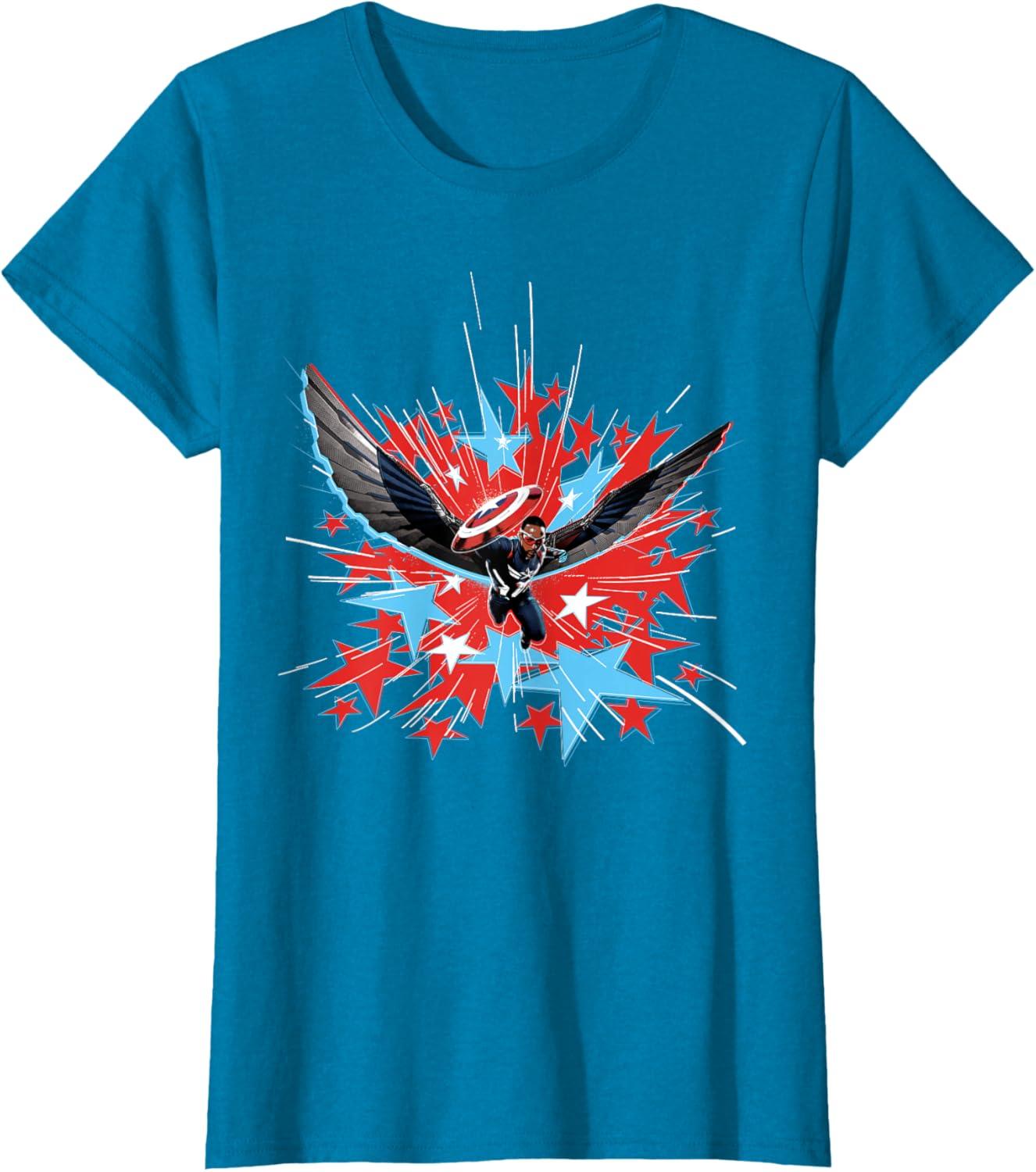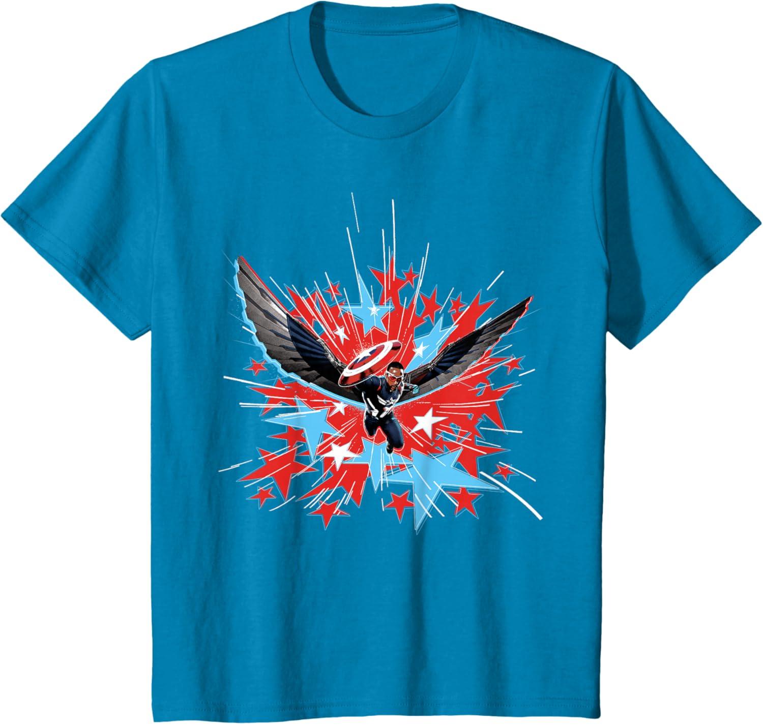 The new Captain America blasts into battle with a burst of patriotic red, white, and blue stars on this full-color official tee or hoodie from Marvel Studios’ blockbuster movie “Captain America: Brave New World”. The high-flying Sam Wilson takes up the mantle of Captain America in the thrilling and action-packed new adventure in the Marvel Cinematic Universe – look for the Joaquin Torres Falcon T-shirt design and get multiples for matching with friends and family on your trip to Avengers Campus at Disney California Adventure Park or any super destination! A great gift for a Marvel Super Heroes, Avengers, Captain America, or MCU movie fan. Available in youth and adult sizes. Find it in a t-shirt, premium t-shirt, tank top, v-neck, long sleeve tee, hoodie, and sweatshirt.