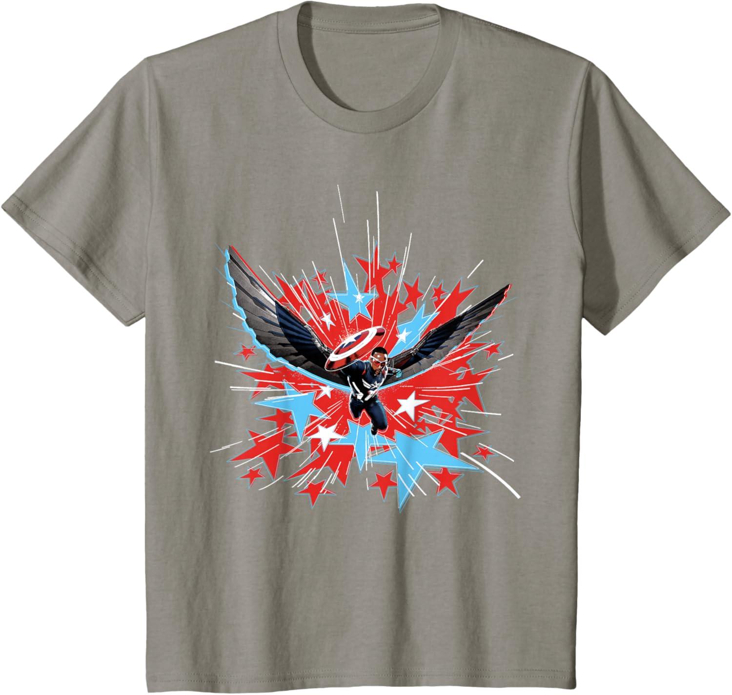 The new Captain America blasts into battle with a burst of patriotic red, white, and blue stars on this full-color official tee or hoodie from Marvel Studios’ blockbuster movie “Captain America: Brave New World”. The high-flying Sam Wilson takes up the mantle of Captain America in the thrilling and action-packed new adventure in the Marvel Cinematic Universe – look for the Joaquin Torres Falcon T-shirt design and get multiples for matching with friends and family on your trip to Avengers Campus at Disney California Adventure Park or any super destination! A great gift for a Marvel Super Heroes, Avengers, Captain America, or MCU movie fan. Available in youth and adult sizes. Find it in a t-shirt, premium t-shirt, tank top, v-neck, long sleeve tee, hoodie, and sweatshirt.